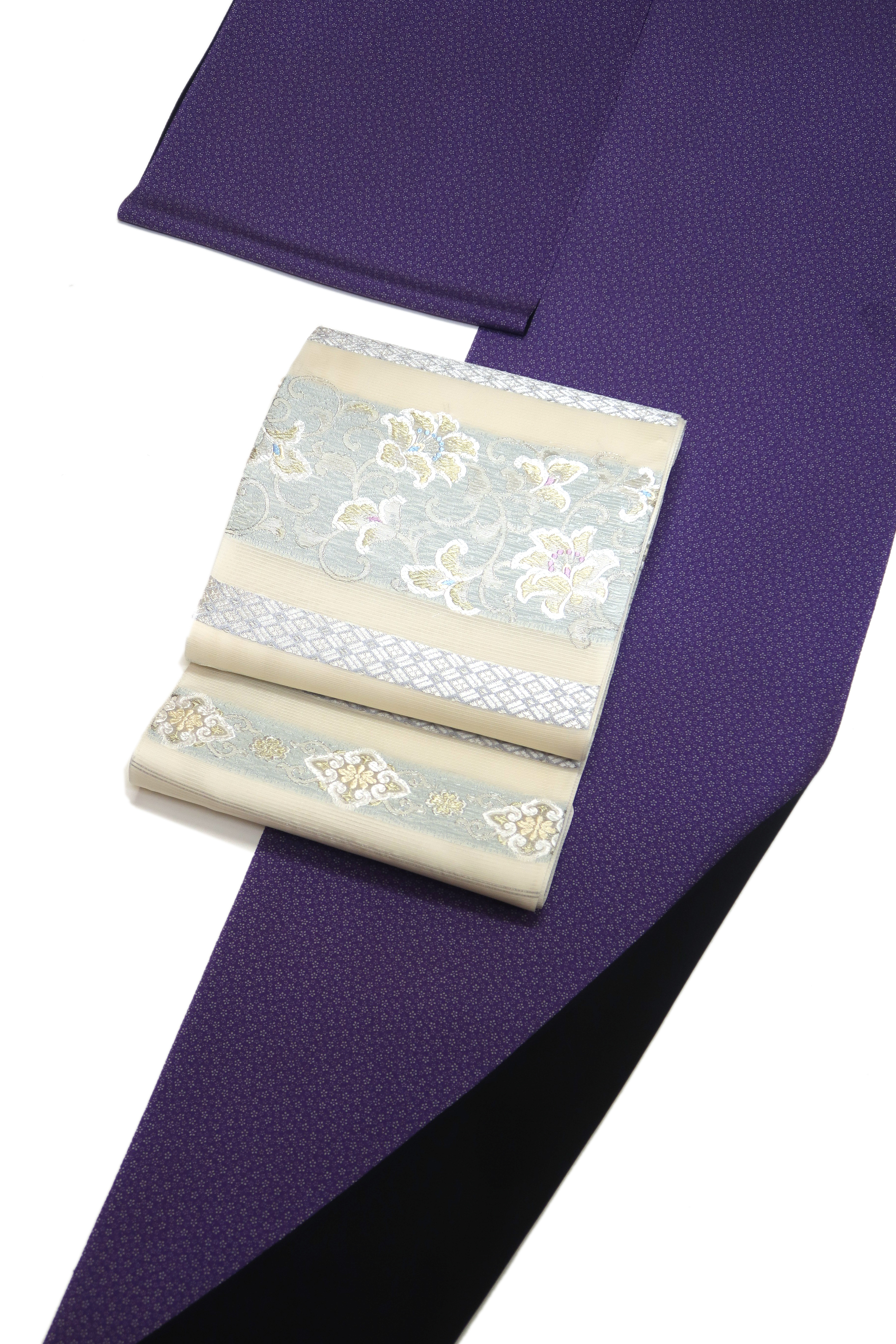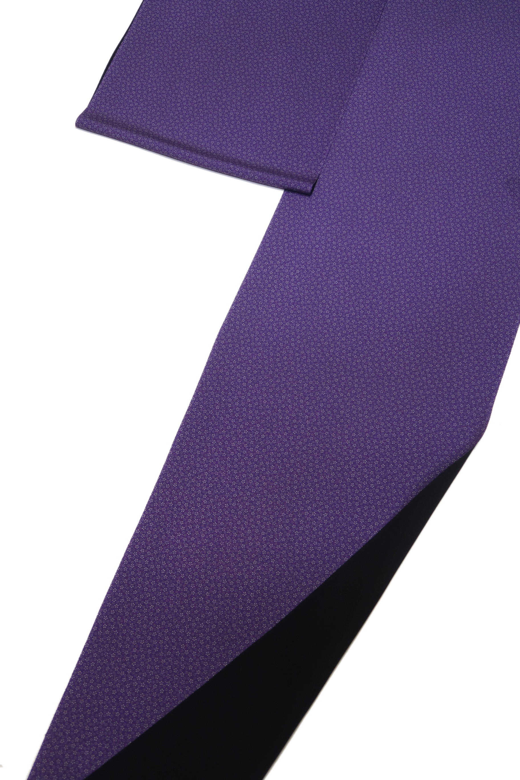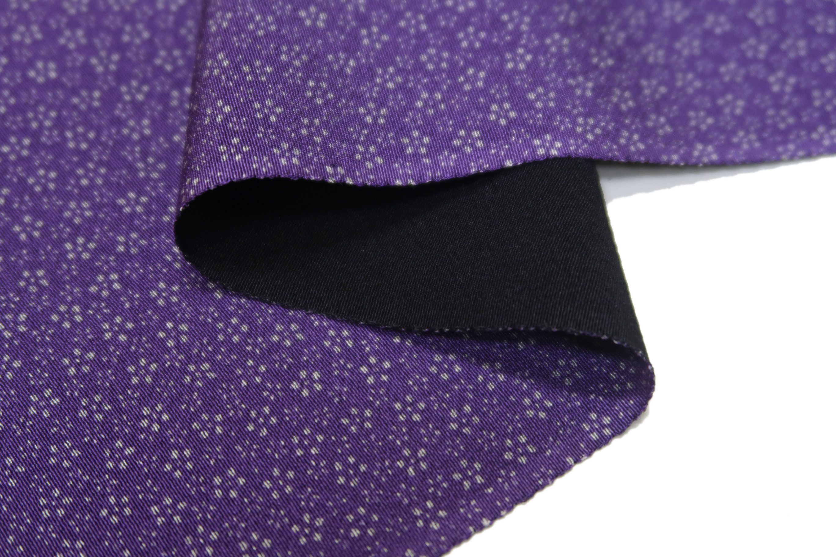 絹、綿、麻、化学繊維などの生地を染色して作られる着物、いわゆる「後染めの着物」は、表地のみを染める片面染めが主流ですが、裏地にも地色などを染める反物もあります。袷の着物なら裏地を付けて仕立てますので、裏面には色柄は必要ないと思われるかも知れません。しかし、実際には多くの江戸小紋などでも一色の無地などで裏面も染めてあります。それは、裏地を染めることによって表地の色柄に微妙な深みが出て、より鮮明な文様が表現できるからにほかなりません。武士の公服として発達した裃は、江戸時代後期には両面染めが現れます。袴の上着として着用した肩絹は、生地の裏側が見えるからだと思われます。つまり、肩絹には裏地は付けず単衣に仕立てますので、肩山を基点にした前側と後側になる表生地だけを染めたのでは、内側には色柄はなく、染める前の白い生地、もしくは無地の地色が見えることになるからです。特に表と同じ色柄の江戸小紋を染め上げる技術は難しく、表裏の柄がぴったり合わせなければなりません。それ以降、昭和初期まで同じ色柄で染める両面染めが少なからずありました(資料:染織辞典中江克己編)。その染色技法を現代に受け継ぎ再現したのが、この両面染めの江戸小紋です。生地の厚さ、わずか0.8~0.9mm程度の両面に色も柄も異なる図案が滲まず、干渉せず、見事に染め上げられました。