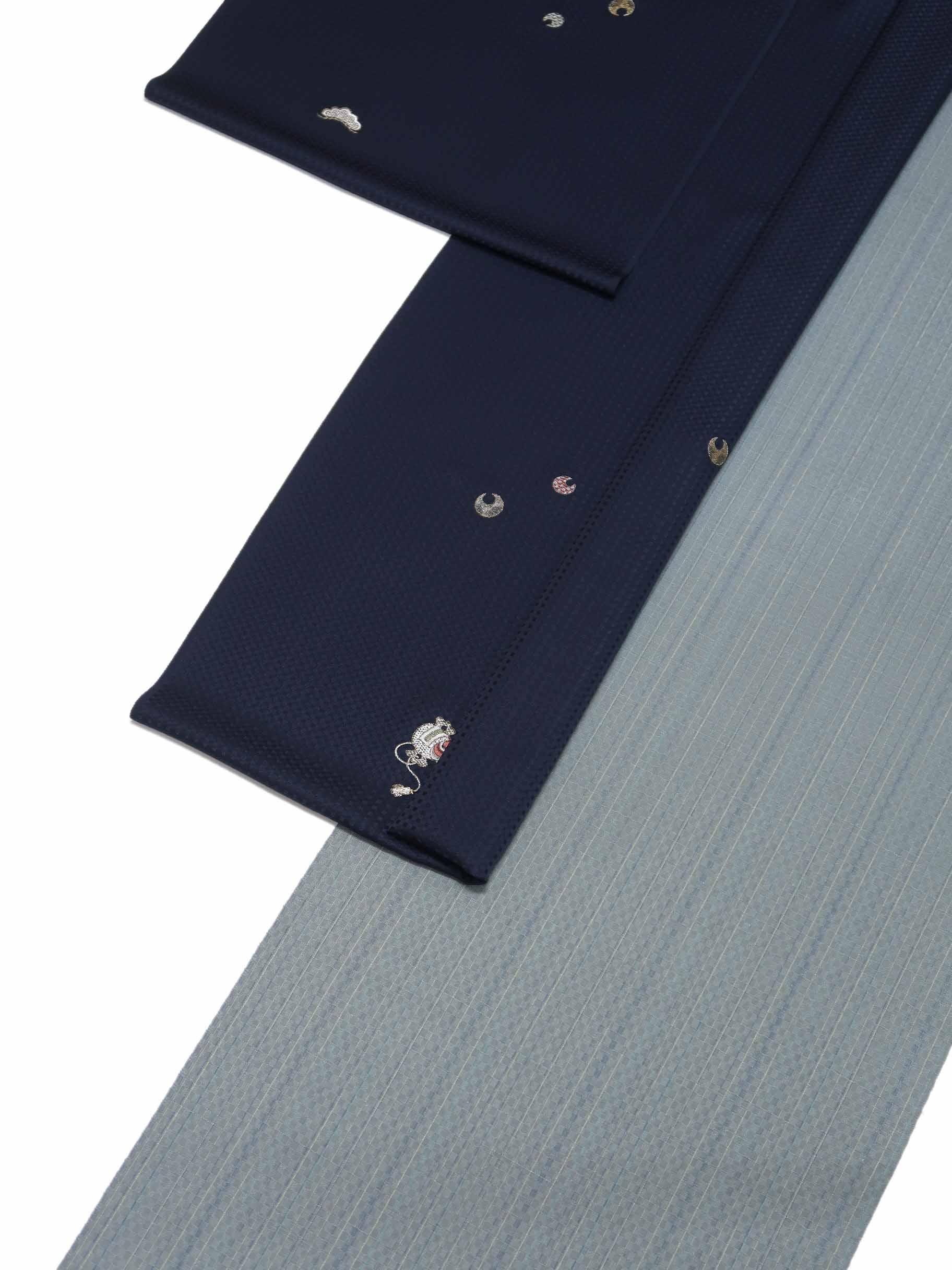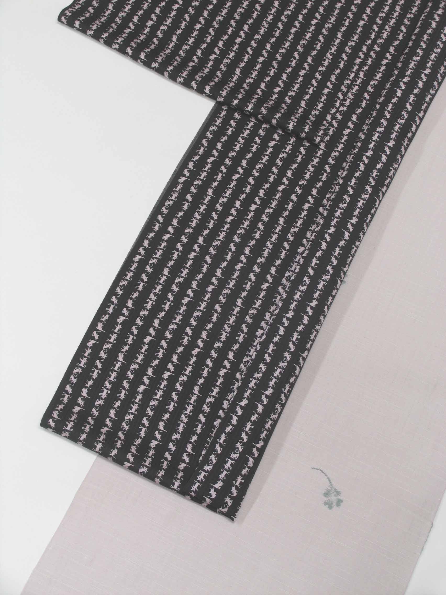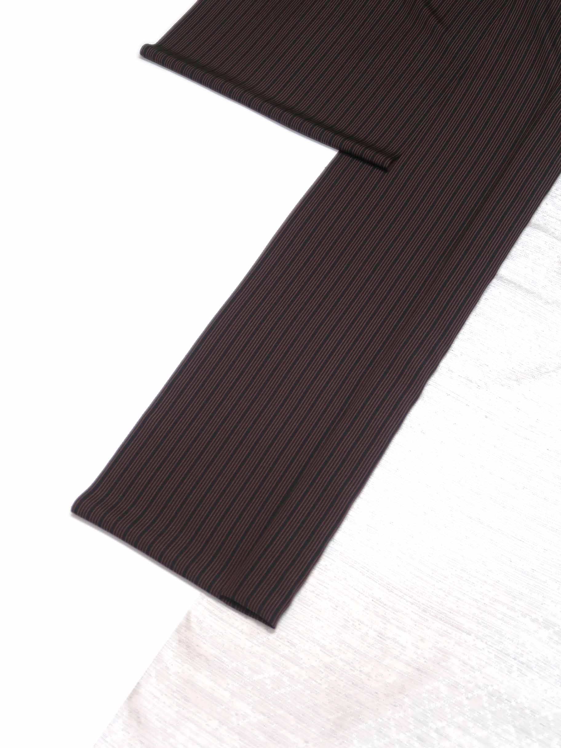 この着尺(きじゃく)は、京都西陣(にしじん)で織られた丈夫(じょうぶ)で精緻(せいち)な西陣織の紬(つむぎ)です。紬とは言っても紬糸(つむぎいと)は用いず、上質の絹練(けんれん)撚糸(ねんし)で織られていますので、現代の大島紬(おおしまつむぎ)のように「織(お)り節(ふし)」はありません。地味(じみ)で控(ひか)えめな色調ながらも優(やさ)しさと豪華(ごうか)さとが味わえます。結婚式などの式典には着られませんが、帯や羽織(はおり)の組み合わせを楽しみながら普段着(ふだんぎ)や街着(まちぎ)としてセンスの見せ所です。