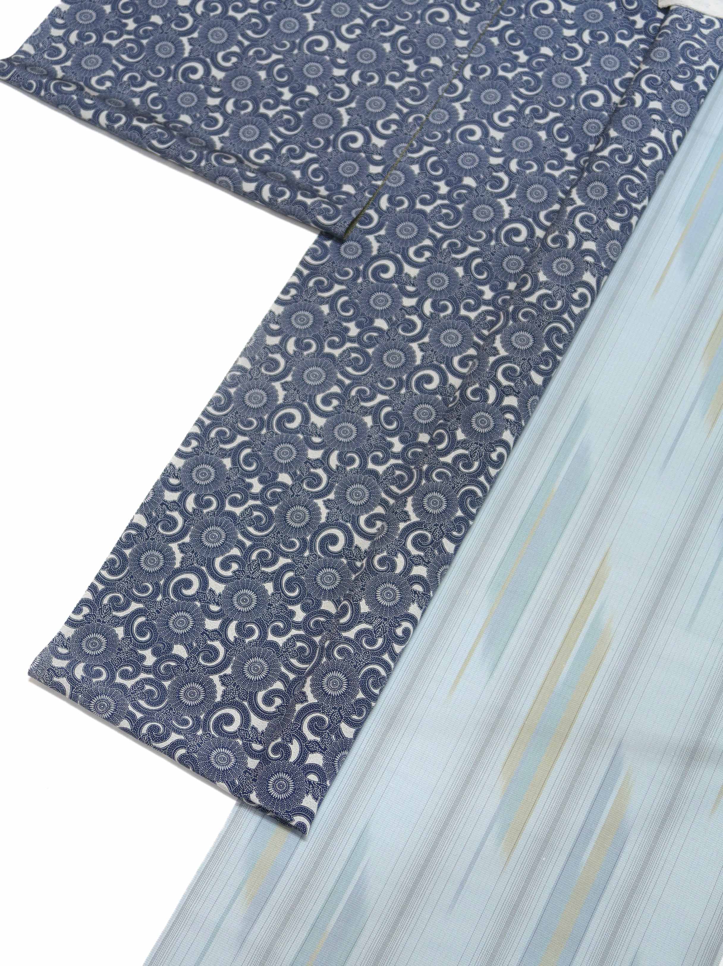ここでは、気楽に着られる四寸帯(半幅帯)とすっきり小粋な江戸小紋の羽織を合わせてみました。