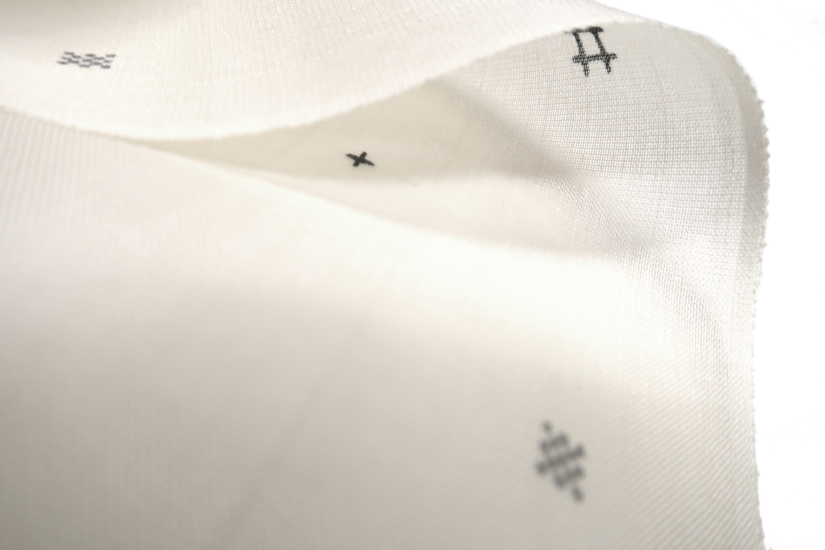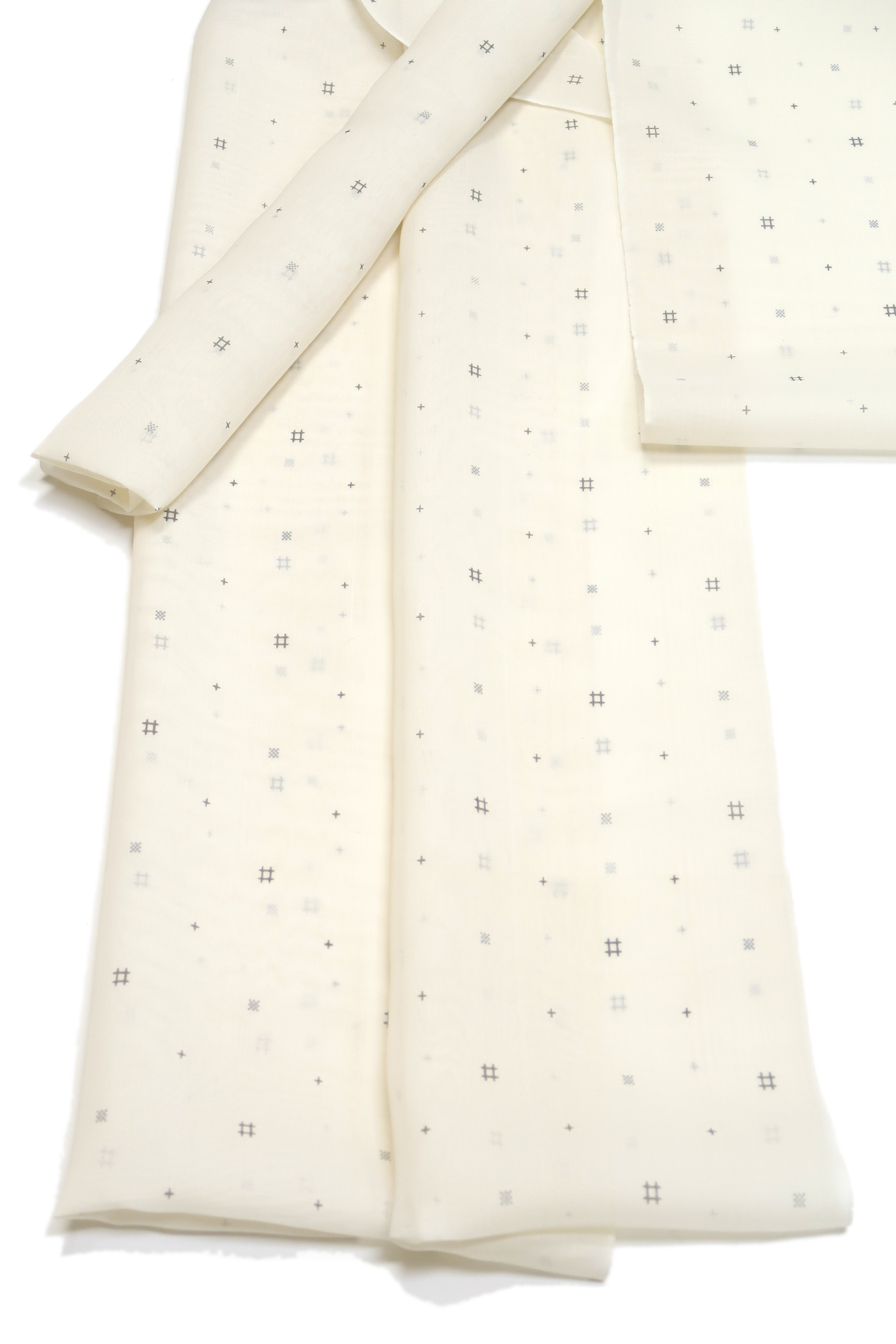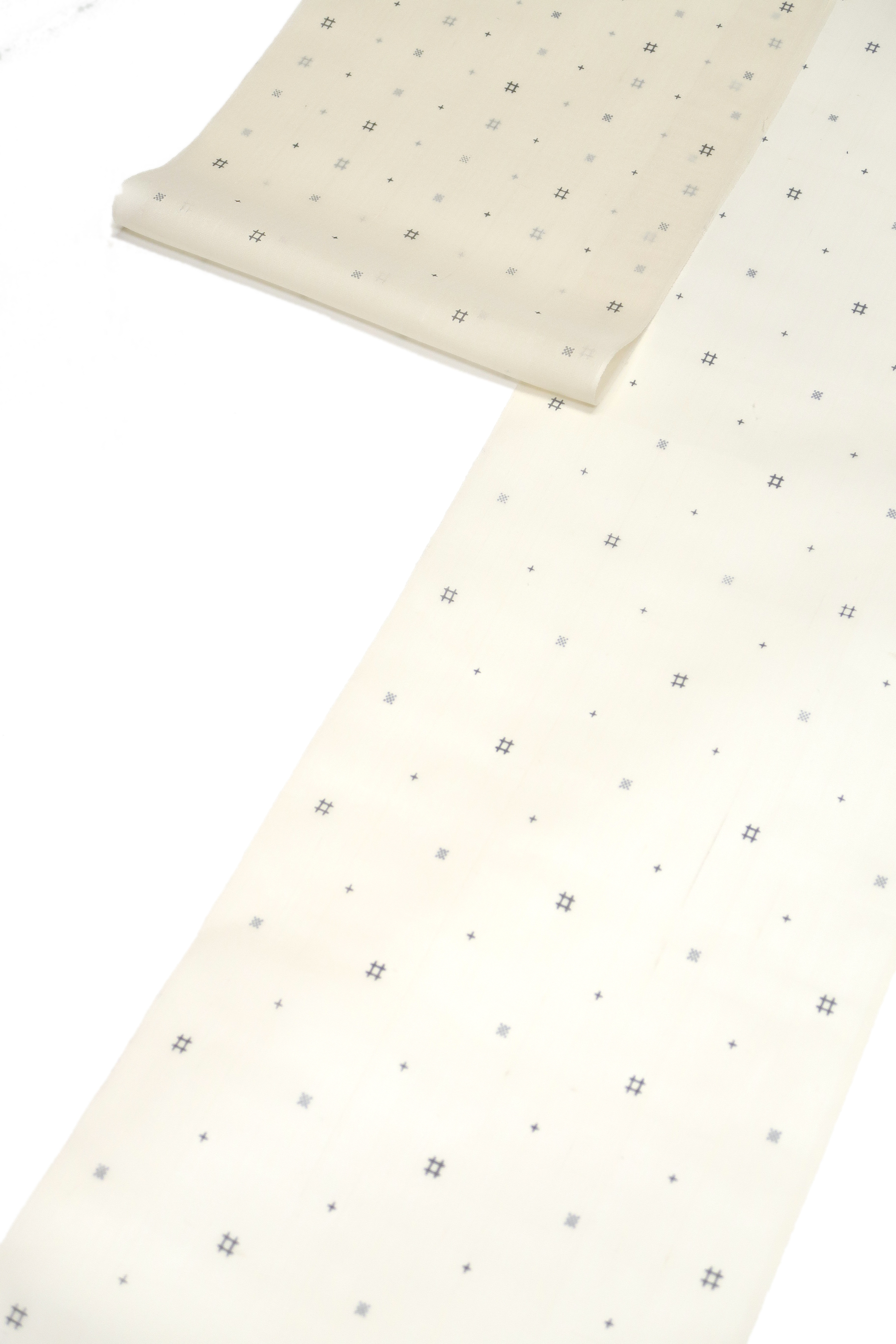 このきものは、緯糸に色柄を染めた絣糸を使って織られた緯双夏大島です。夏大島独特のお洒落な透け感と、軽くて、さばきの良い単衣のきものとしてご愛用いただけます。