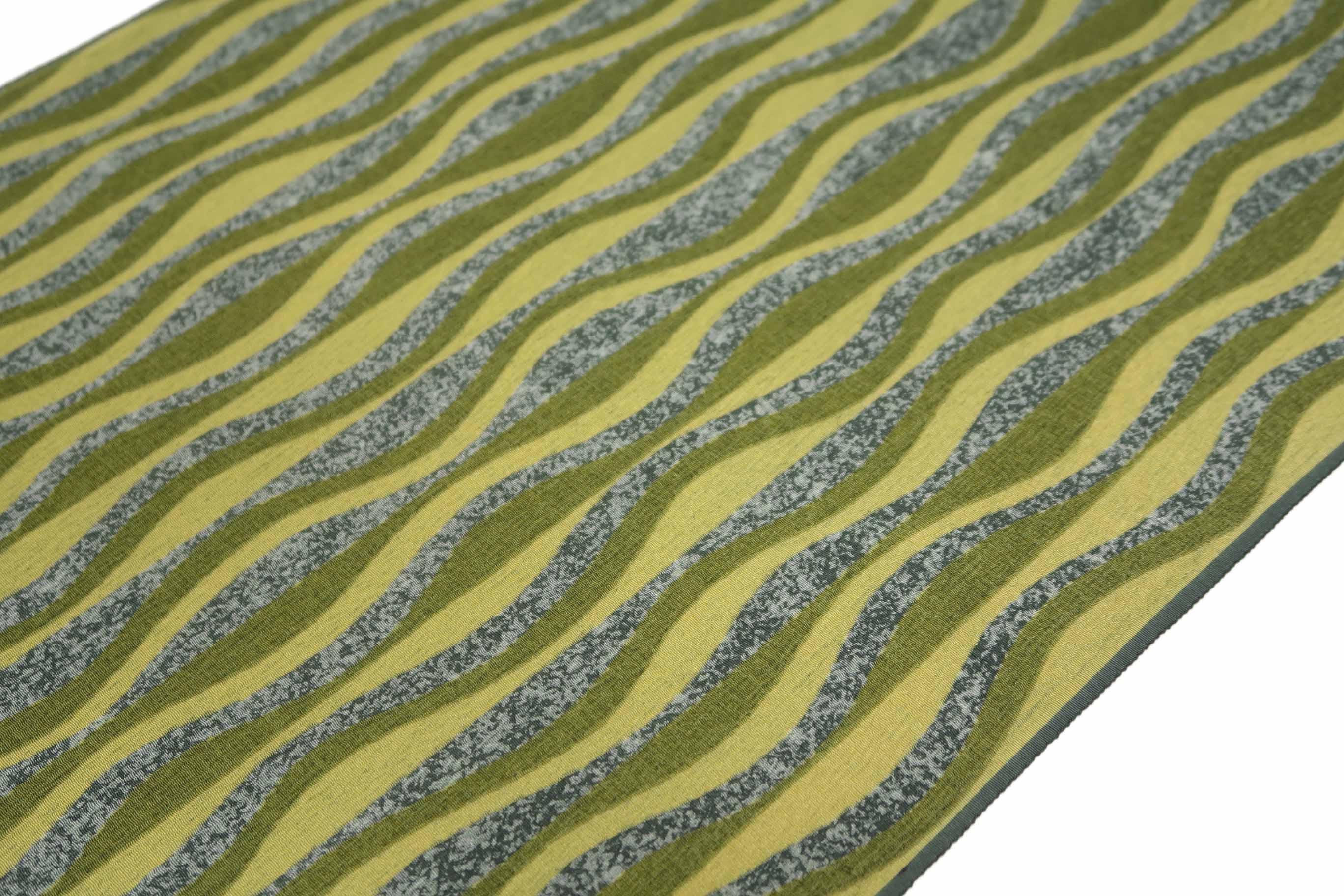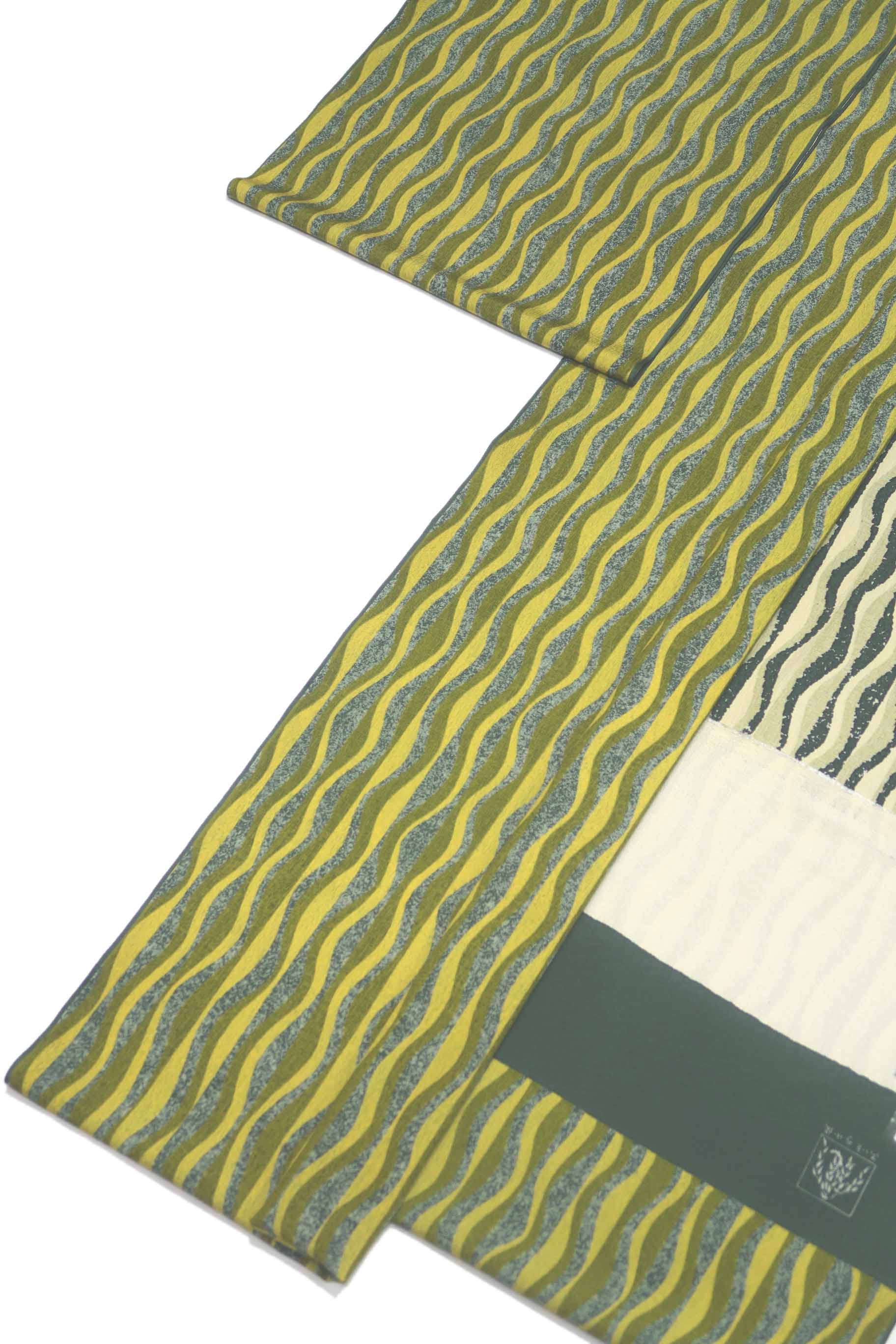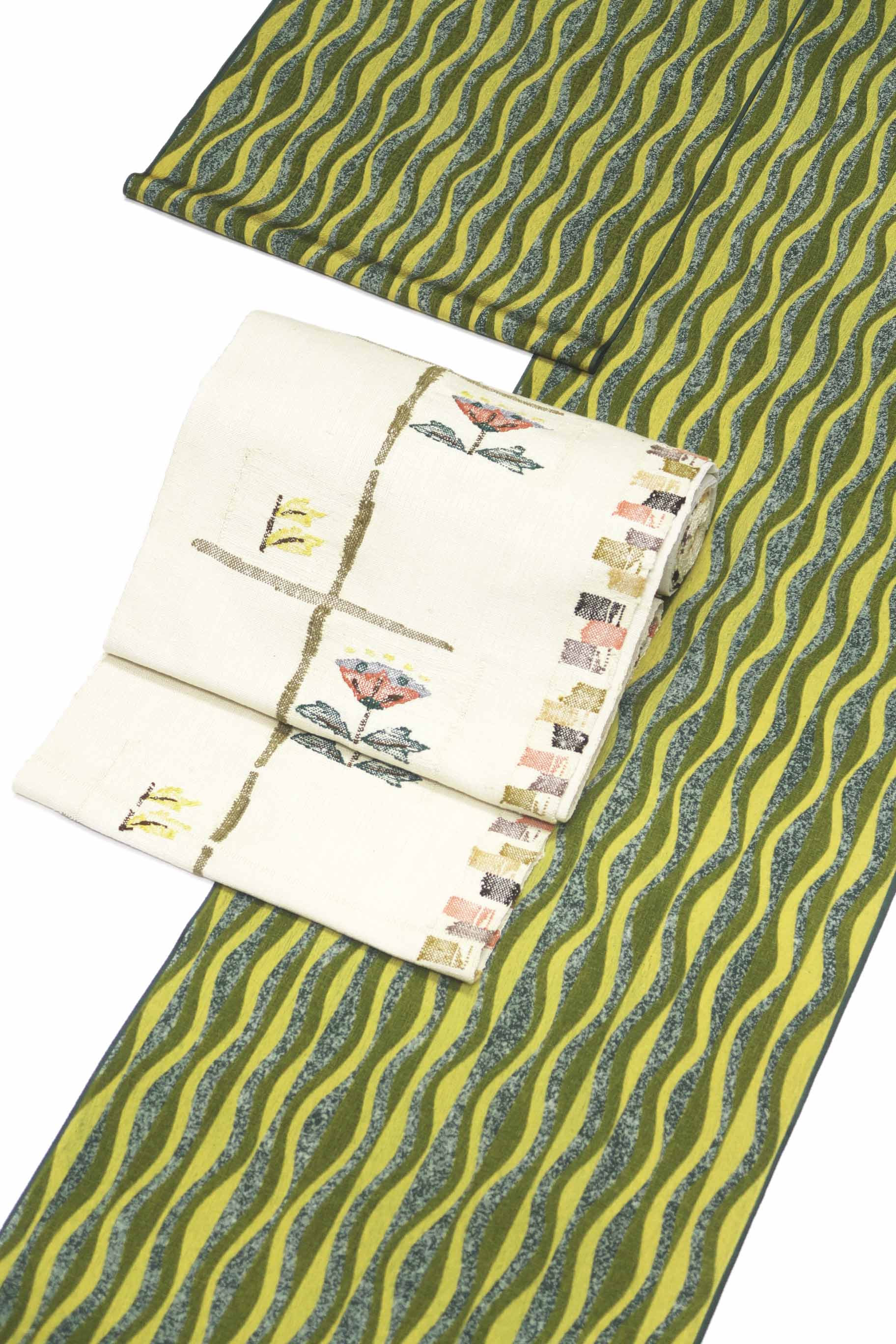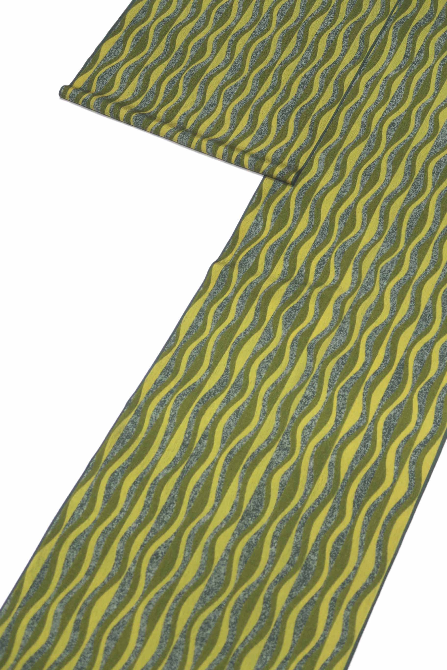着尺(きじゃく)とは、羽尺(はじゃく)に対する言葉で、きもの用の長着(ながぎ)、長羽織(ながばおり)、ロングコートに仕立てることができるほどの長尺(ちょうじゃく)があることを意味しています。従って、この着尺は、長着、長羽織、ロングコートにして着られます。長着にする場合、お洒落(しゃれ)用の白の袋帯を合わせてみましたが、八寸(はっすん)名古屋帯(なごやおび)でも九寸(きゅうすん)名古屋帯(なごやおび)でも無難(ぶなん)に合わせることができるでしょう。羽織にすれば、紬(つむぎ)や小紋(こもん)、色無地(いろむじ)やお召(め)しにも良く合います。