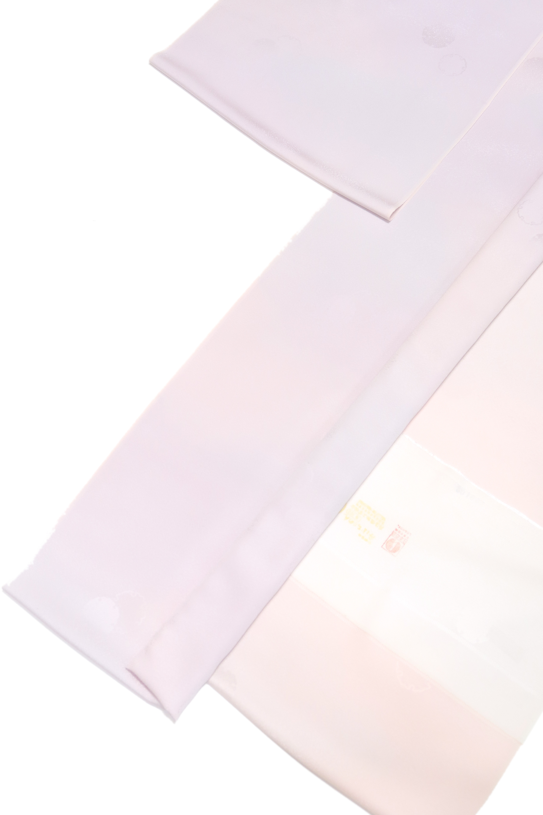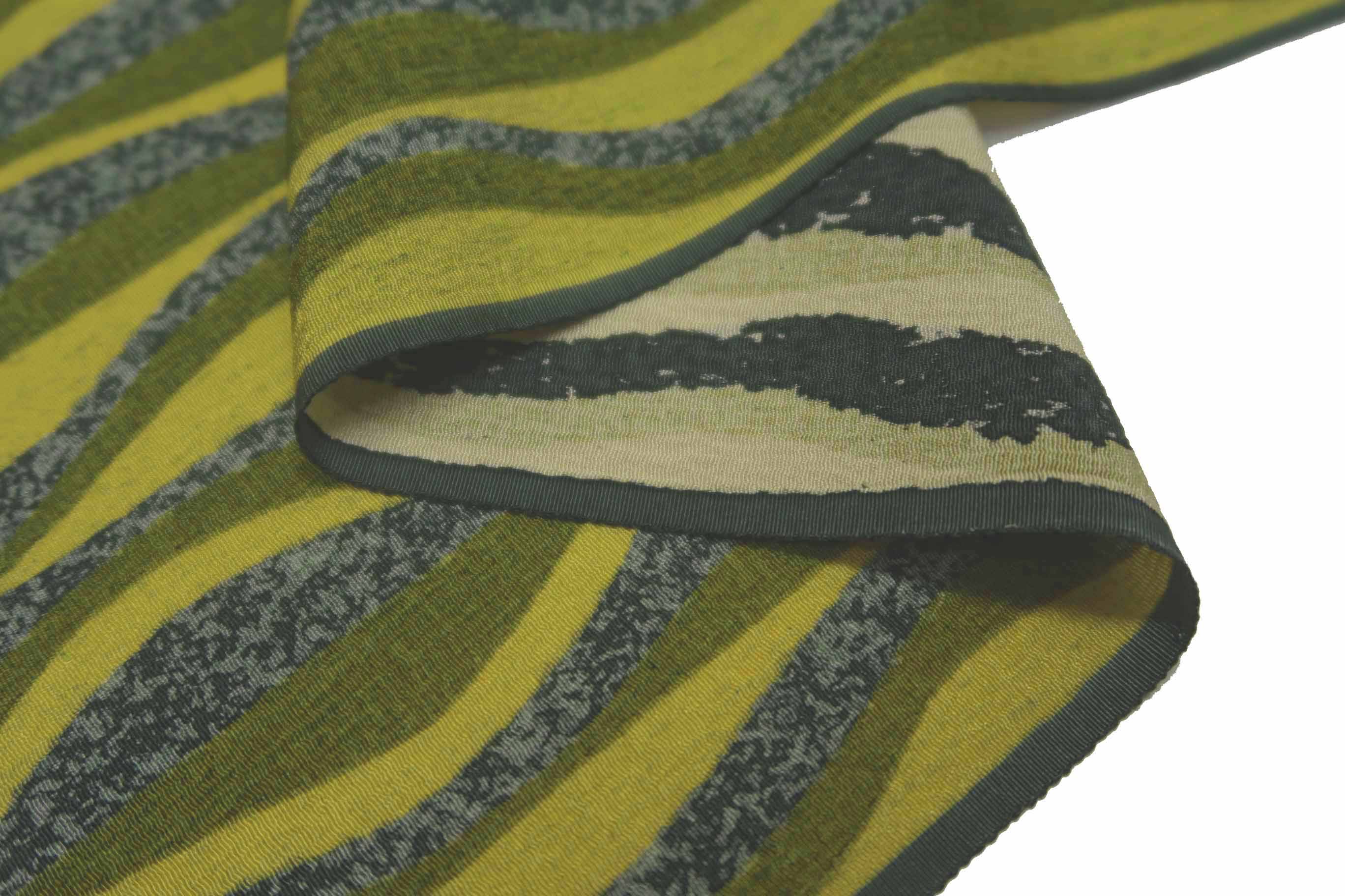 着尺(きじゃく)とは、羽尺(はじゃく)に対する言葉で、きもの用の長着(ながぎ)、長羽織(ながばおり)、ロングコートに仕立てることができるほどの長尺(ちょうじゃく)があることを意味しています。従って、この着尺は、長着、長羽織、ロングコートにして着られます。長着にする場合、礼装向(れいそうむ)きの名物裂(めいぶつぎれ)の袋帯を合わせてみましたが、八寸(はっすん)名古屋帯(なごやおび)でも九寸(きゅうすん)名古屋帯(なごやおび)でも無難(ぶなん)に合わせることができるでしょう。羽織にすれば、紬(つむぎ)や小紋(こもん)、色無地(いろむじ)やお召(め)しにも良く合います。