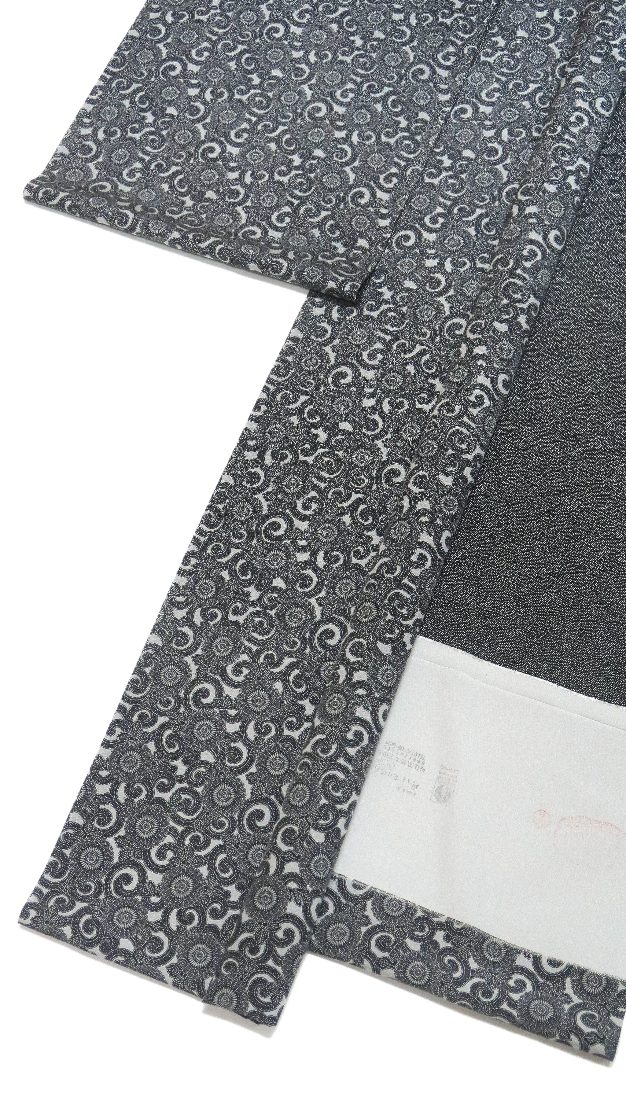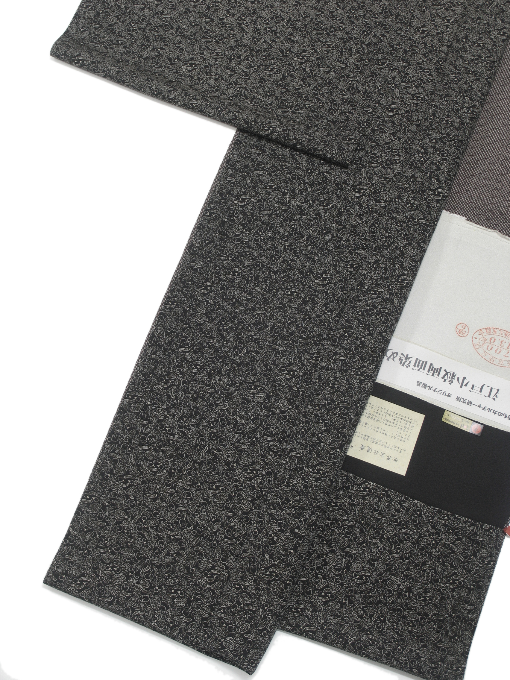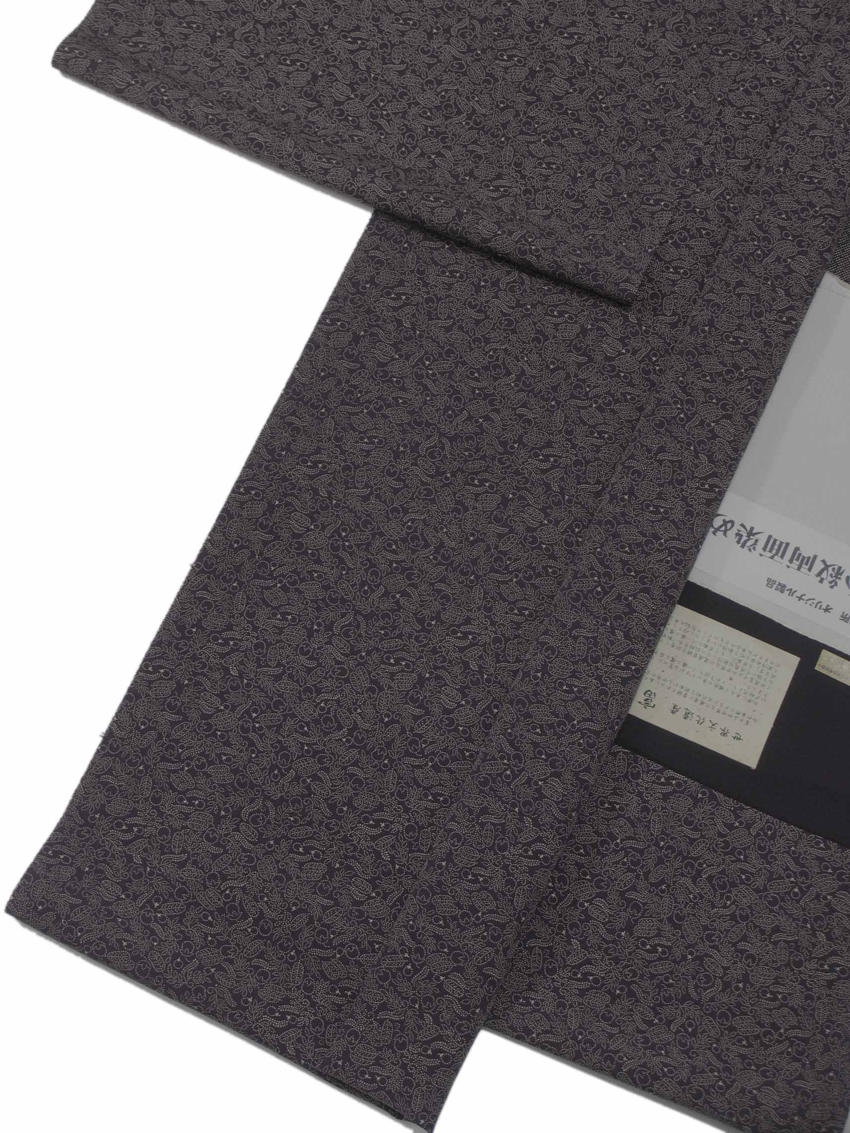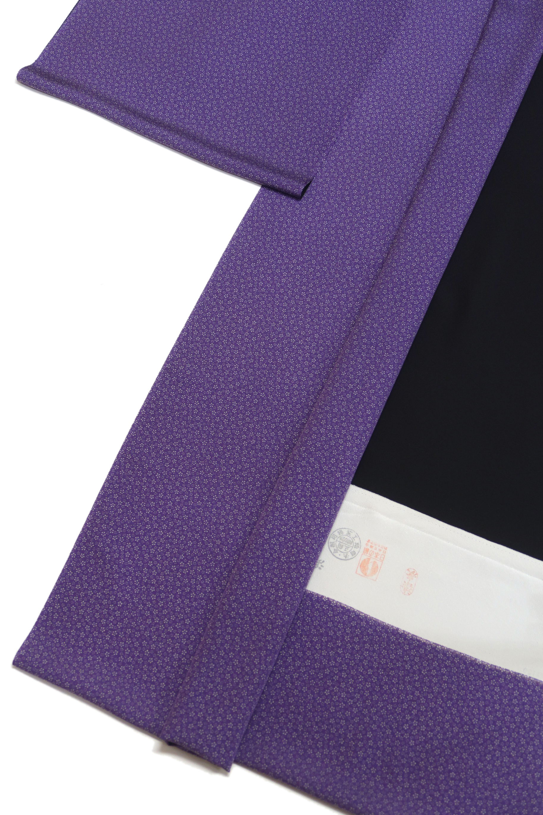 絹、綿、麻、化学繊維などの生地を染色して作られる着物、いわゆる「後染めの着物」は、表地のみを染める片面染めが主流ですが、裏地にも地色などを染める反物もあります。袷の着物なら裏地を付けて仕立てますので、裏面には色柄は必要ないと思われるかも知れません。しかし、実際には多くの江戸小紋などでも一色の無地などで裏面も染めてあります。それは、裏地を染めることによって表地の色柄に微妙な深みが出て、より鮮明な文様が表現できるからにほかなりません。武士の公服として発達した裃は、江戸時代後期には両面染めが現れます。袴の上着として着用した肩絹は、生地の裏側が見えるからだと思われます。つまり、肩絹には裏地は付けず単衣に仕立てますので、肩山を基点にした前側と後側になる表生地だけを染めたのでは、内側には色柄はなく、染める前の白い生地、もしくは無地の地色が見えることになるからです。特に表と同じ色柄の江戸小紋を染め上げる技術は難しく、表裏の柄がぴったり合わせなければなりません。それ以降、昭和初期まで同じ色柄で染める両面染めが少なからずありました(資料:染織辞典中江克己編)。その染色技法を現代に受け継ぎ再現したのが、この両面染めの江戸小紋です。生地の厚さ、わずか0.8~0.9mm程度の両面に色も柄も異なる図案が滲まず、干渉せず、見事に染め上げられました。