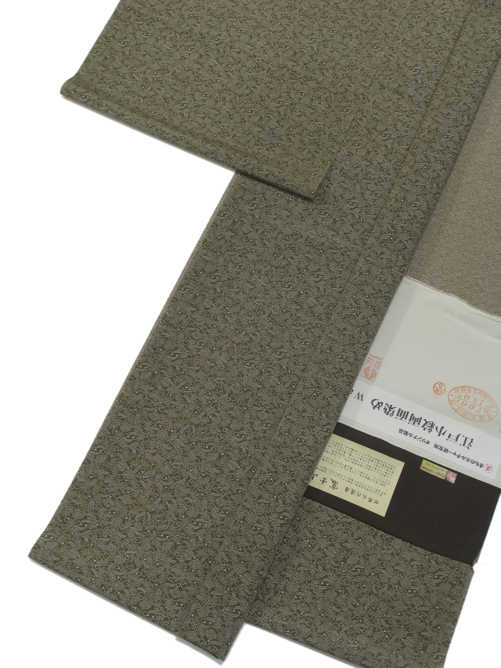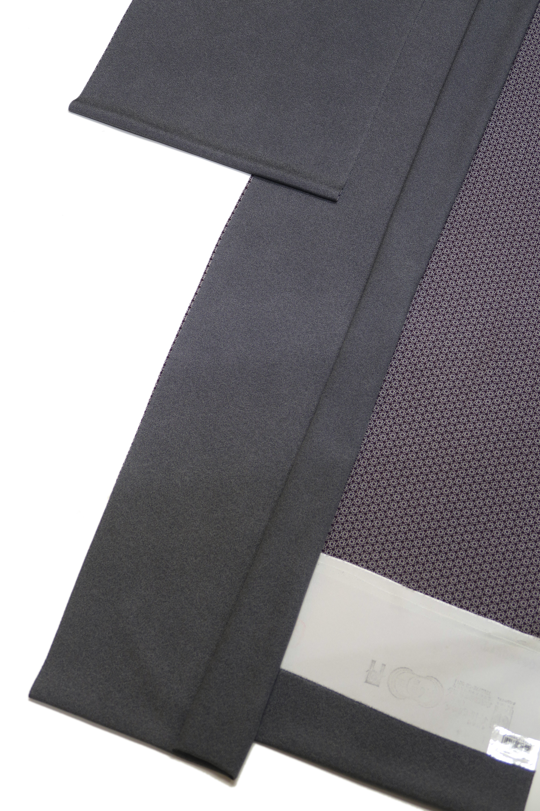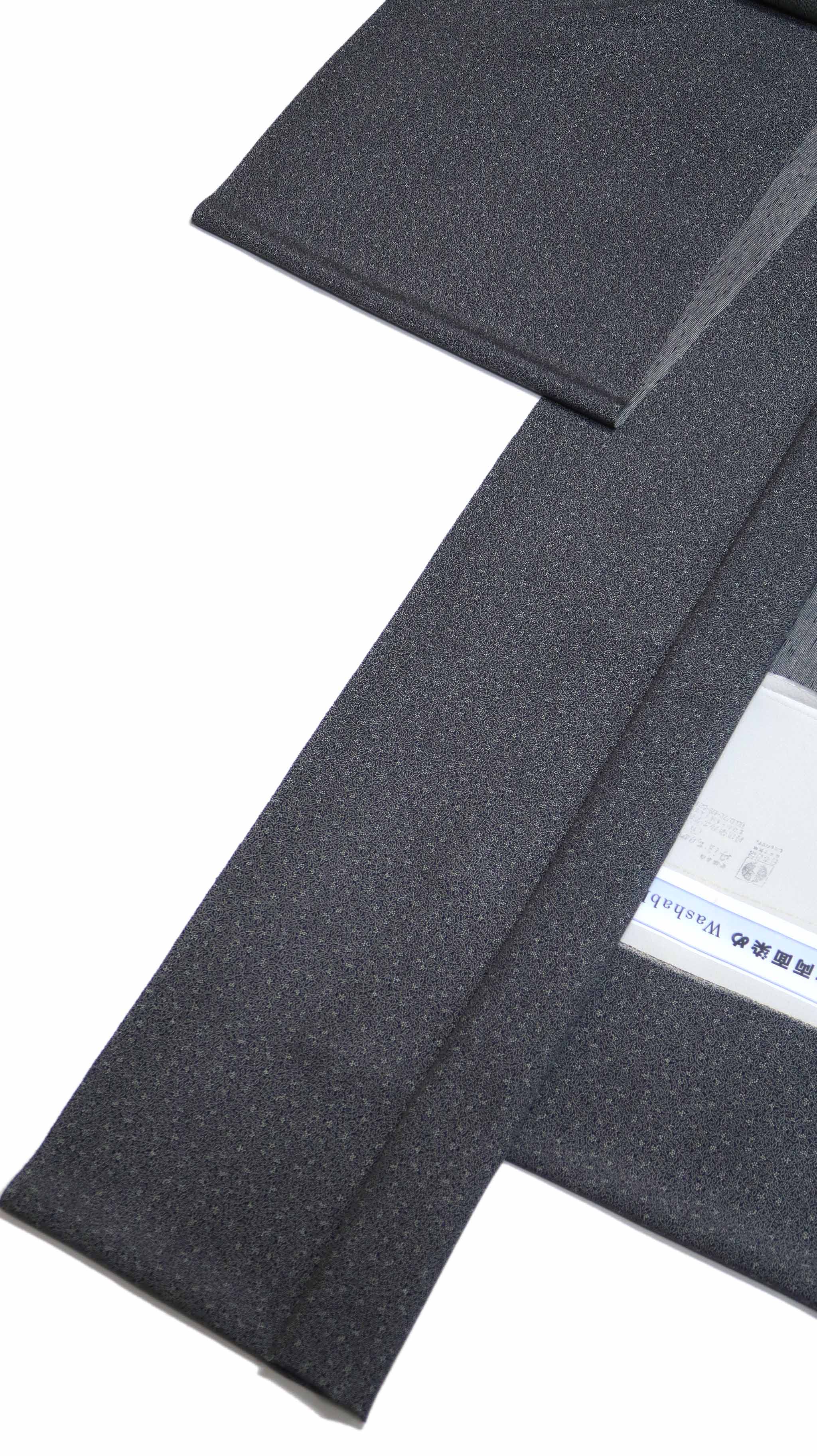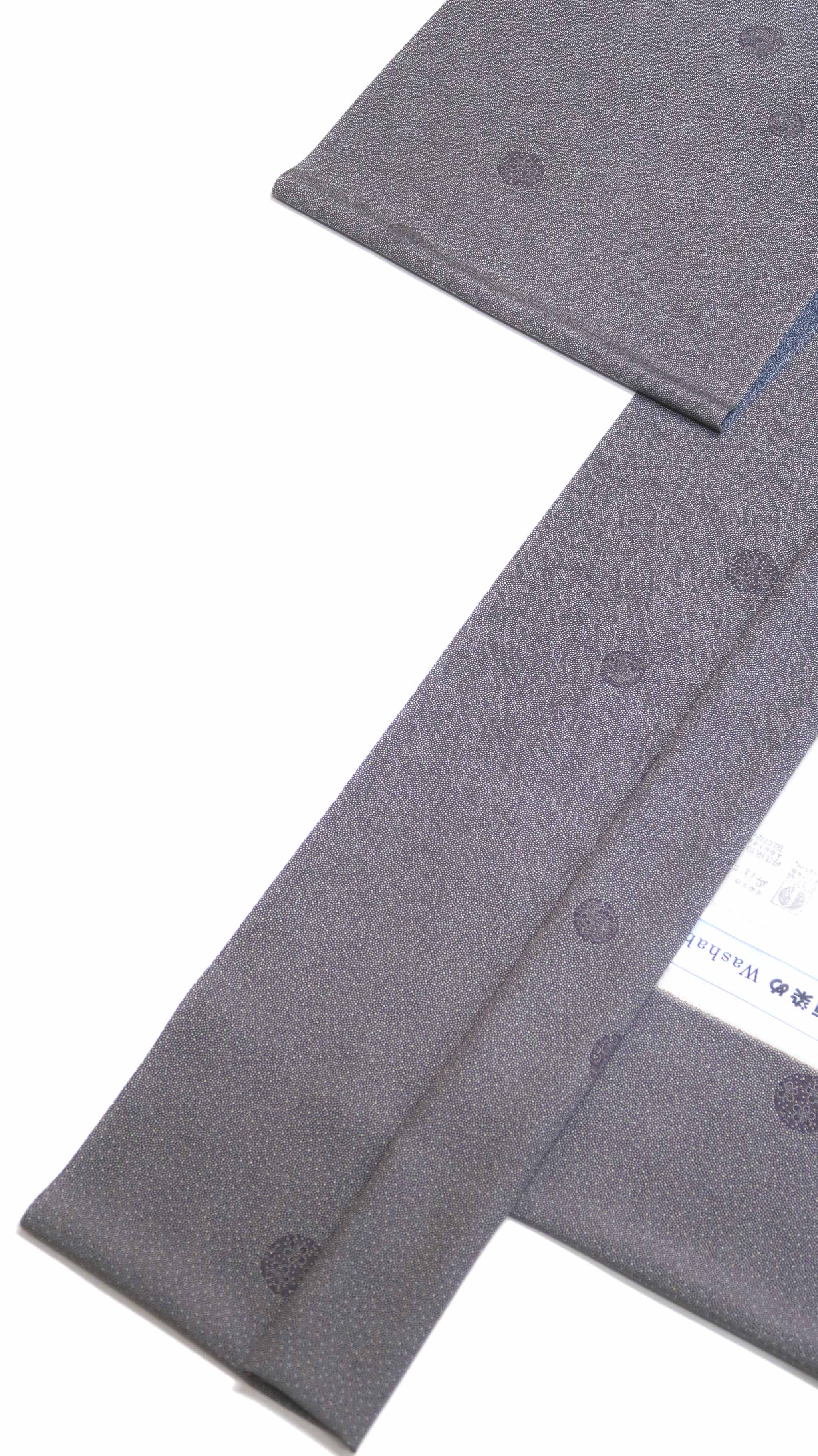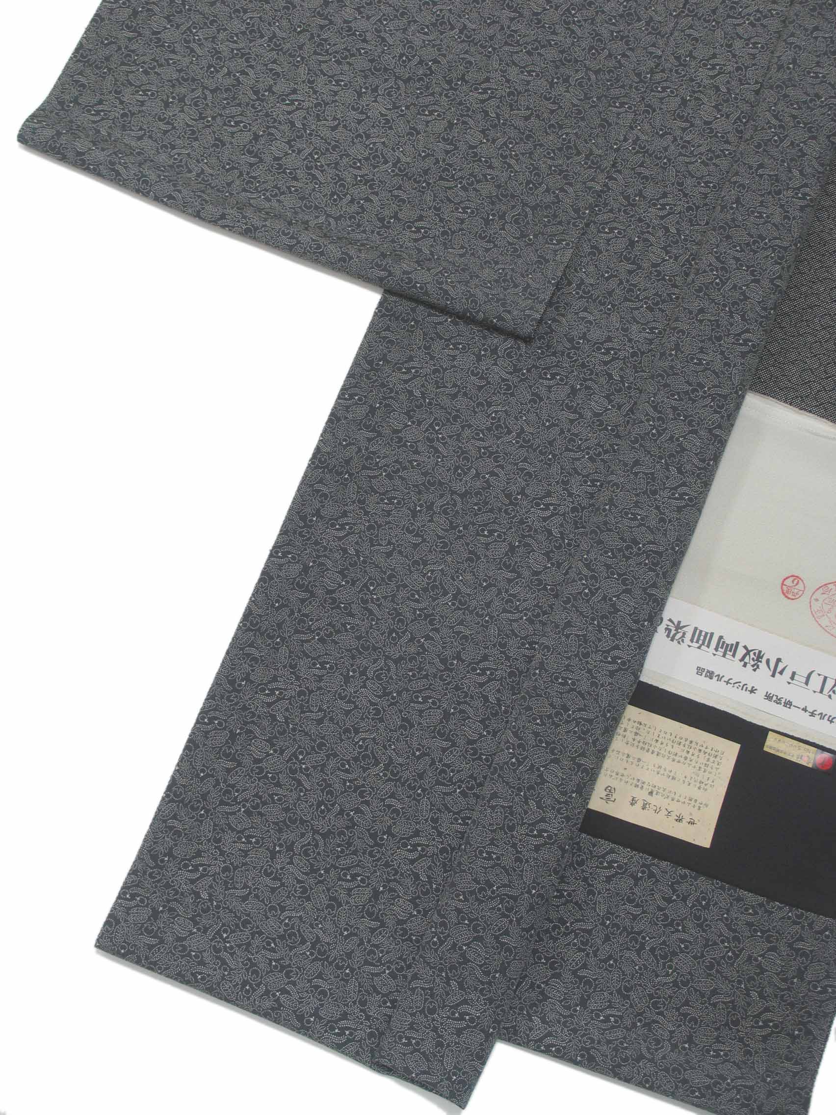 絹、綿、麻、化学繊維などの生地を染色して作られる着物、いわゆる「後染めの着物」は、表地のみを染める片面染めが主流ですが、裏地にも地色などを染める反物もあります。袷の着物なら裏地を付けて仕立てますので、裏面には色柄は必要ないと思われるかも知れません。しかし、実際には多くの江戸小紋などでも一色の無地などで裏面も染めてあります。それは、裏地を染めることによって表地の色柄に微妙な深みが出て、より鮮明な文様が表現できるからにほかなりません。武士の公服として発達した裃は、江戸時代後期には両面染めが現れます。袴の上着として着用した肩絹は、生地の裏側が見えるからだと思われます。つまり、肩絹には裏地は付けず単衣に仕立てますので、肩山を基点にした前側と後側になる表生地だけを染めたのでは、内側には色柄はなく、染める前の白い生地、もしくは無地の地色が見えることになるからです。特に表と同じ色柄の江戸小紋を染め上げる技術は難しく、表裏の柄がぴったり合わせなければなりません。それ以降、昭和初期まで同じ色柄で染める両面染めが少なからずありました(資料:染織辞典中江克己編)。その染色技法を現代に受け継ぎ再現したのが、この両面染めの江戸小紋です。生地の厚さ、わずか0.8~0.9mm程度の両面に色も柄も異なる図案が滲まず、干渉せず、見事に染め上げられました。