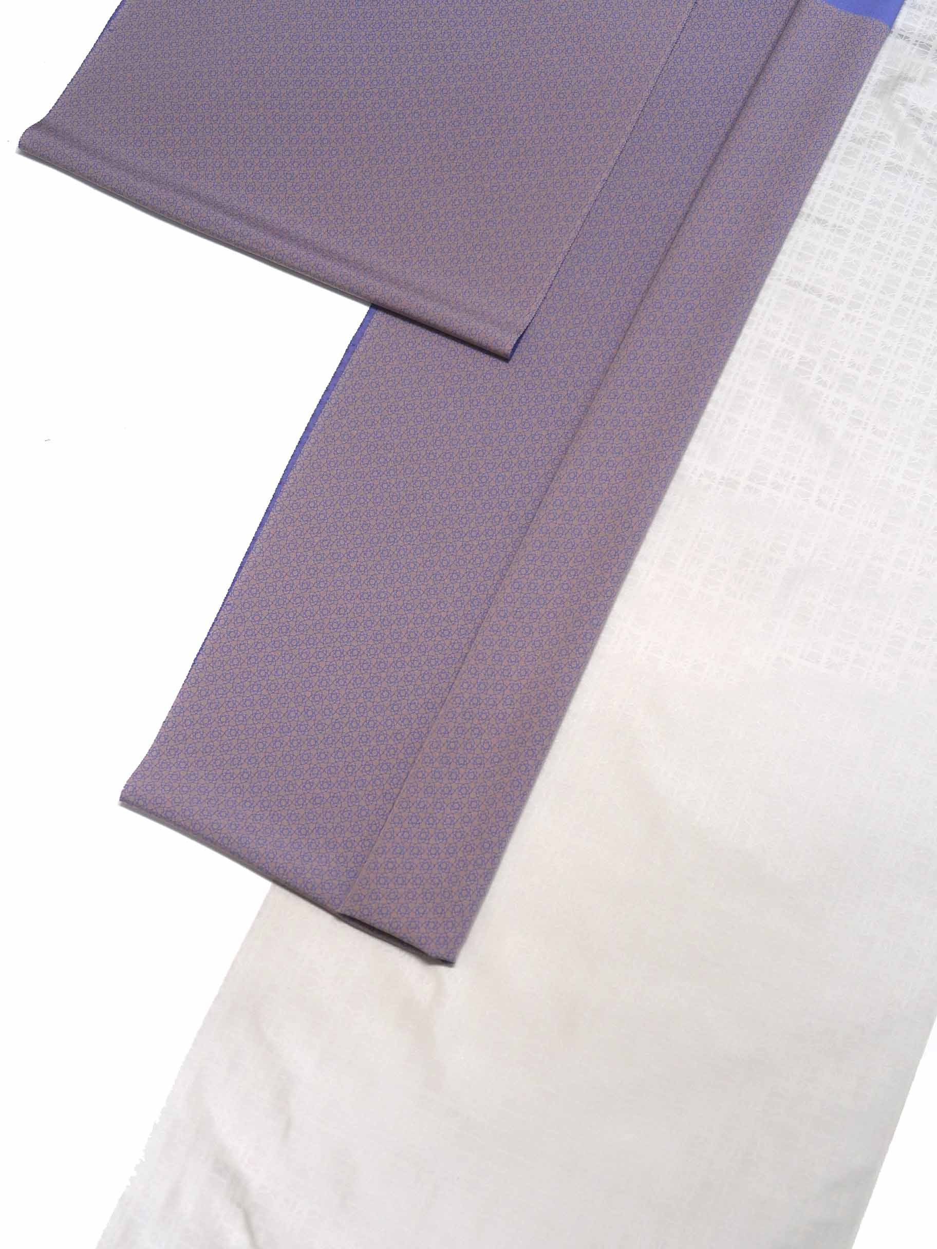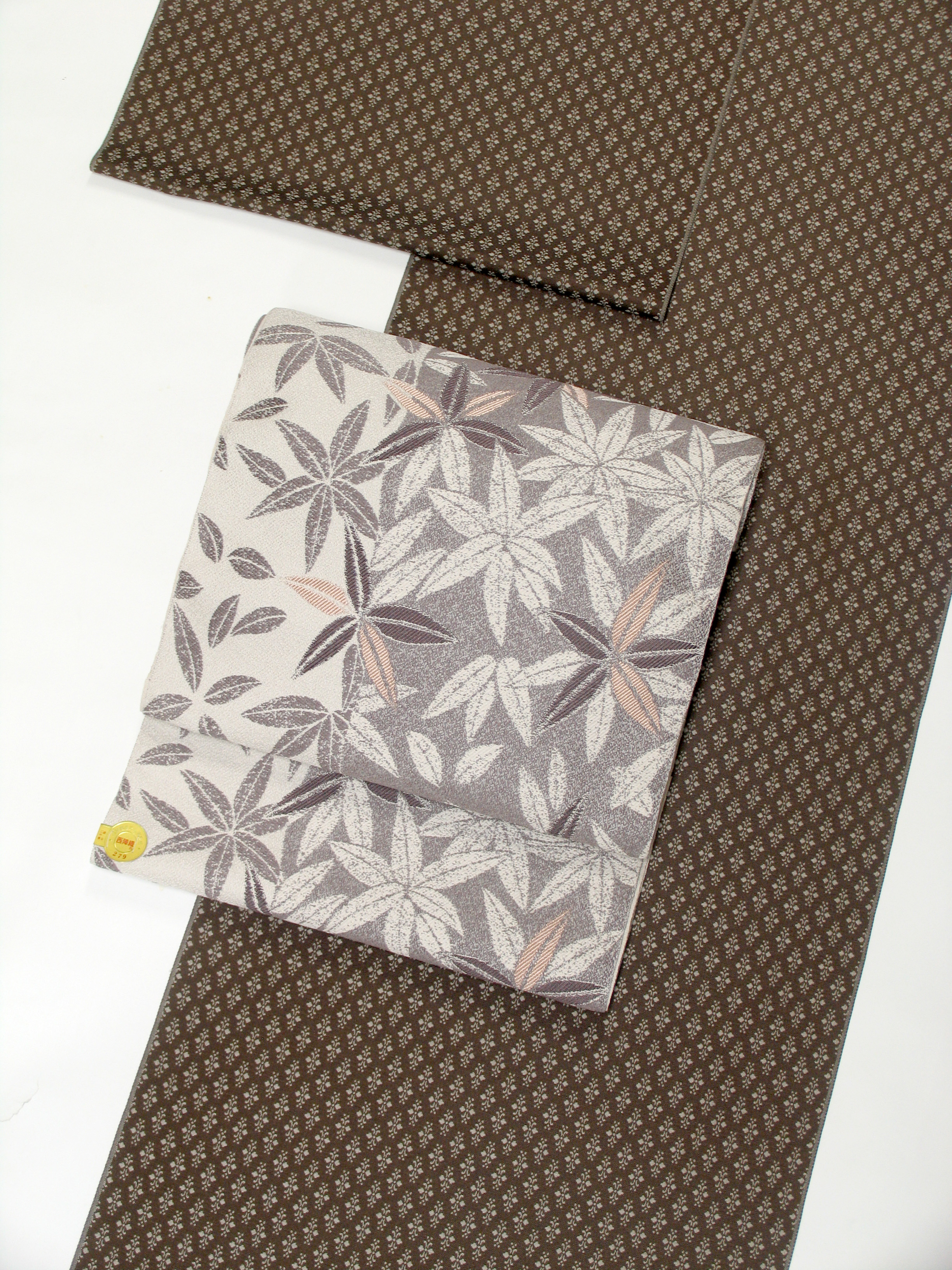 本来は裏地(うらじ)を付けて袷(あわせ)に仕立てますが、最近の暖かい春秋では単衣(ひとえ)で過ごすことが多くなりました。ここでは、西陣織(にしじんおり)の準礼装(じゅんれいそう)用名古屋帯(なごやおび)、京小紋(きょうこもん)の羽織(はおり)を合わせてみました。