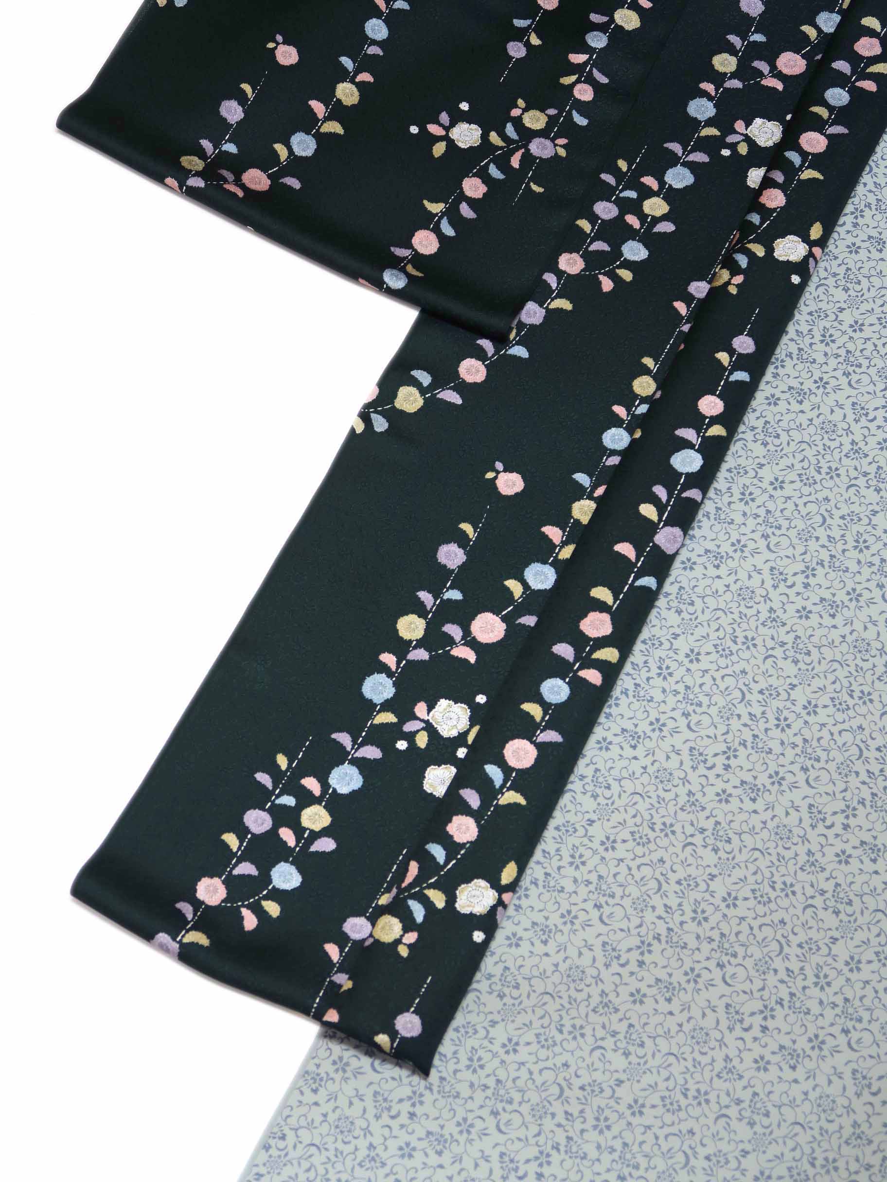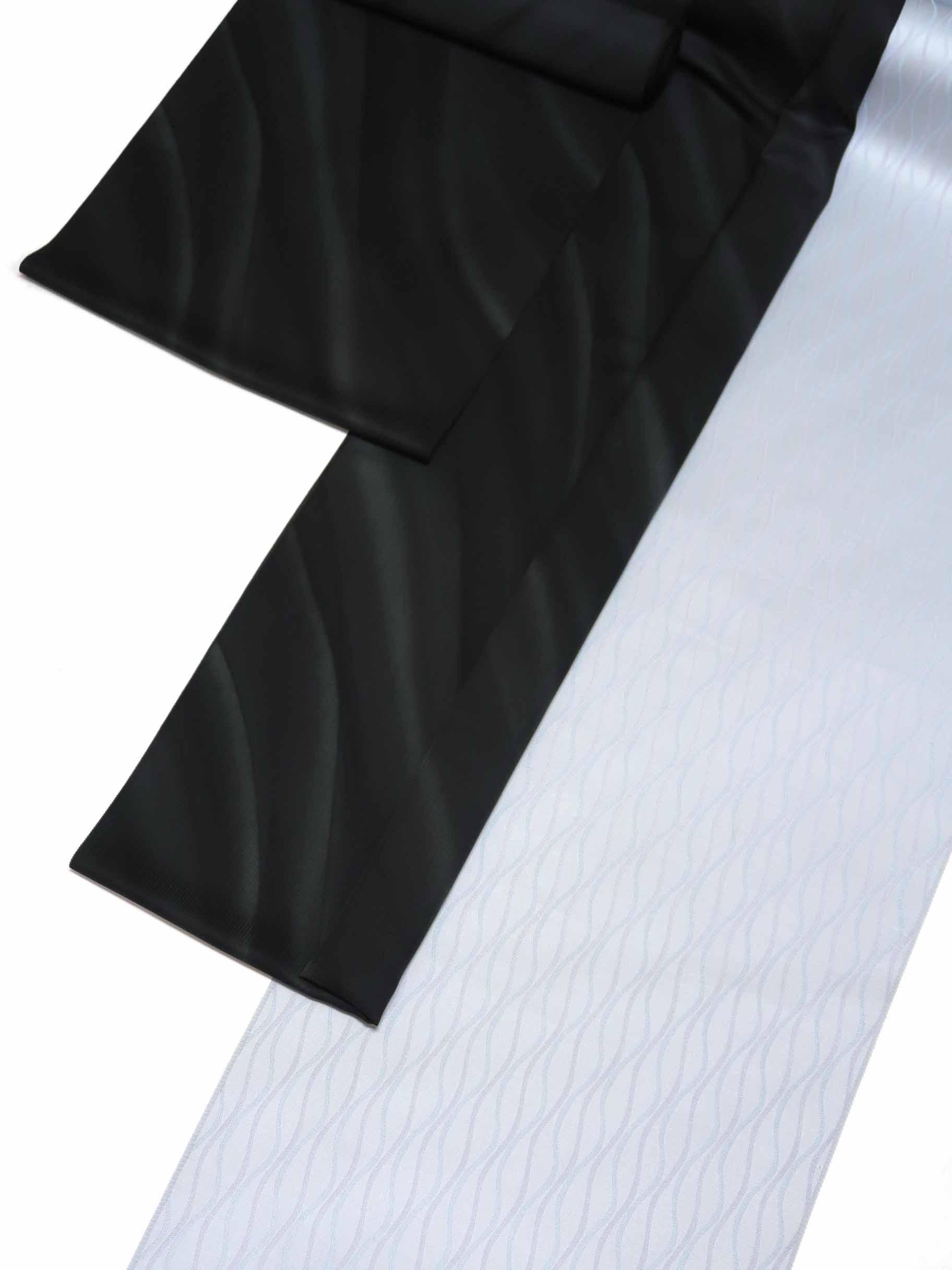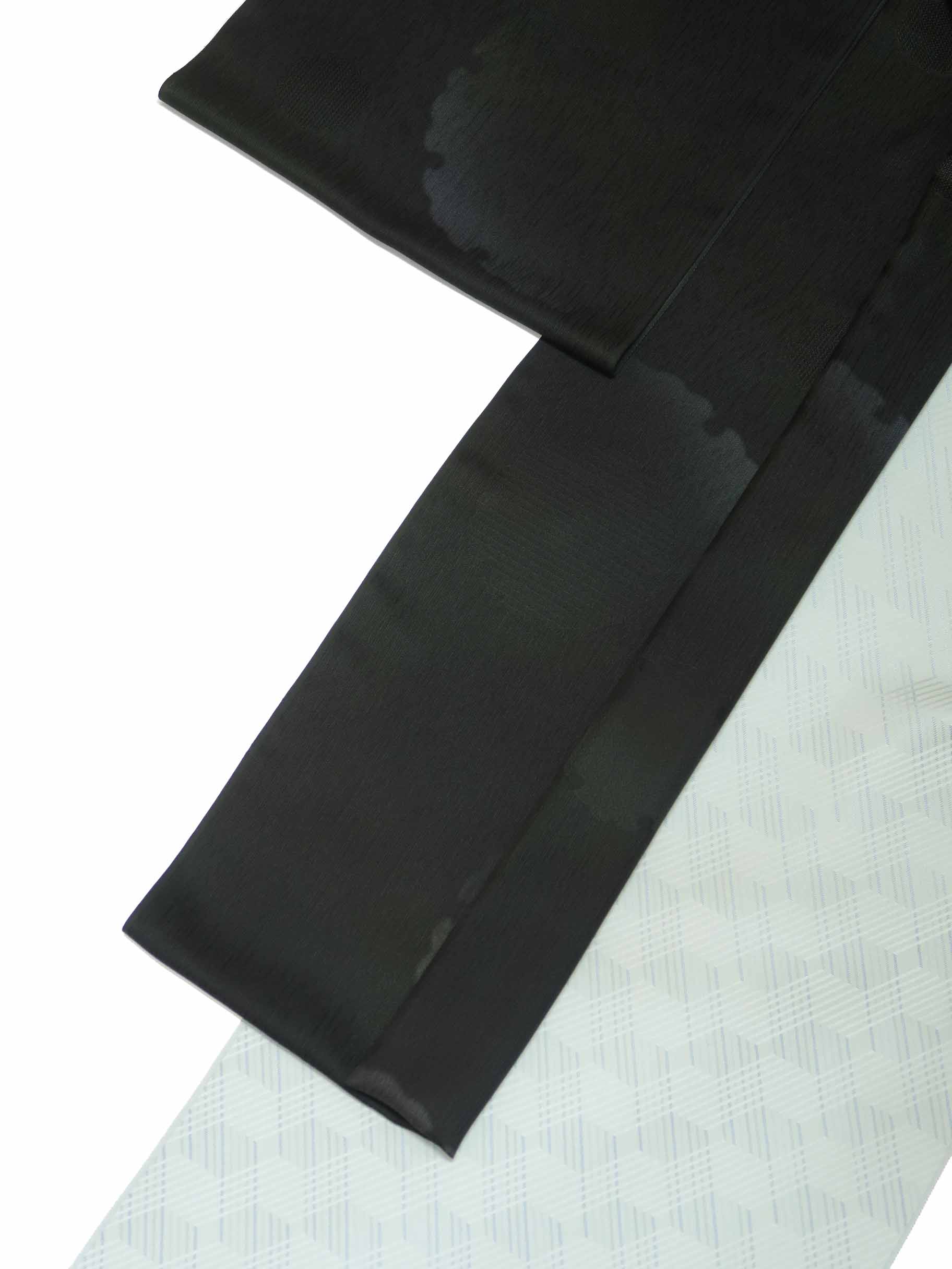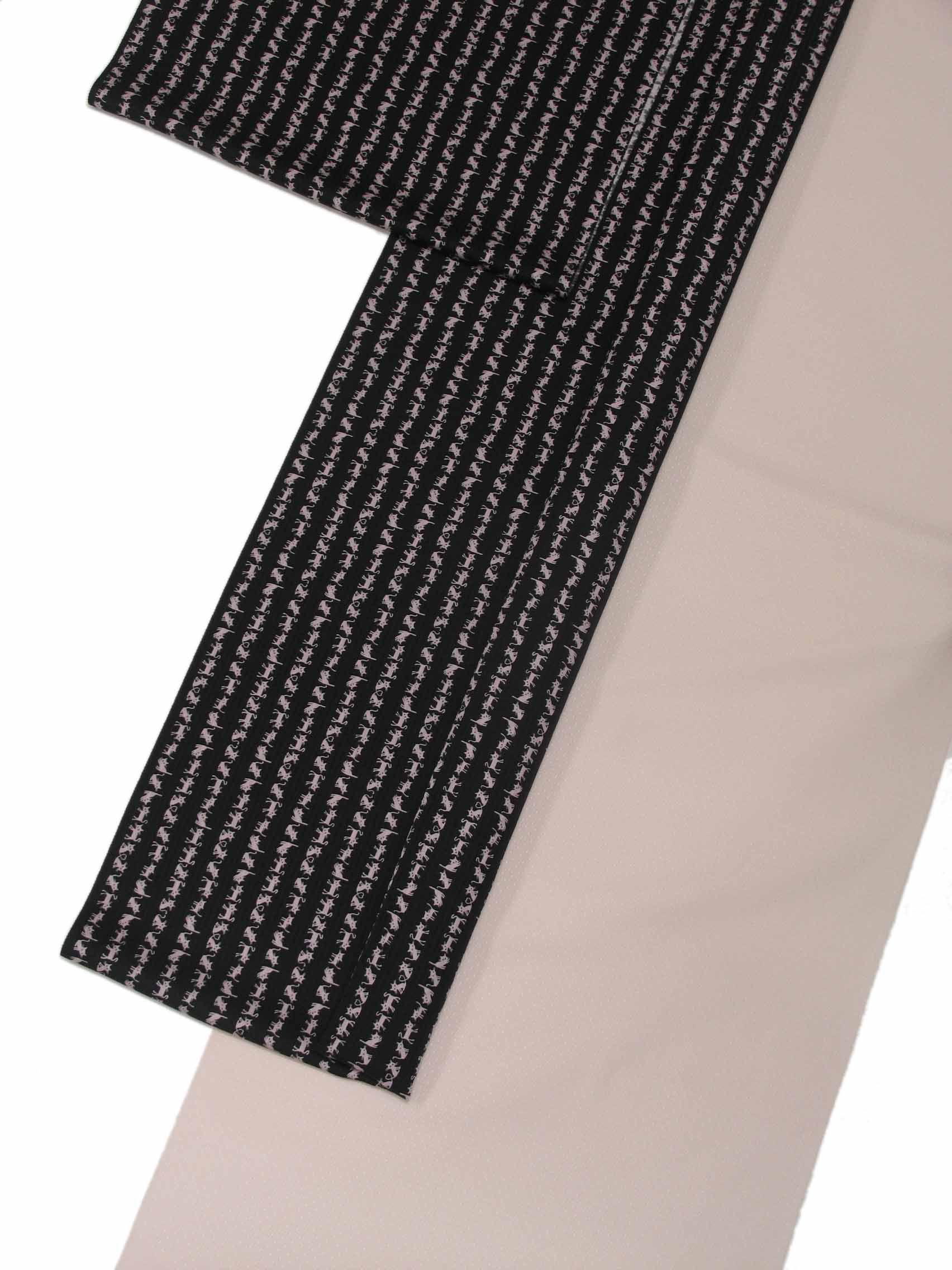 本来は裏地(うらじ)を付けて袷(あわせ)に仕立てますが、最近の暖かい春秋では単衣(ひとえ)で過ごすことが多くなりました。ここでは、西陣織(にしじんおり)のお洒落(しゃれ)用八寸名古屋帯、墨染めの羽織(はおり)を合わせてみました。