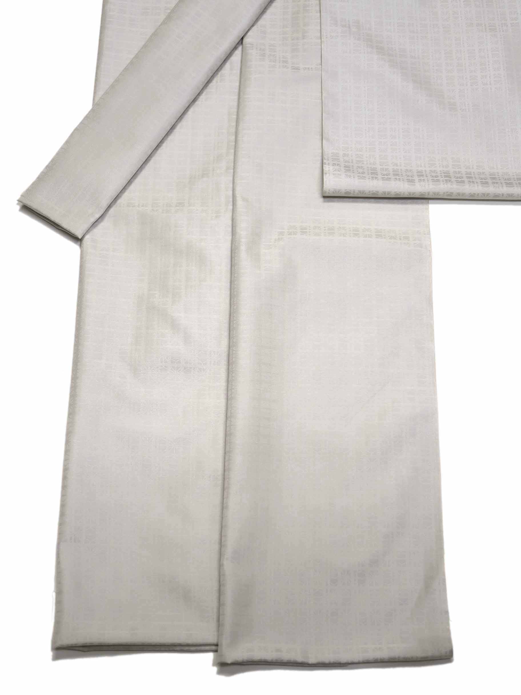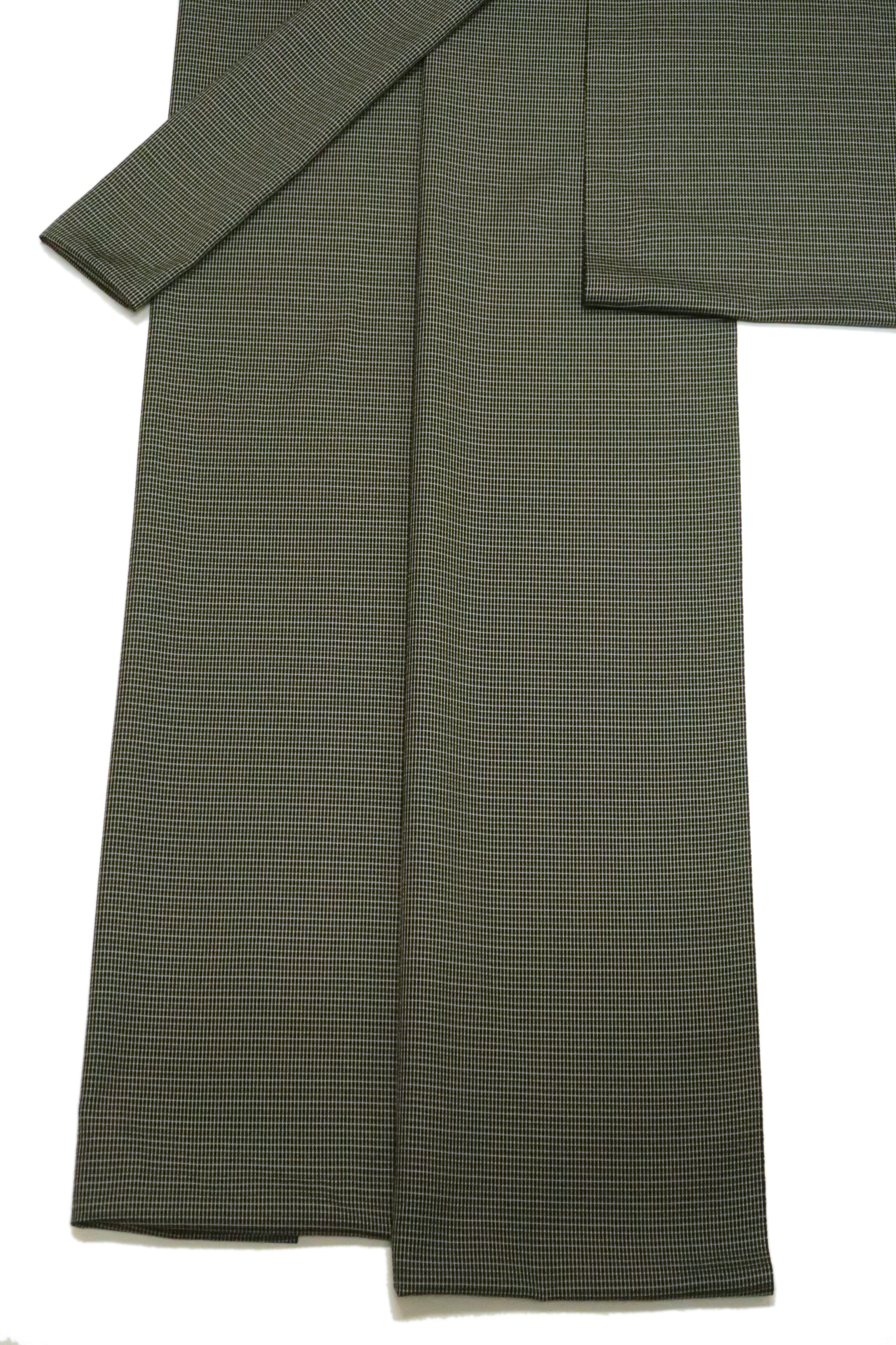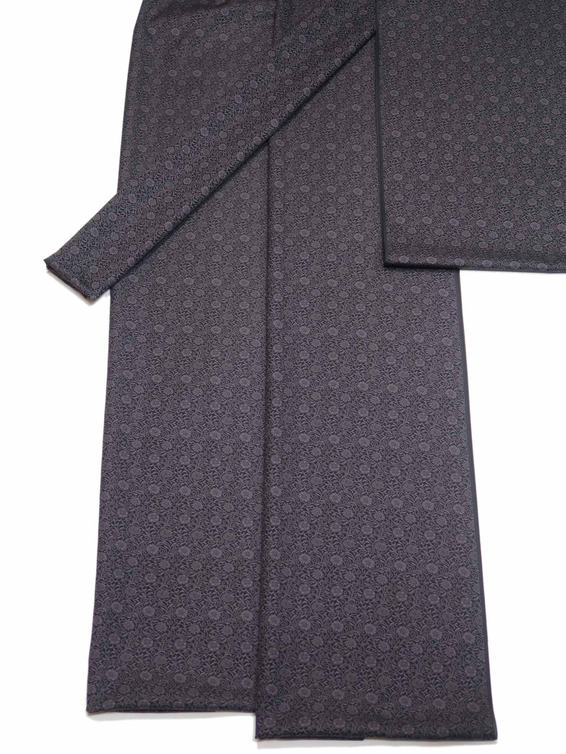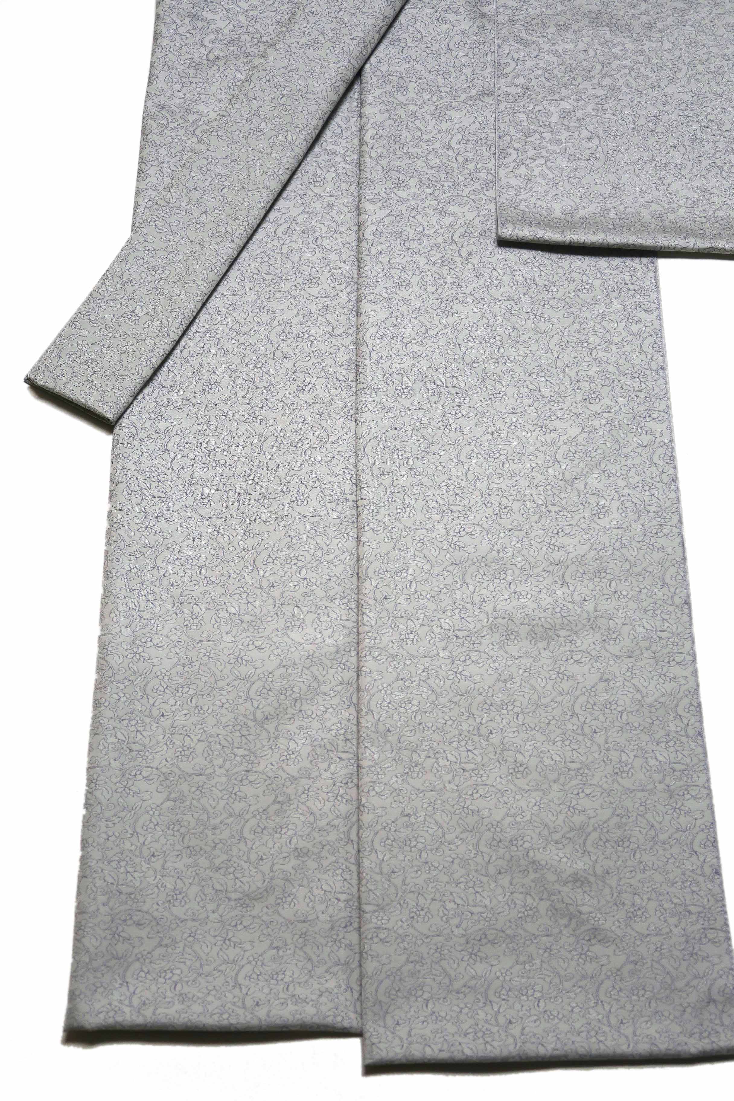 おとなしく上品(じょうひん)に織り上げられた本格派の「紋(もん)お召(め)し」です。お召しは「先染(さきぞ)め先練(さきね)り」ですから色糸(いろいと)はすべて糸の段階で文様を織り上げる前に染められます。遠目(とおめ)では色無地(いろむじ)に見えますが、その豪華(ごうか)な重厚感(じゅうこうかん)と軽くて丈夫(じょうぶ)な着心地(きごこち)は、お召しならではの味わいです。