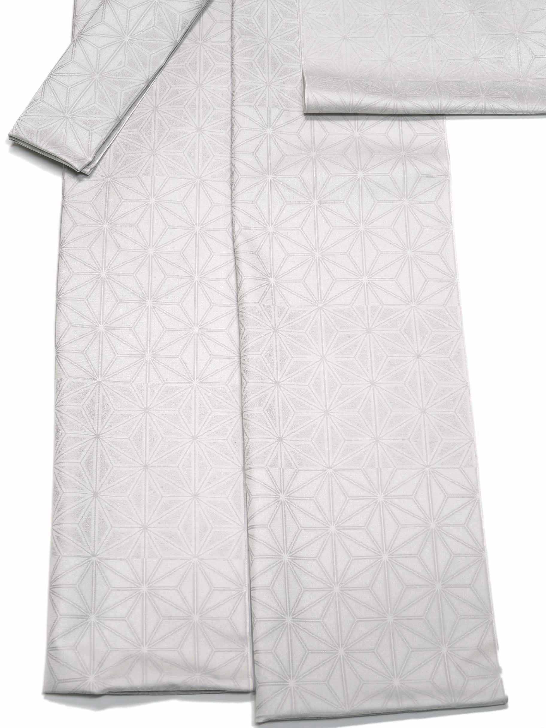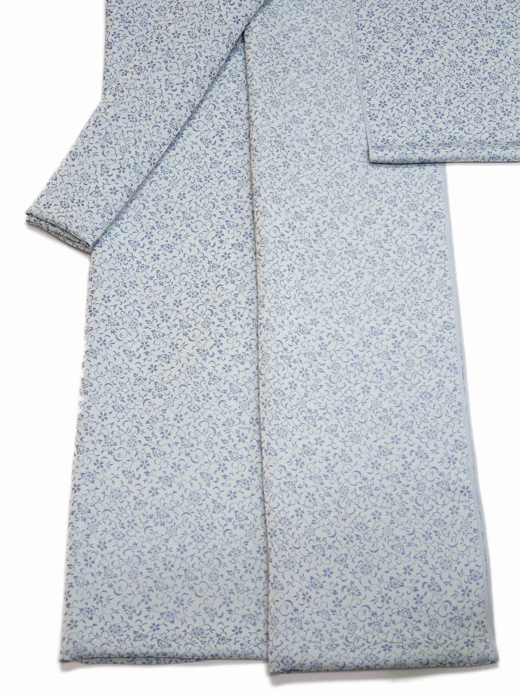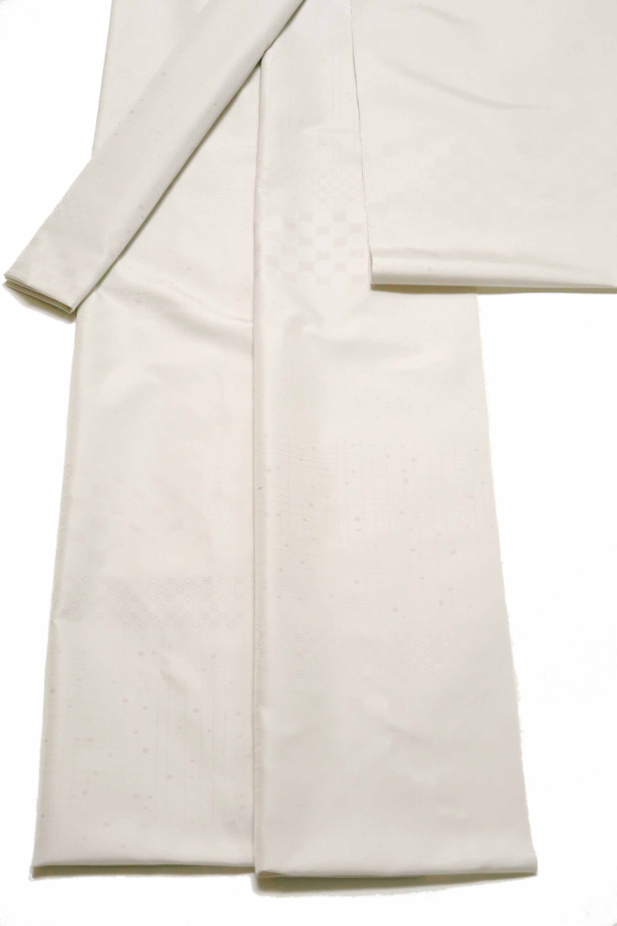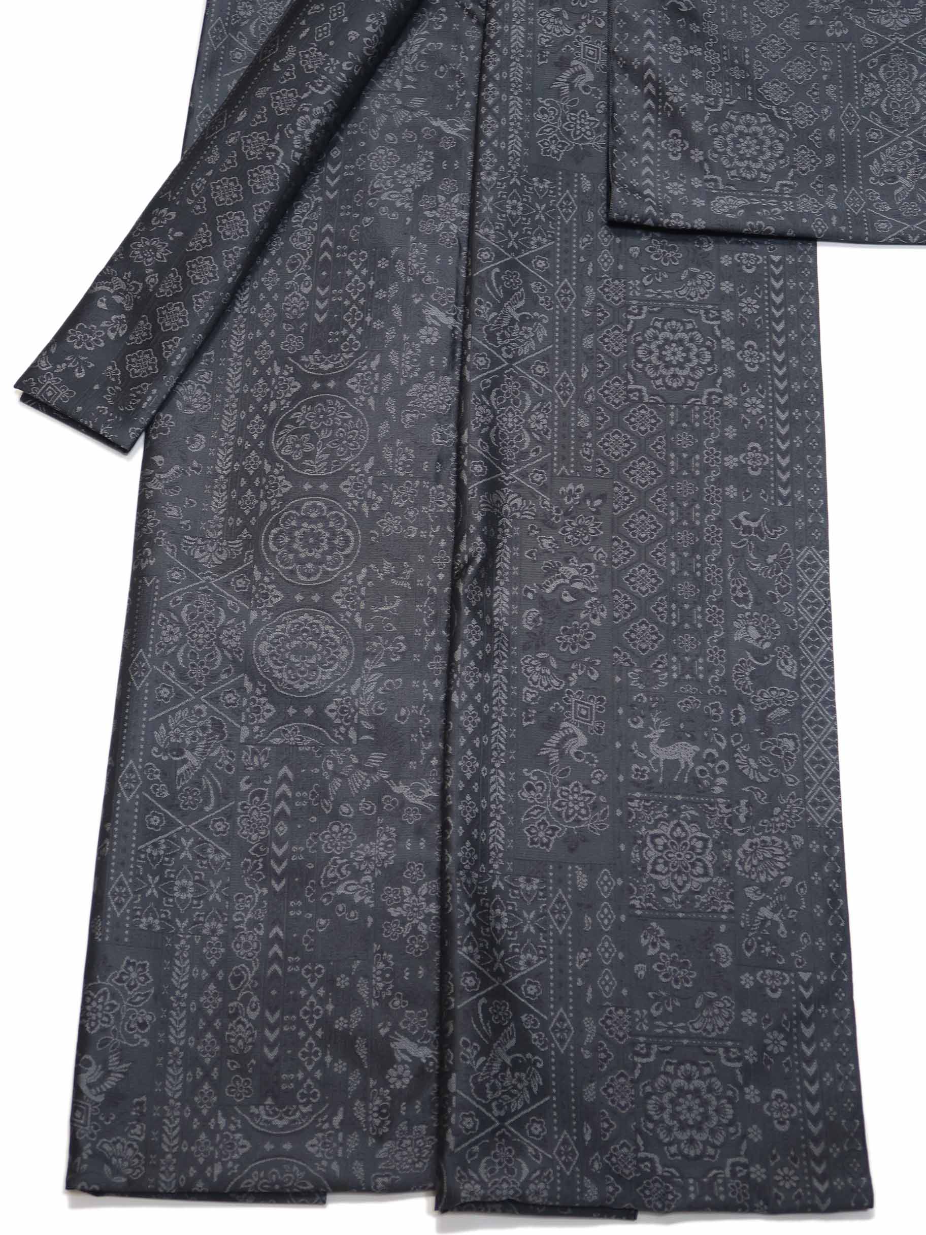 おとなしく上品(じょうひん)に織り上げられた本格派の「紋(もん)お召(め)し」です。お召しは「先染(さきぞ)め先練(さきね)り」ですから色糸(いろいと)はすべて糸の段階で文様を織り上げる前に染められます。遠目(とおめ)では色無地(いろむじ)に見えますが、その豪華(ごうか)な重厚感(じゅうこうかん)と軽くて丈夫(じょうぶ)な着心地(きごこち)は、お召しならではの味わいです。