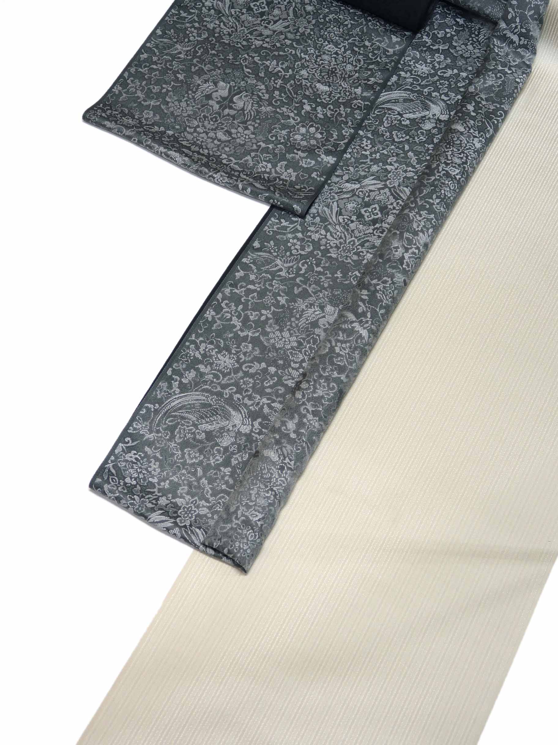 本来は裏地(うらじ)を付けて袷(あわせ)に仕立てますが、最近の暖かい春秋では単衣(ひとえ)で過ごすことが多くなりました。ここでは、西陣織(にしじんおり)の準礼装(じゅんれいそう)用名古屋帯(なごやおび)、紋紗(もんしゃ)の単衣(ひとえ)羽織(はおり)を合わせてみました。
