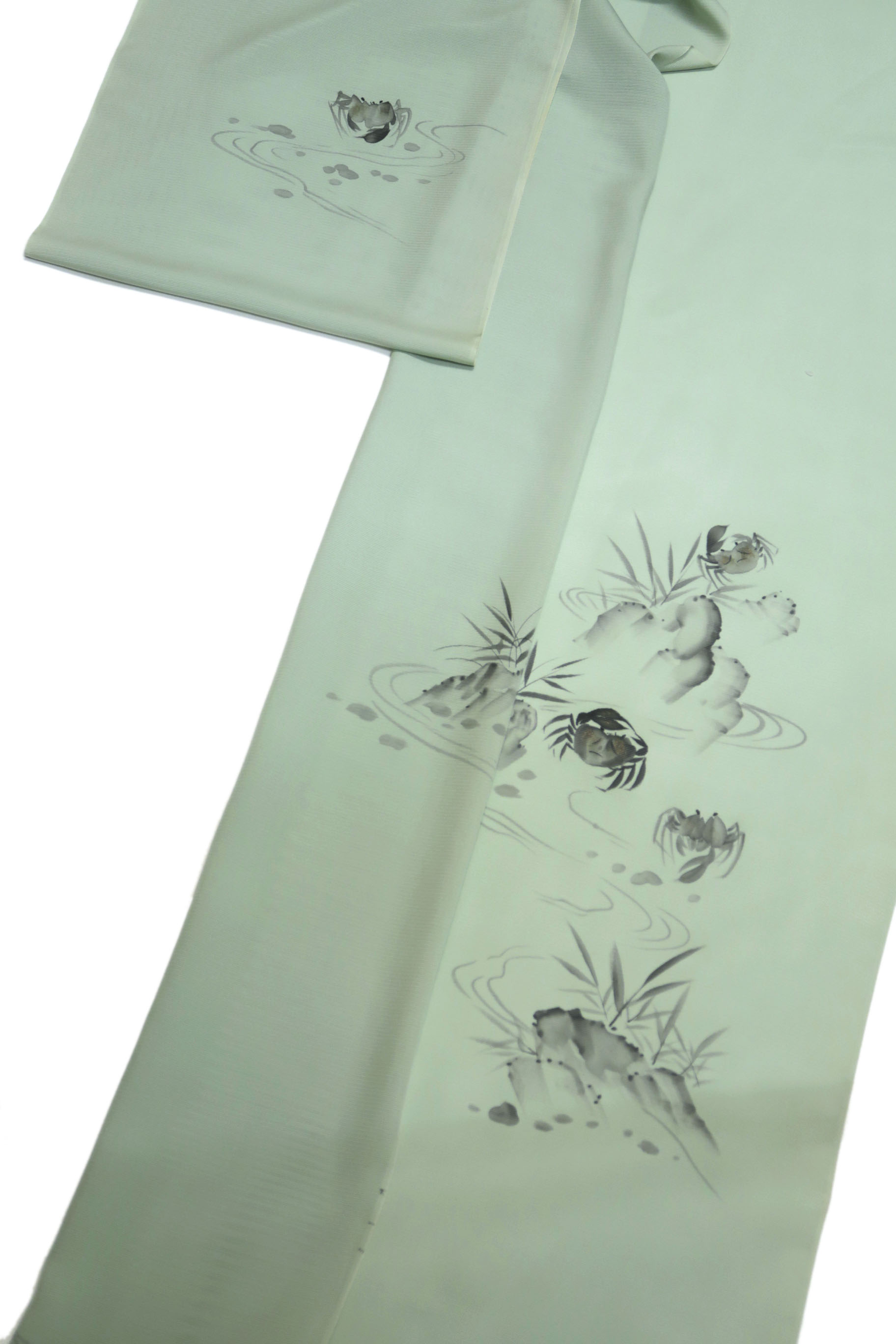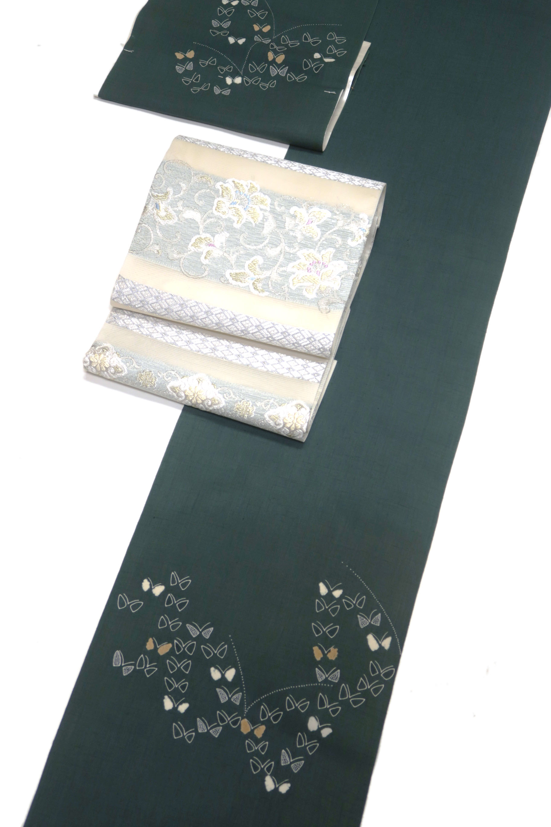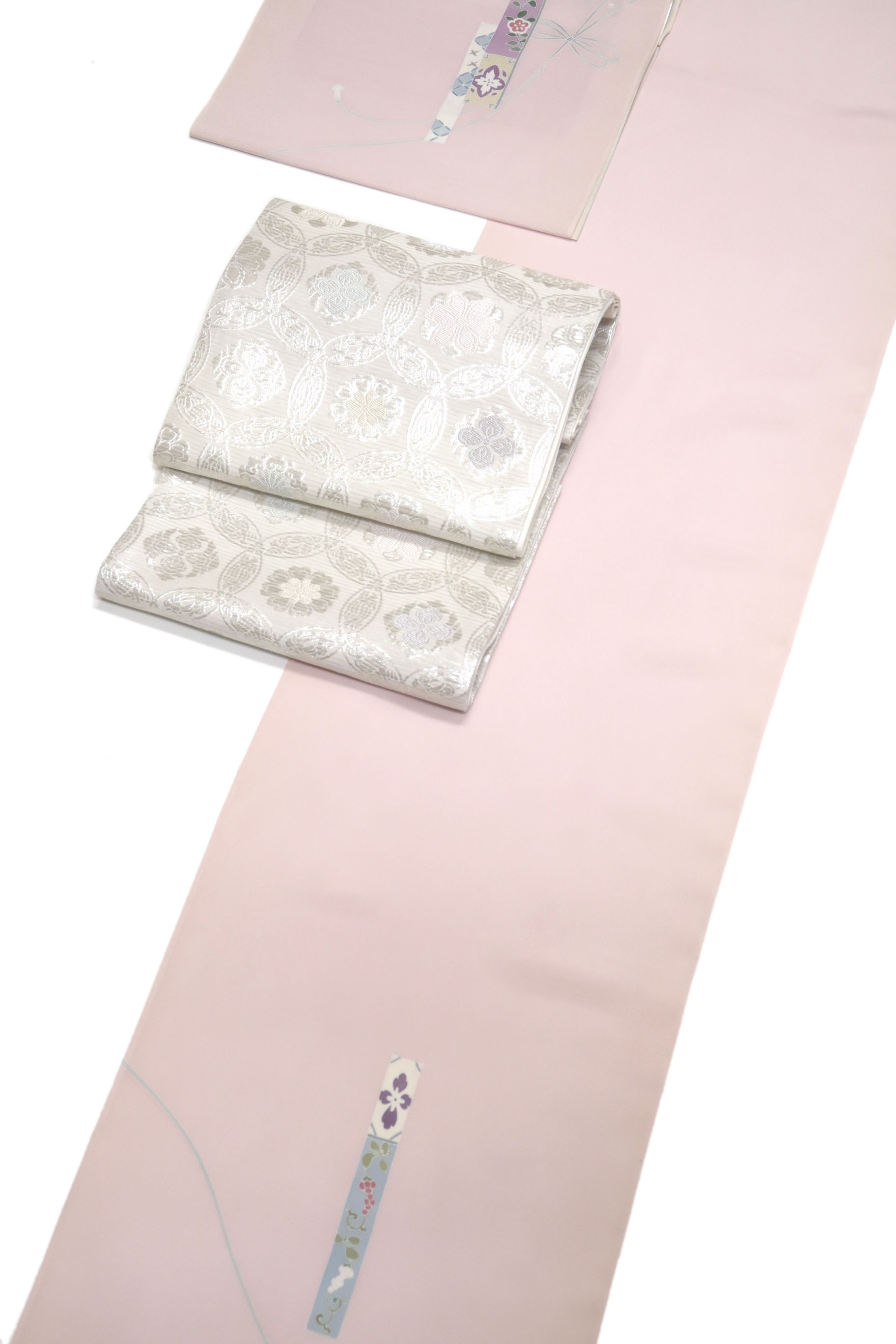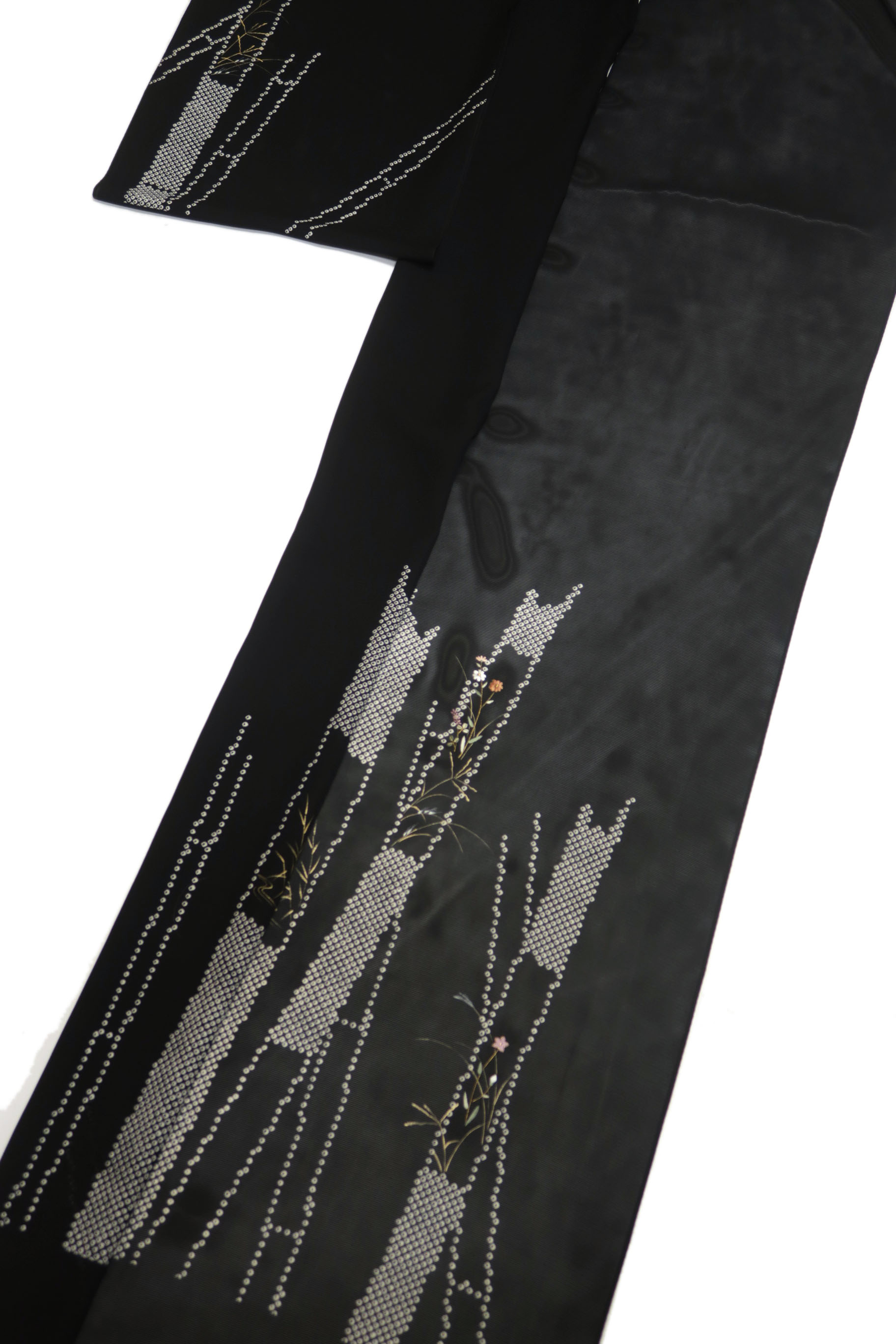 付け下げとは、柄が上から下に付け下がる(一定方向)と言うところから呼ばれた名前です。つまり、柄付けが肩山と袖山で上下を反転して前から見ても後から見ても、柄が上向きになるように染められています。