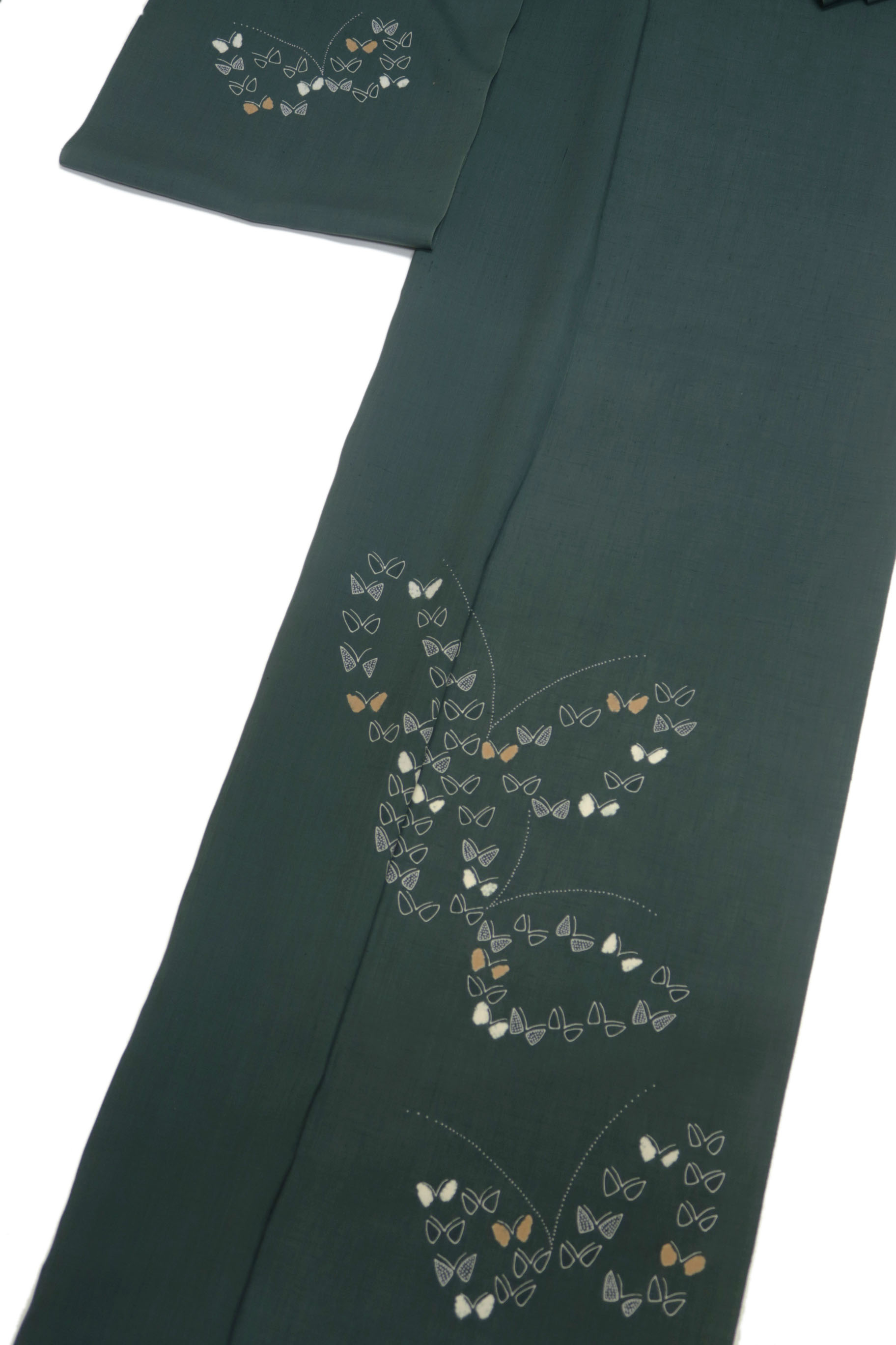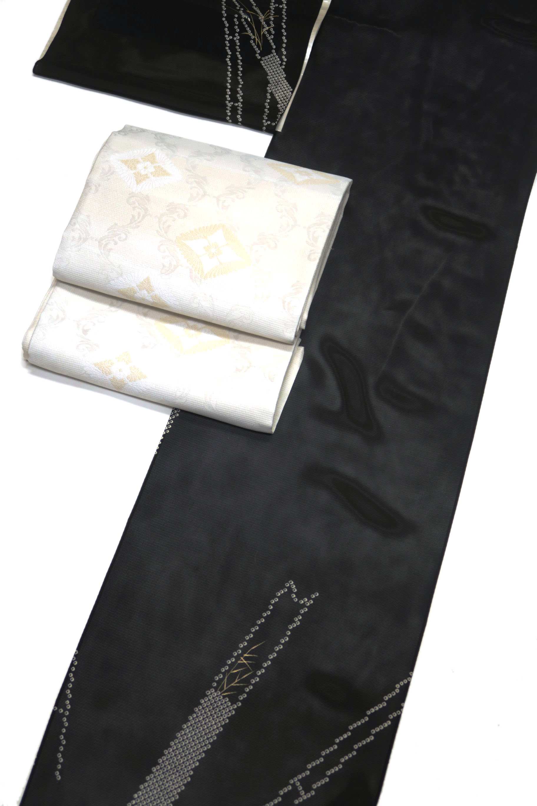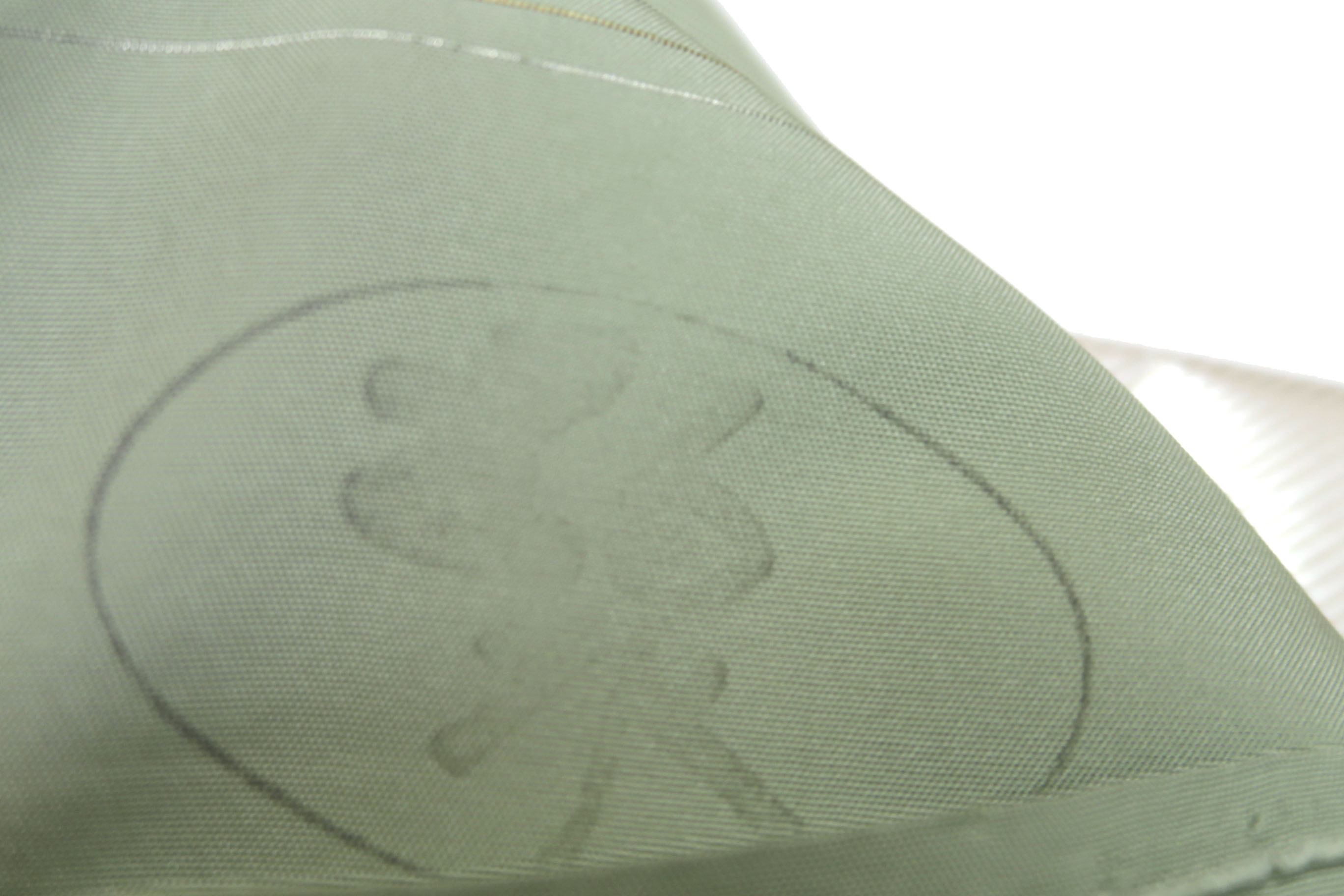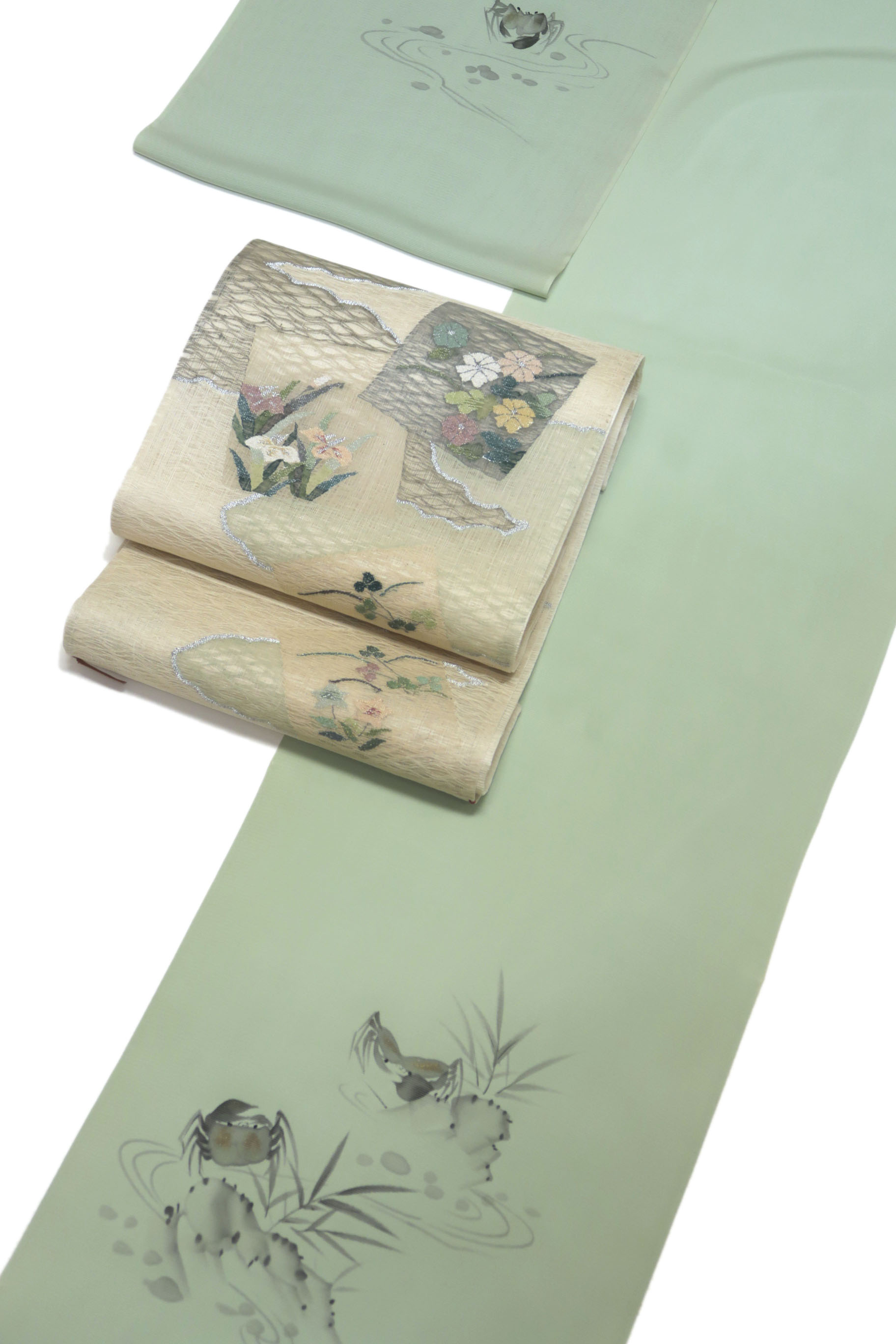 付け下げとは、柄が上から下に付け下がる(一定方向)と言うところから呼ばれた名前です。つまり、柄付けが肩山と袖山で上下を反転して前から見ても後から見ても、柄が上向きになるように染められています。