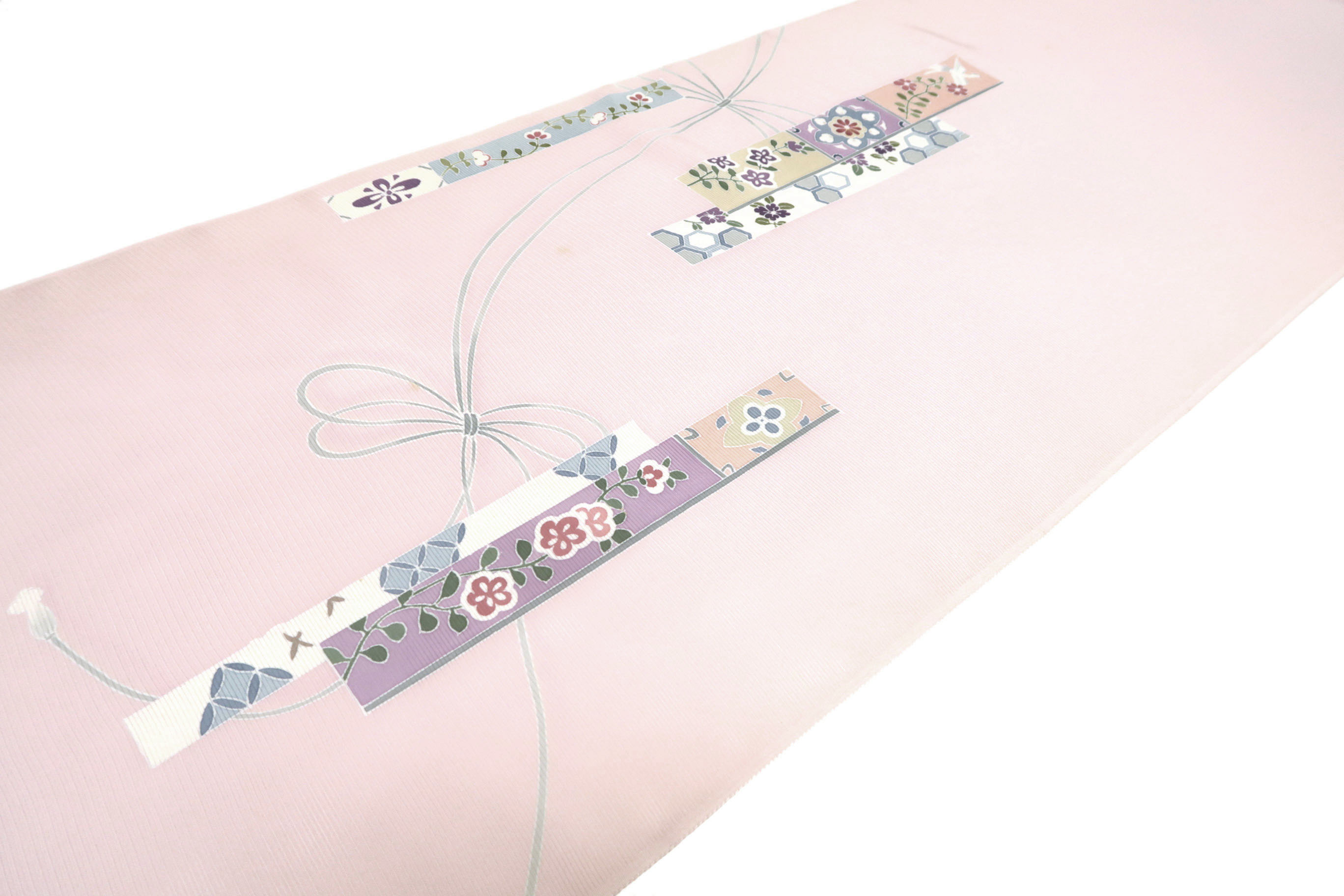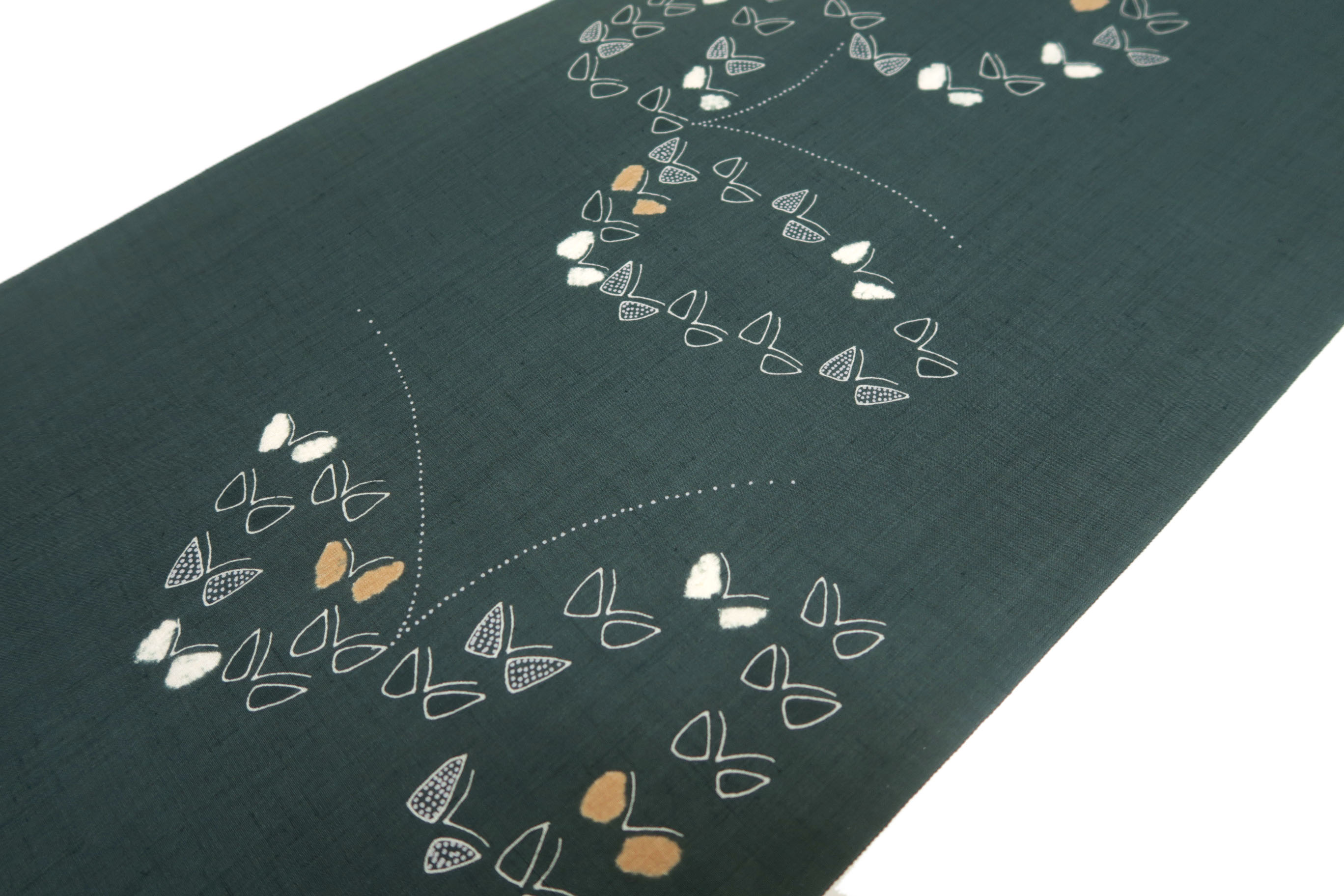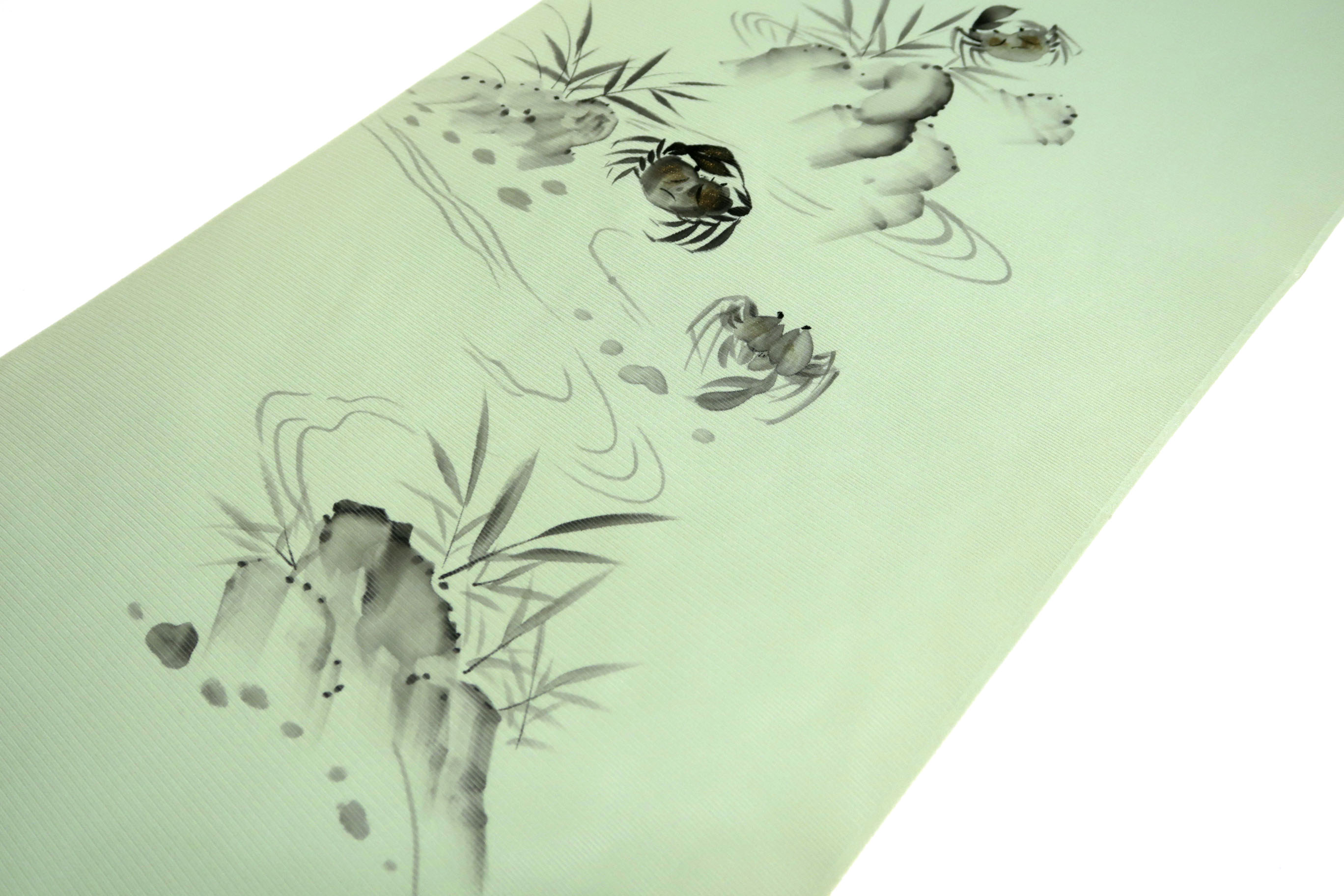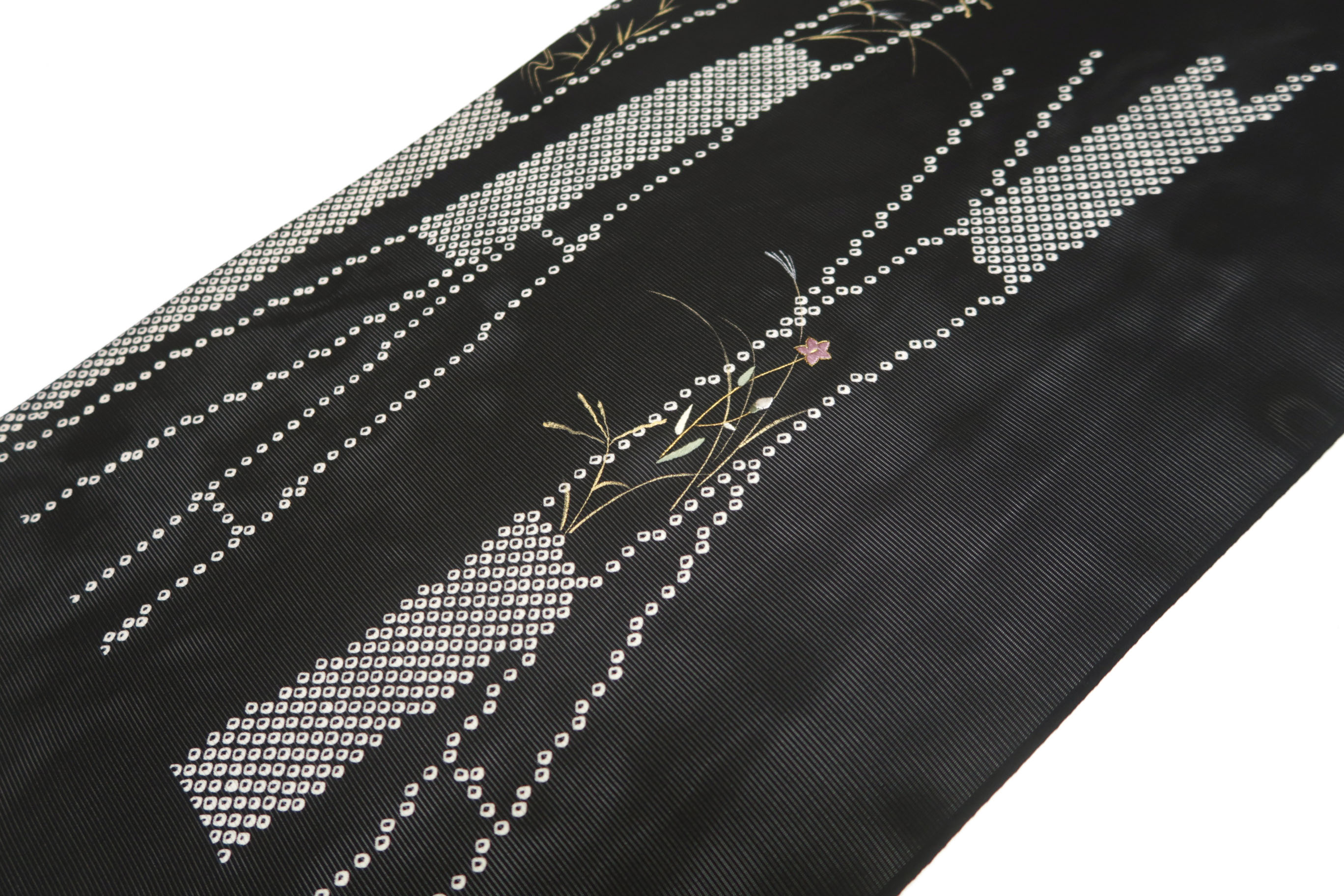 付け下げとは、柄が上から下に付け下がる(一定方向)と言うところから呼ばれた名前です。つまり、柄付けが肩山と袖山で上下を反転して前から見ても後から見ても、柄が上向きになるように染められています。