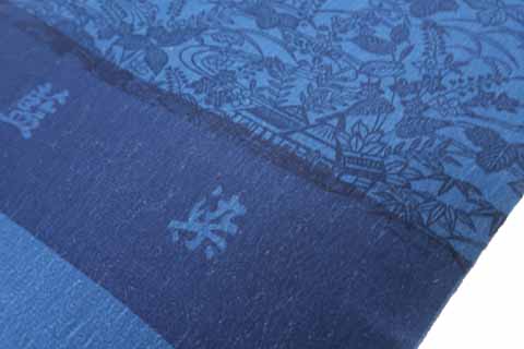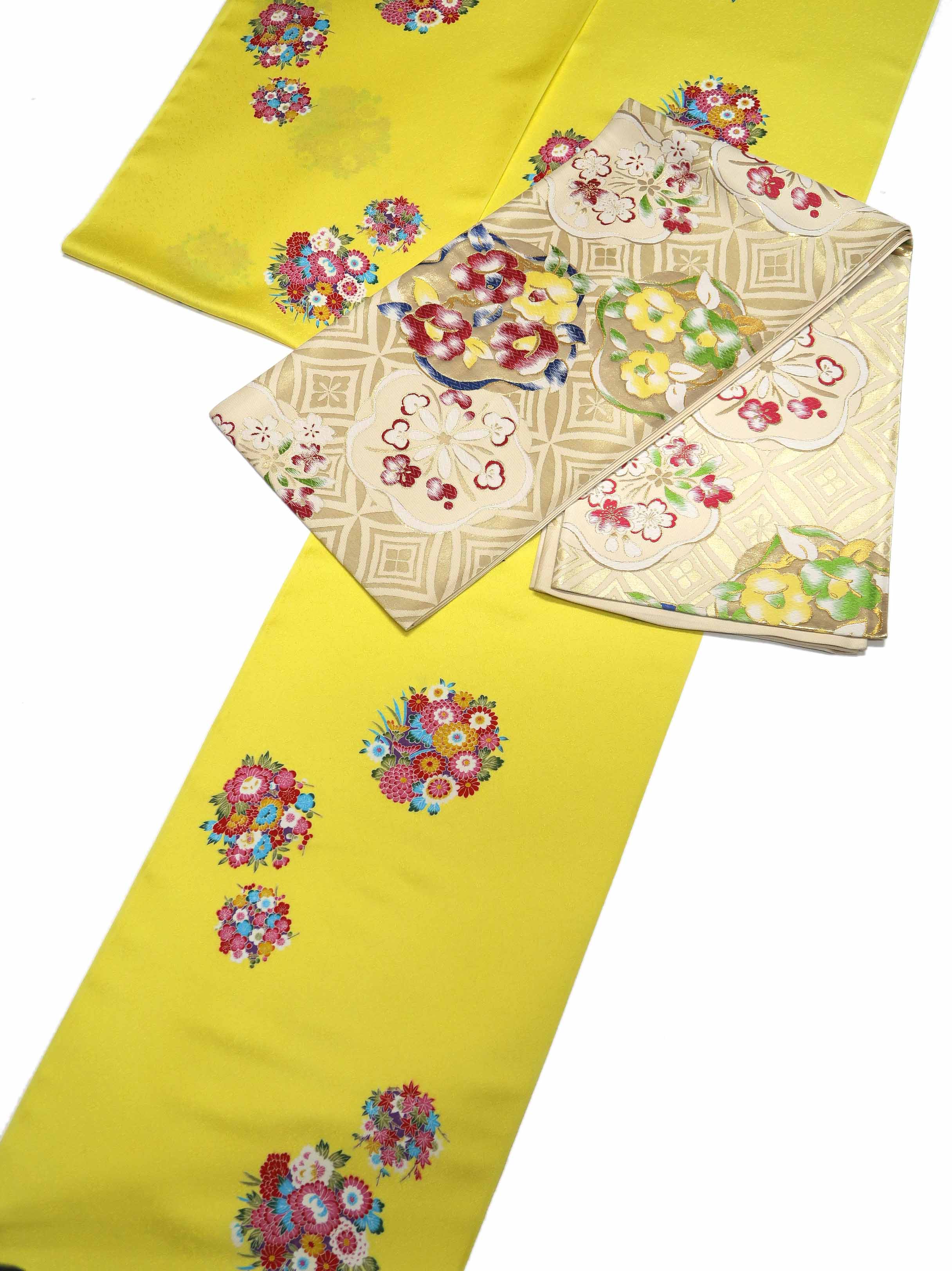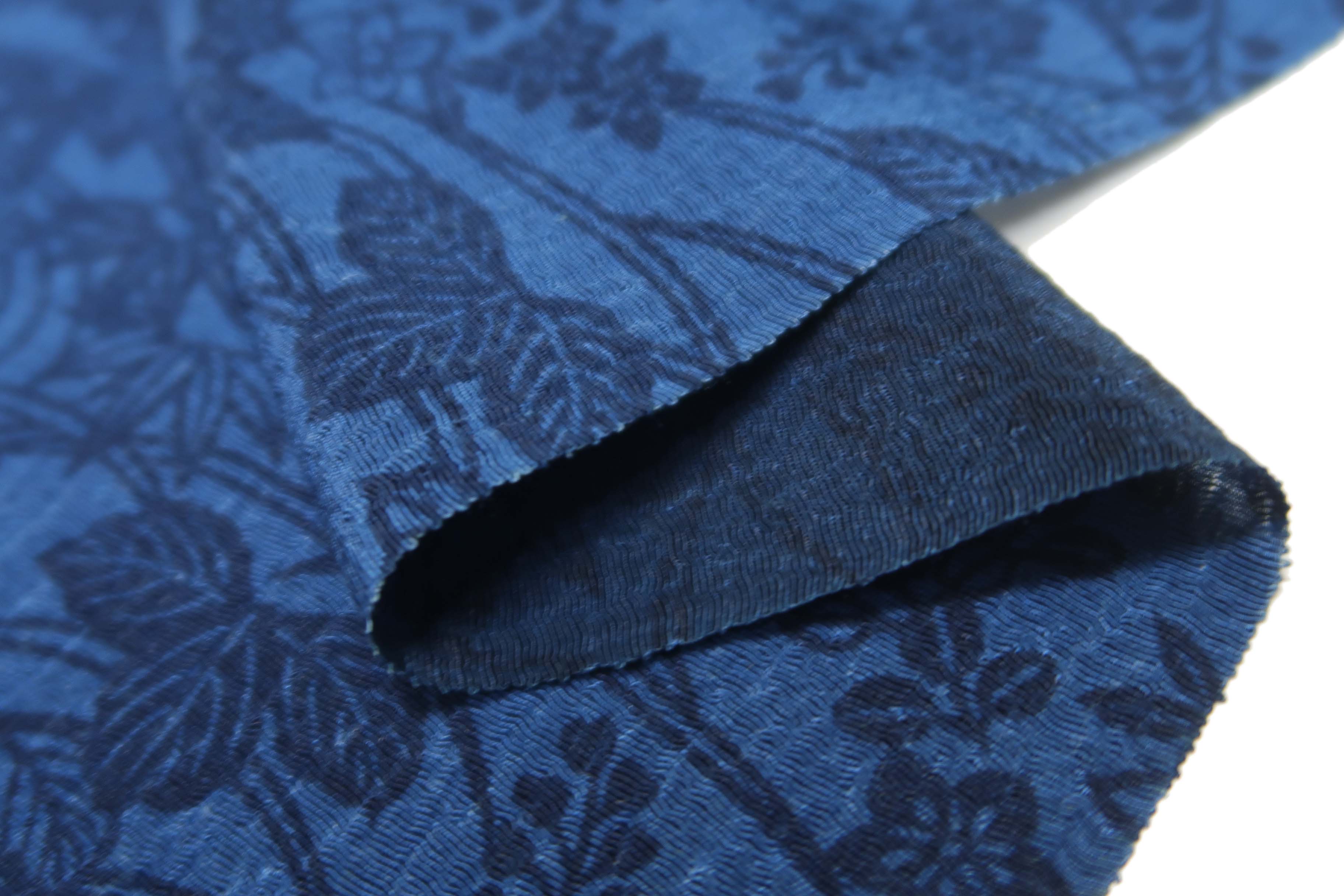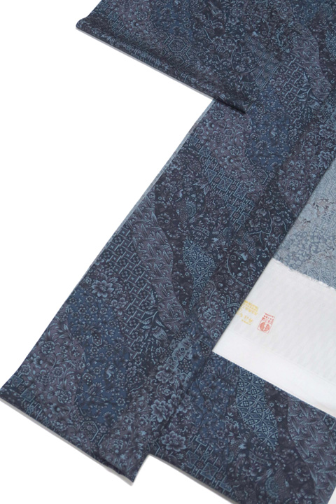 着尺(きじゃく)とは、羽尺(はじゃく)に対する言葉で、きもの用の長着(ながぎ)、長羽織(ながばおり)、ロングコートに仕立てることができるほどの長尺(ちょうじゃく)があることを意味しています。従って、この着尺は、長着、長羽織、ロングコートにして着られます。長着にする場合、礼装向(れいそうむ)きの名物裂(めいぶつぎれ)の袋帯を合わせてみましたが、八寸(はっすん)名古屋帯(なごやおび)でも九寸(きゅうすん)名古屋帯(なごやおび)でも無難(ぶなん)に合わせることができるでしょう。羽織にすれば、紬(つむぎ)や小紋(こもん)、色無地(いろむじ)やお召(め)しにも良く合います。
