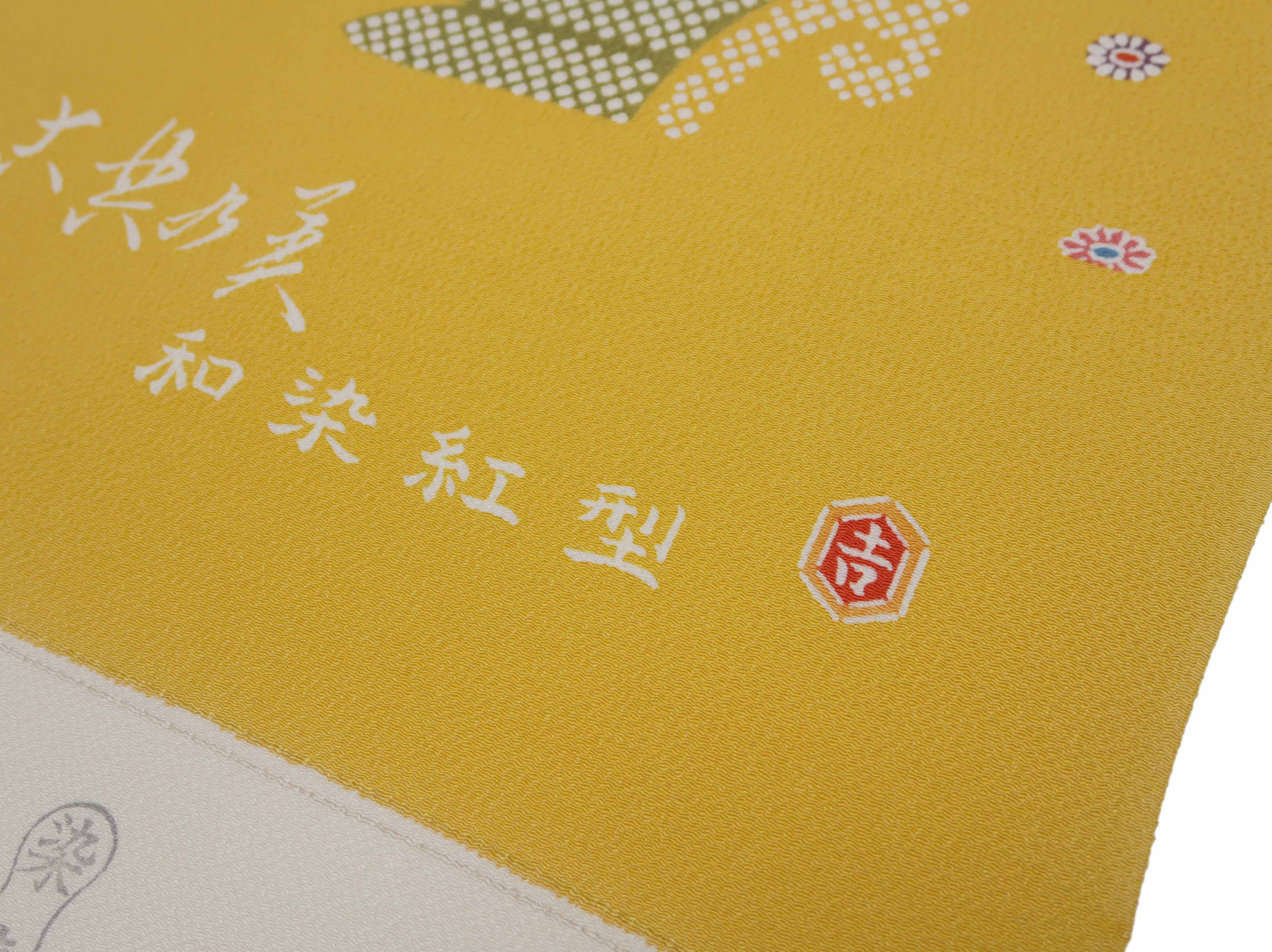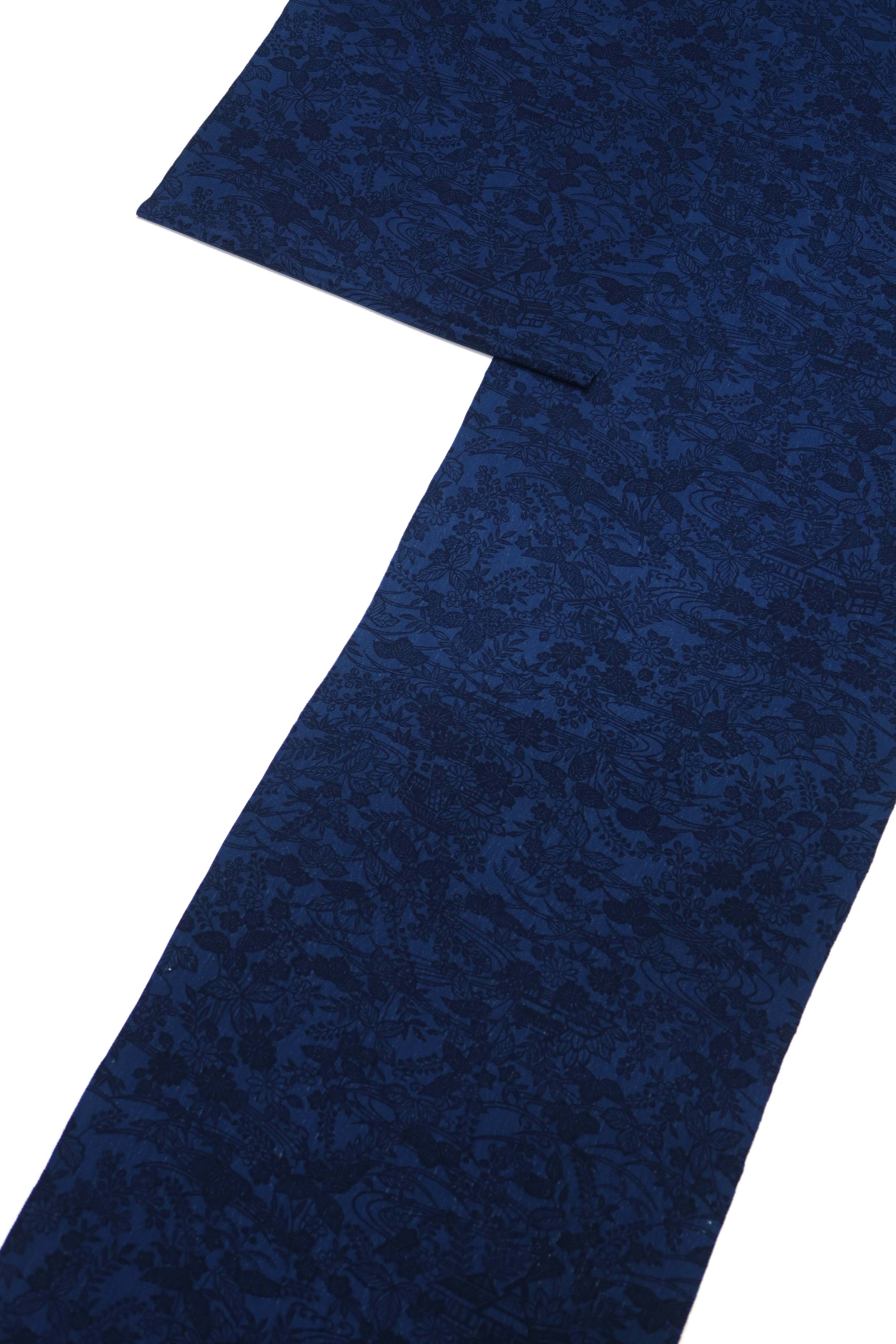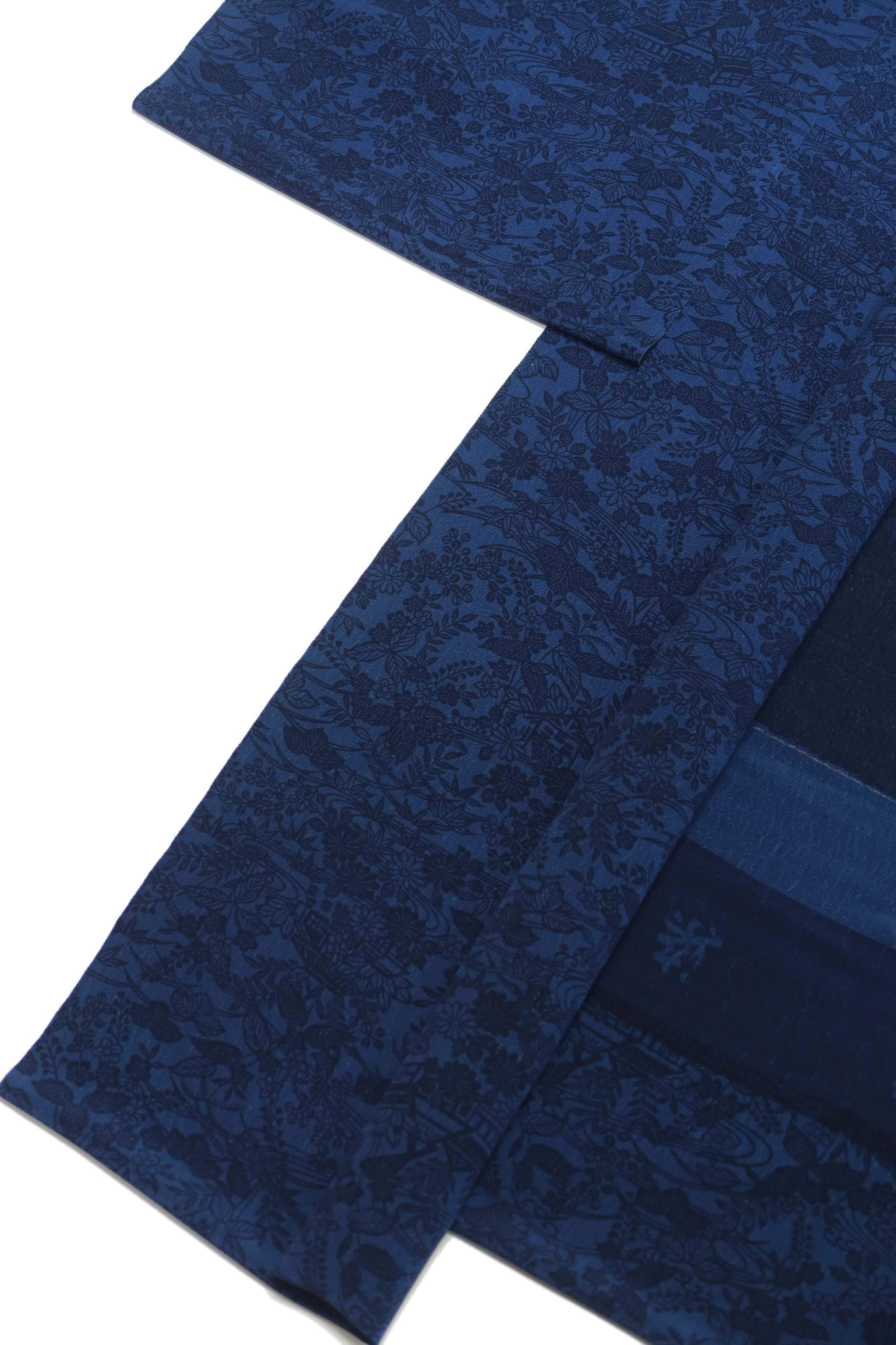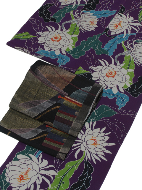 着尺(きじゃく)とは、羽尺(はじゃく)に対する言葉で、きもの用の長着(ながぎ)、長羽織(ながばおり)、ロングコートに仕立てることができるほどの長尺(ちょうじゃく)があることを意味しています。従って、この着尺は、長着、長羽織、ロングコートにして着られます。長着にする場合、お洒落(しゃれ)用の白の袋帯を合わせてみましたが、八寸(はっすん)名古屋帯(なごやおび)でも九寸(きゅうすん)名古屋帯(なごやおび)でも無難(ぶなん)に合わせることができるでしょう。羽織にすれば、紬(つむぎ)や小紋(こもん)、色無地(いろむじ)やお召(め)しにも良く合います。