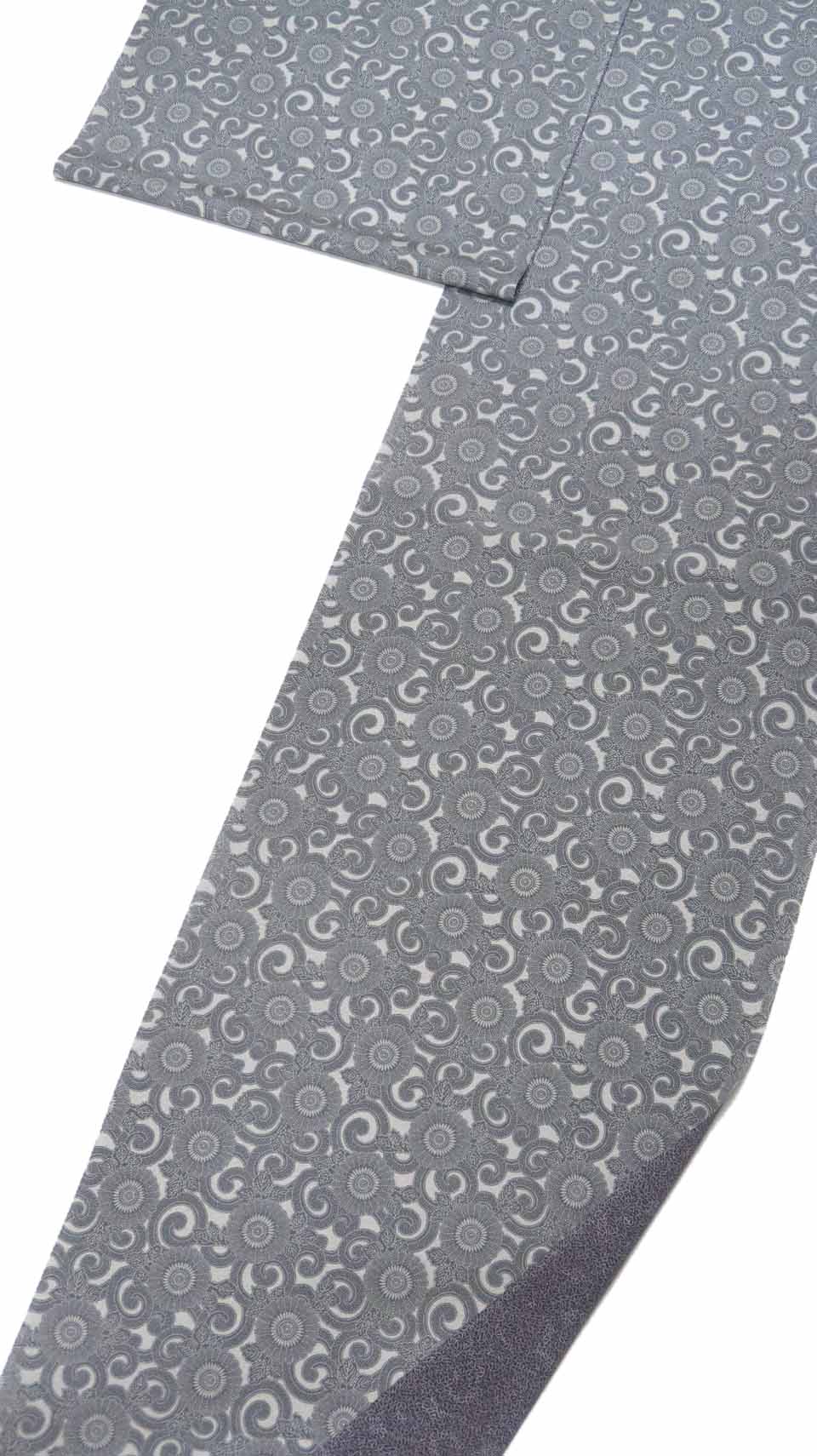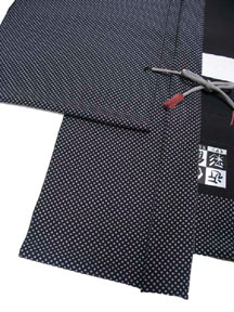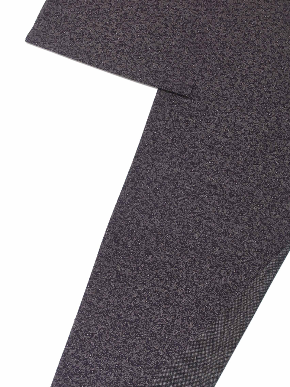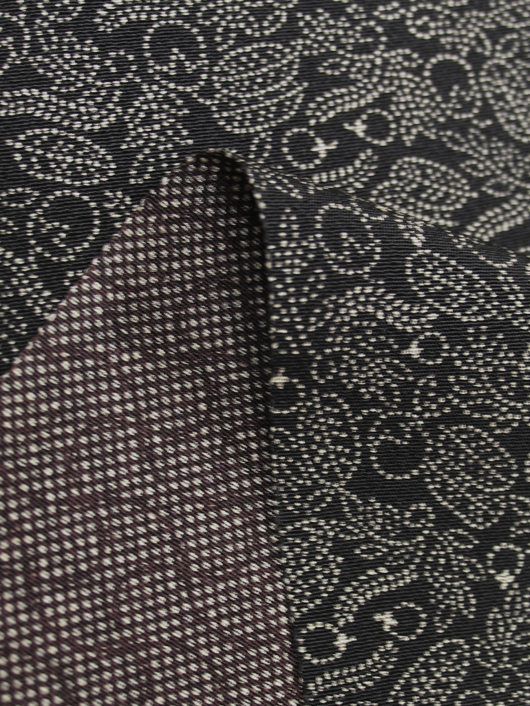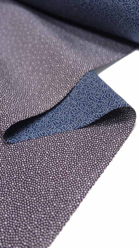 絹、綿、麻、化学繊維などの生地を染色して作られる着物、いわゆる「後染めの着物」は、表地のみを染める片面染めが主流ですが、裏地にも地色などを染める反物もあります。袷の着物なら裏地を付けて仕立てますので、裏面には色柄は必要ないと思われるかも知れません。しかし、実際には多くの江戸小紋などでも一色の無地などで裏面も染めてあります。それは、裏地を染めることによって表地の色柄に微妙な深みが出て、より鮮明な文様が表現できるからにほかなりません。武士の公服として発達した裃は、江戸時代後期には両面染めが現れます。袴の上着として着用した肩絹は、生地の裏側が見えるからだと思われます。つまり、肩絹には裏地は付けず単衣に仕立てますので、肩山を基点にした前側と後側になる表生地だけを染めたのでは、内側には色柄はなく、染める前の白い生地、もしくは無地の地色が見えることになるからです。特に表と同じ色柄の江戸小紋を染め上げる技術は難しく、表裏の柄がぴったり合わせなければなりません。それ以降、昭和初期まで同じ色柄で染める両面染めが少なからずありました(資料:染織辞典中江克己編)。その染色技法を現代に受け継ぎ再現したのが、この両面染めの江戸小紋です。生地の厚さ、わずか0.8~0.9mm程度の両面に色も柄も異なる図案が滲まず、干渉せず、見事に染め上げられました。