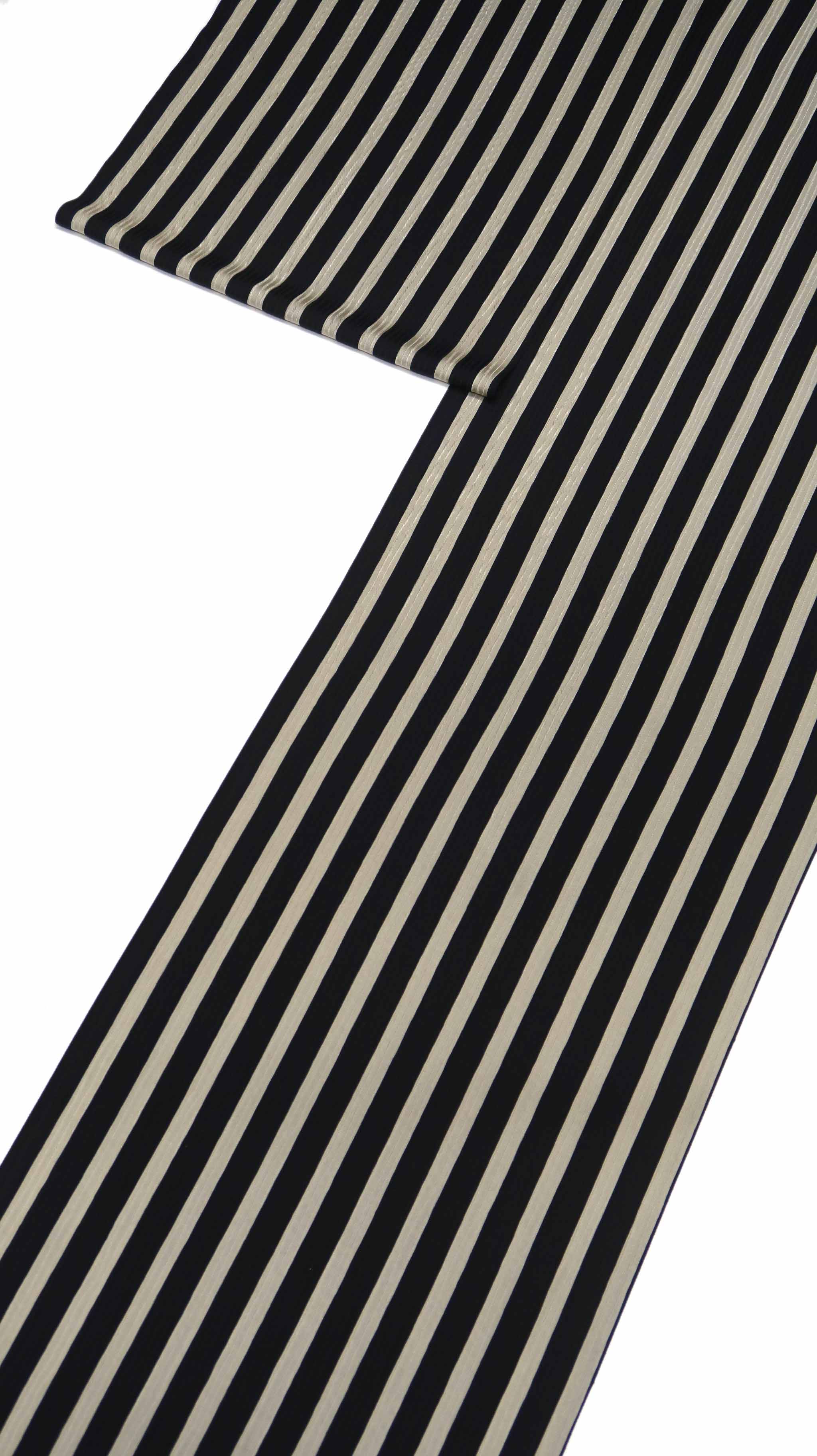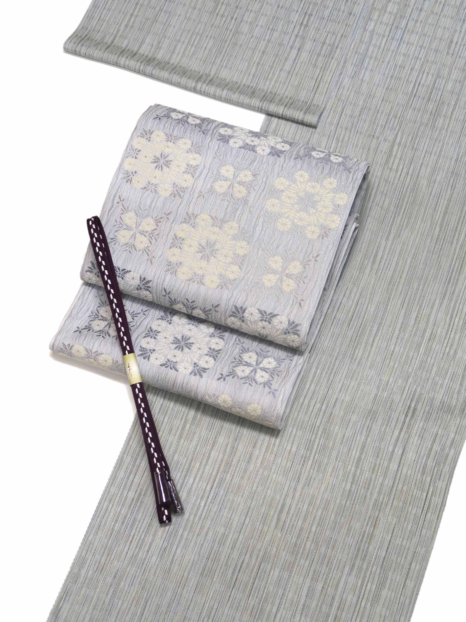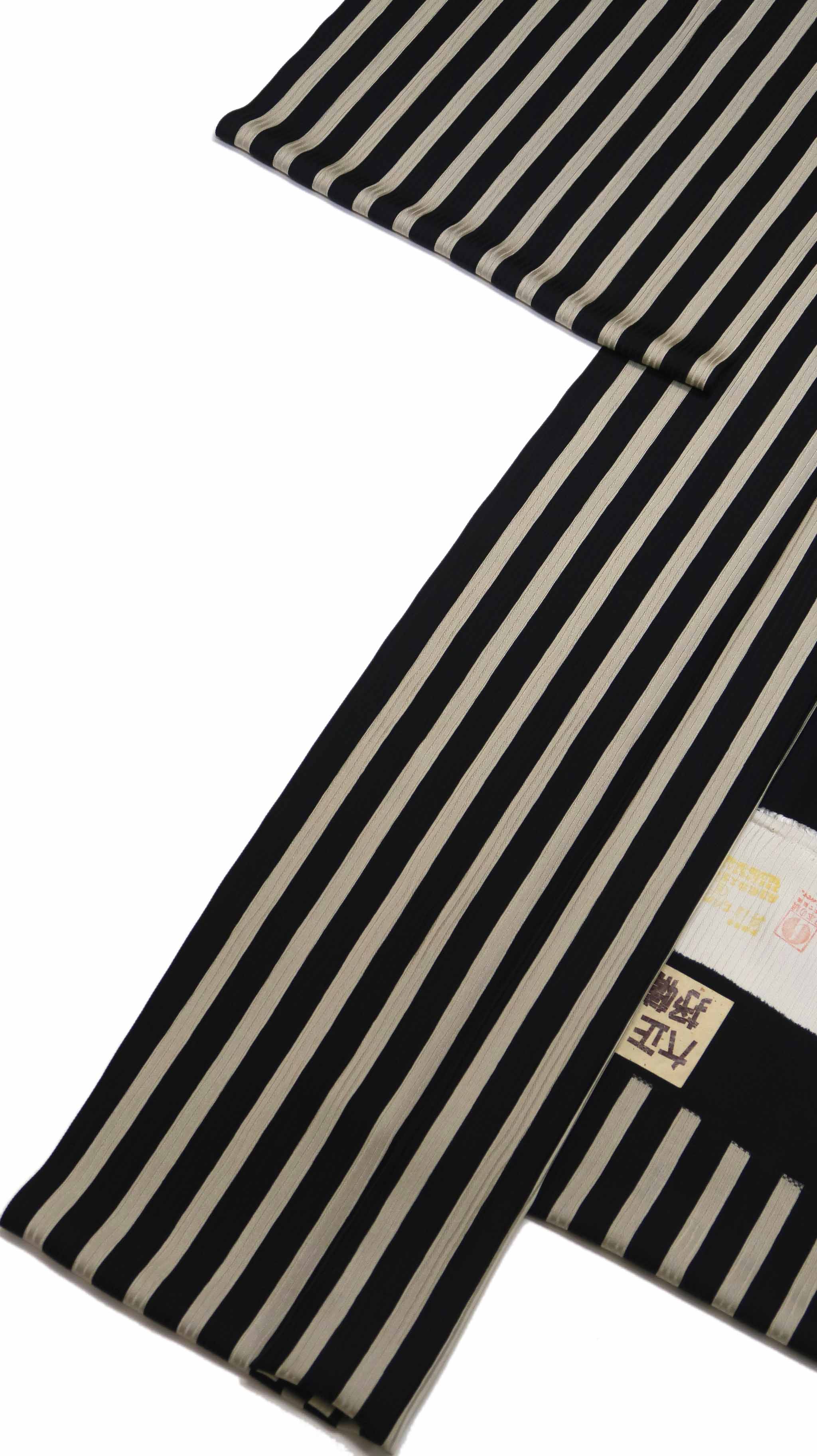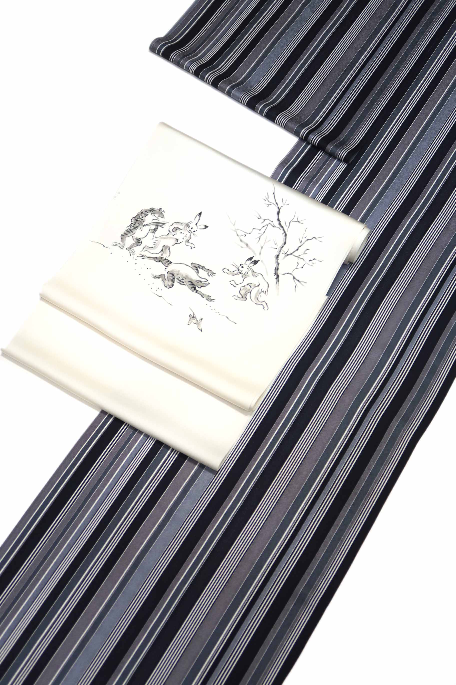 渋い色目の大小縞をランダムに染め上げました。すっきり粋な縞柄ですのでユーモラスな鳥獣戯画の塩瀬の帯を合わせてみました。