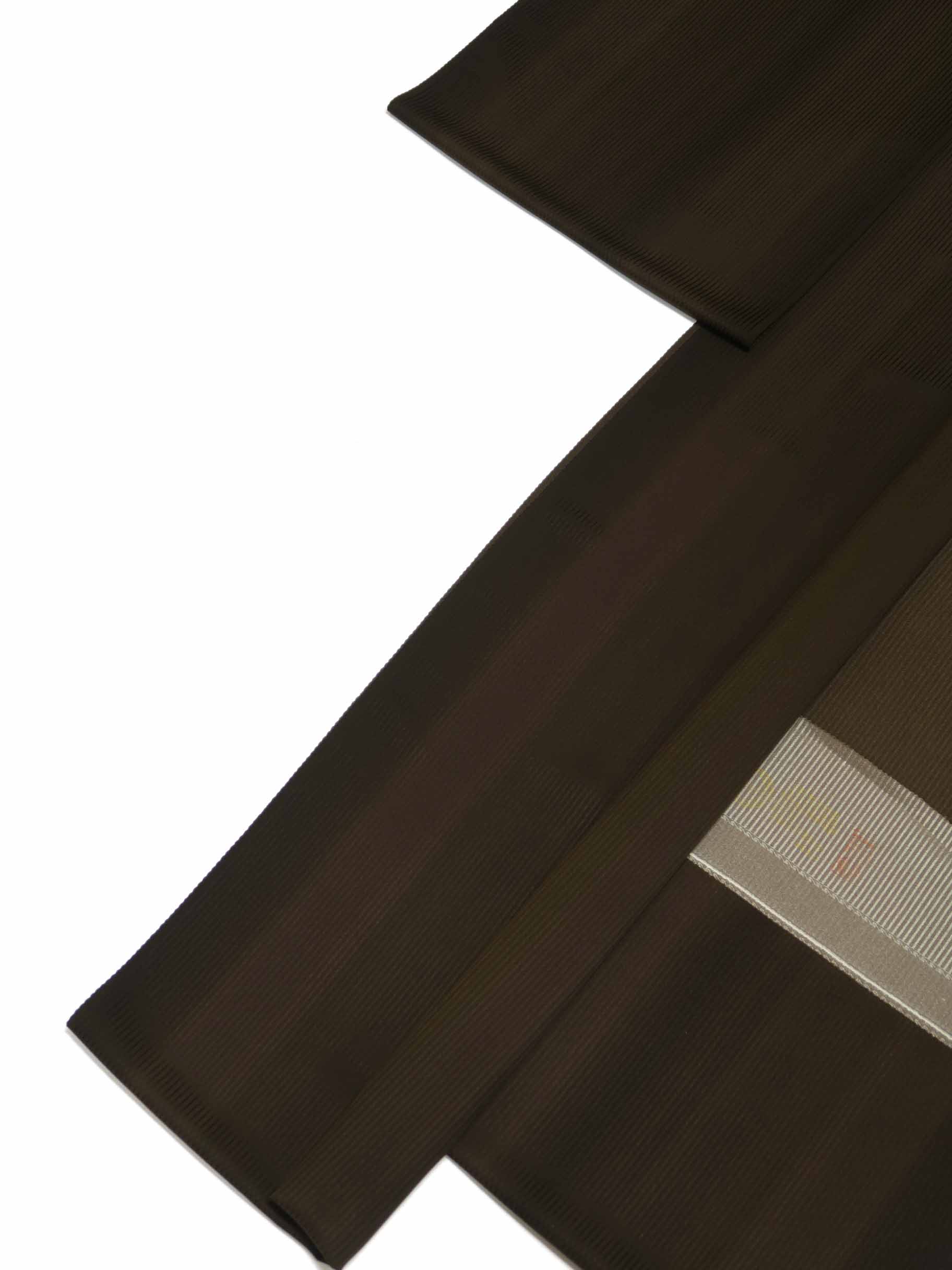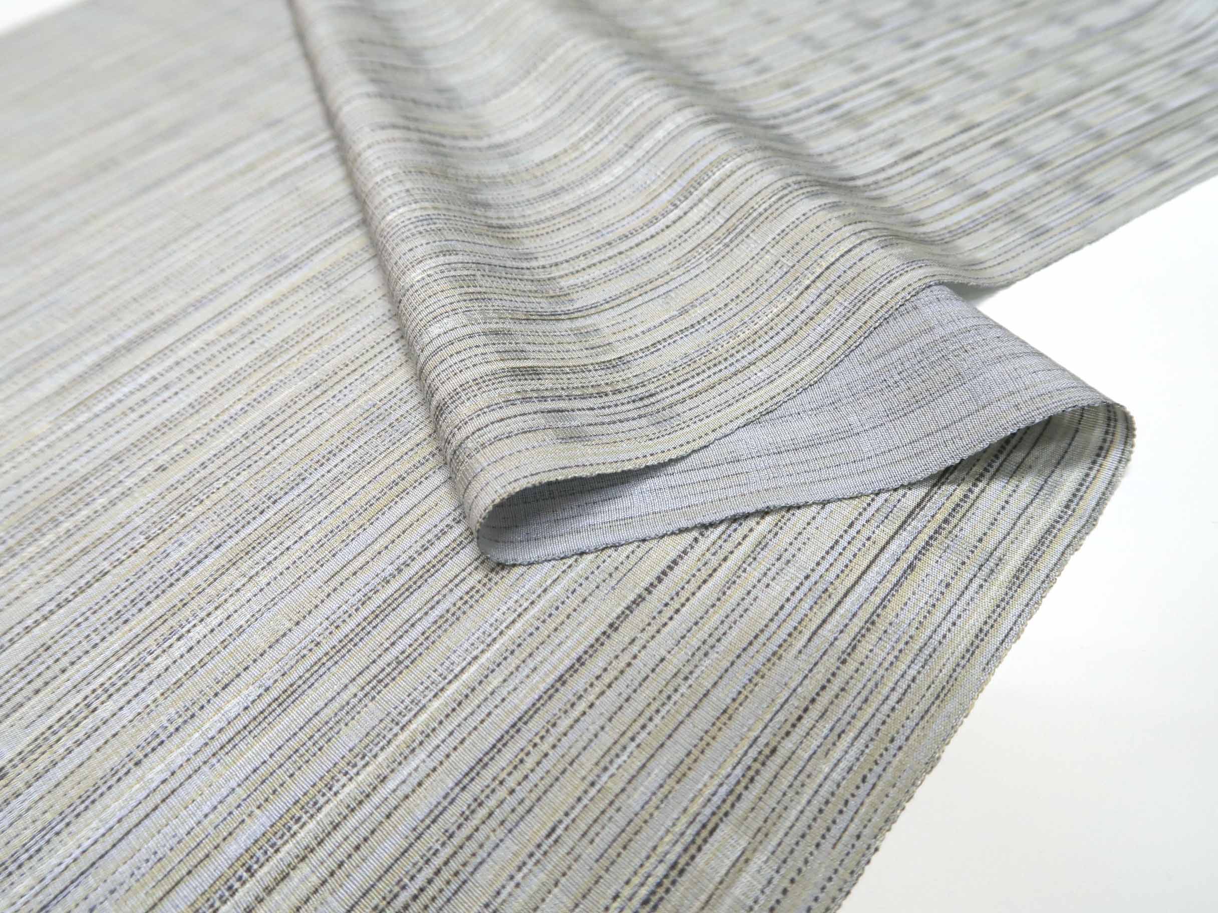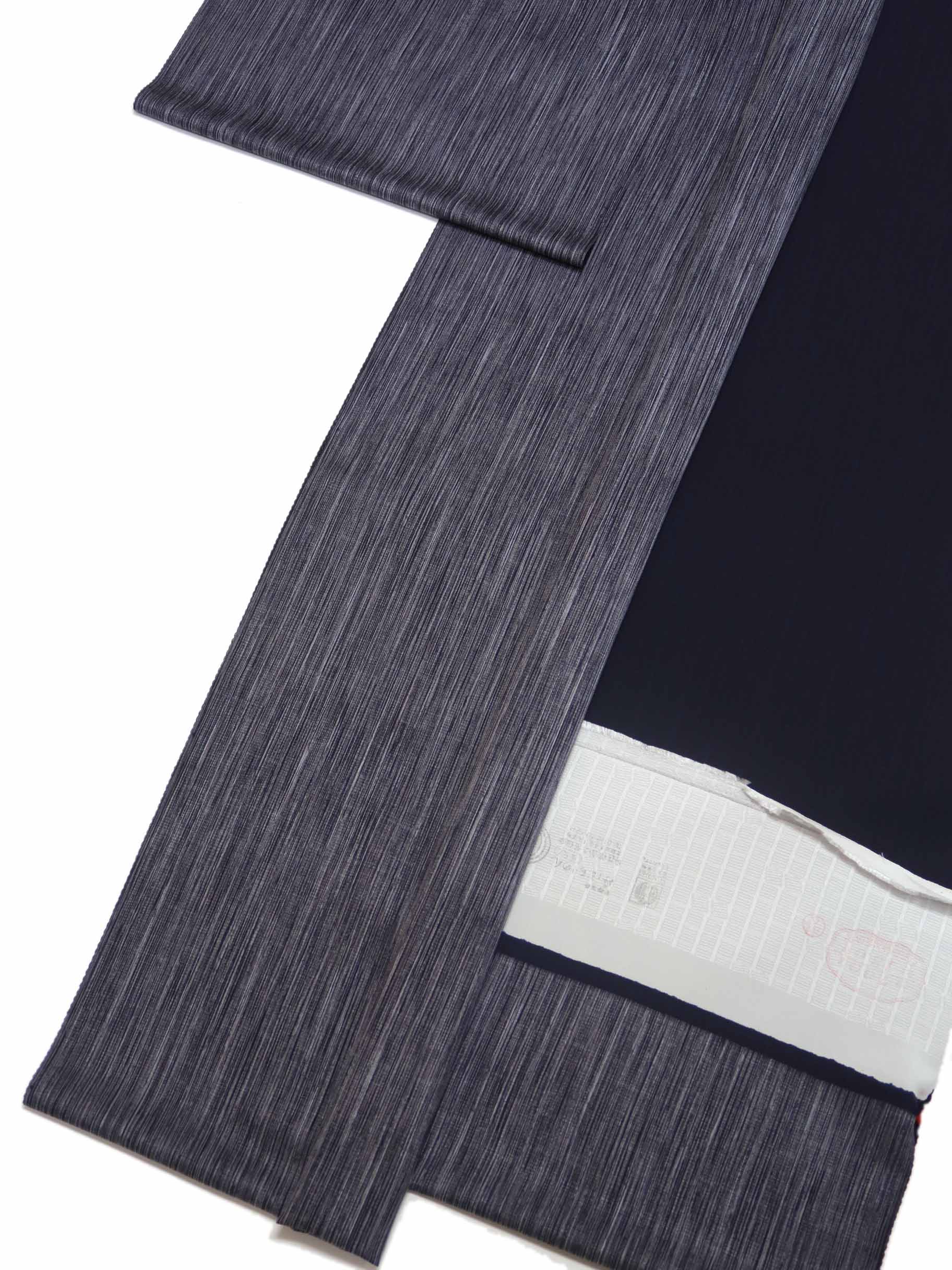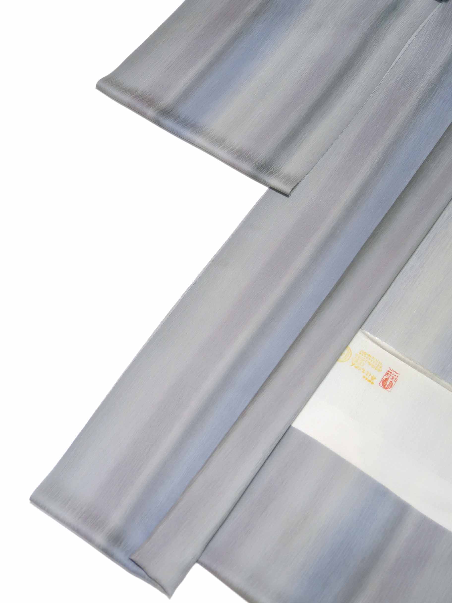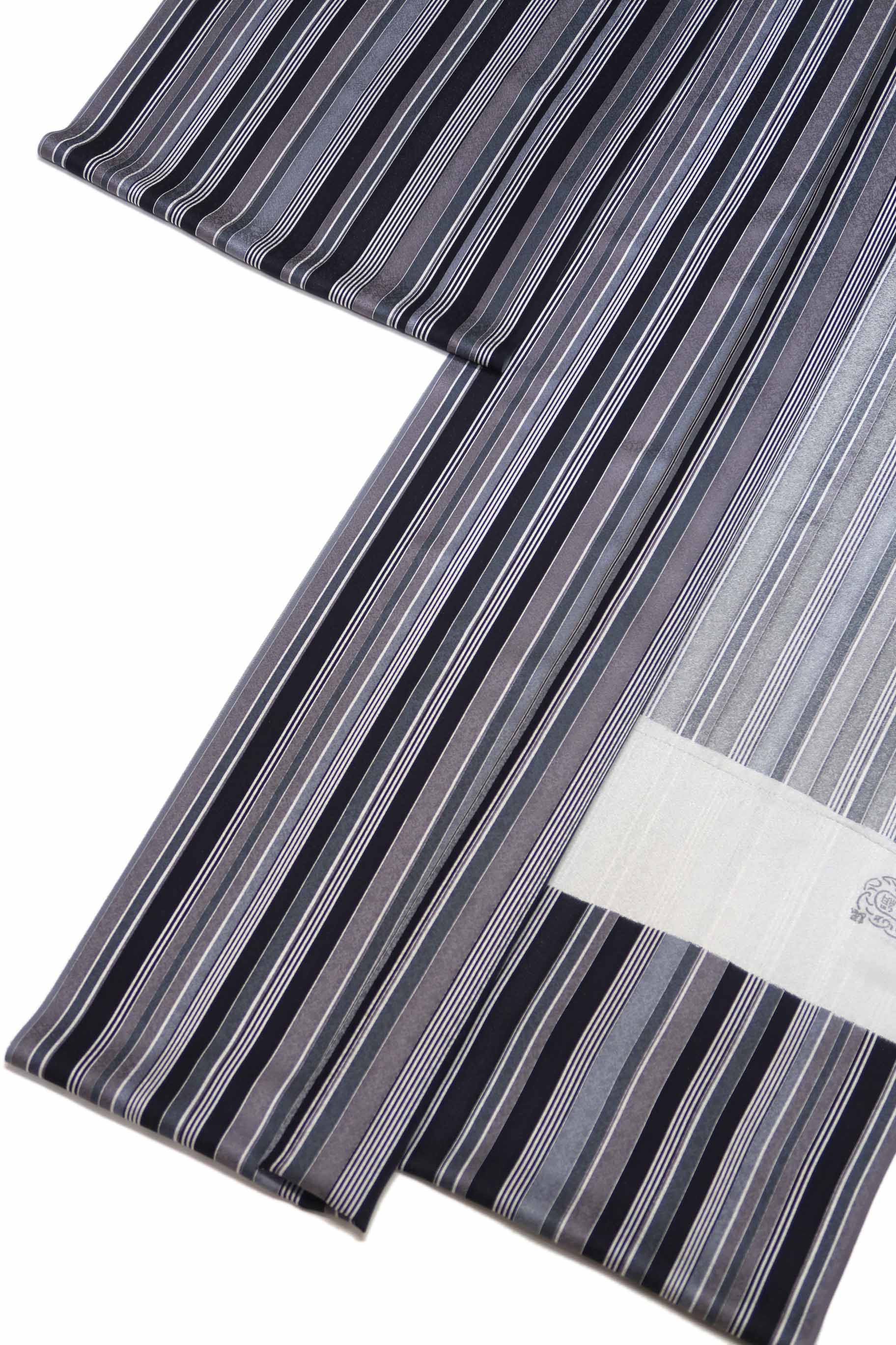 特殊な地紋を織り込んだ高級紋意匠縮緬に、暈し縞だけで染め上げました。微妙なグラデーションは、伝統的な職人芸ならではの作品です。帯次第で、粋にも上品にも、また、洒落っぽくもなるでしょう。