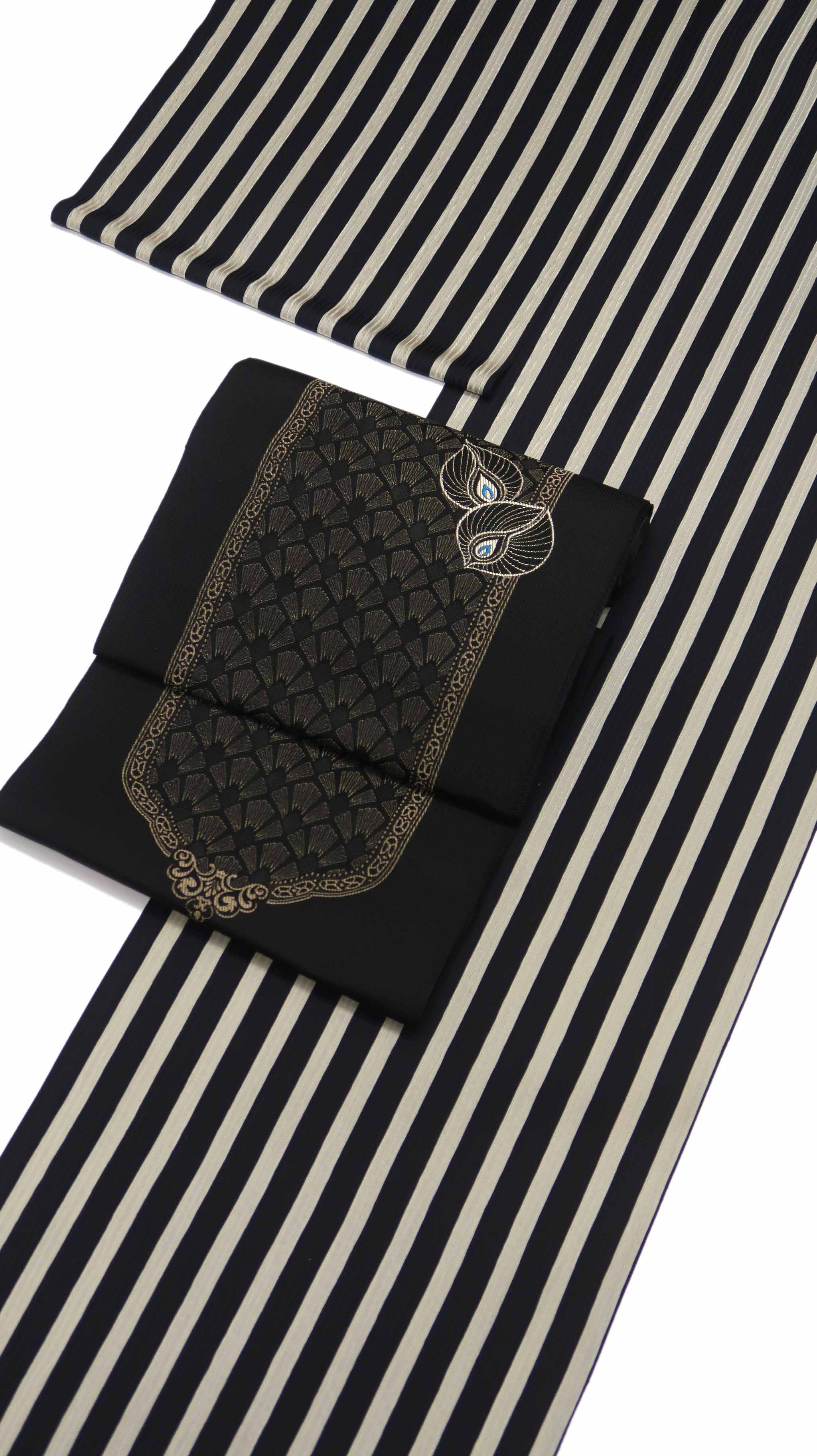 大胆な牛蒡縞は、ともすれば粋になり過ぎ敬遠されがちですが、センスの見せどころです。要は、背景(きもの)と前景(帯)との強弱でバランスをとりますが、羽織なら案外着やすいものです。