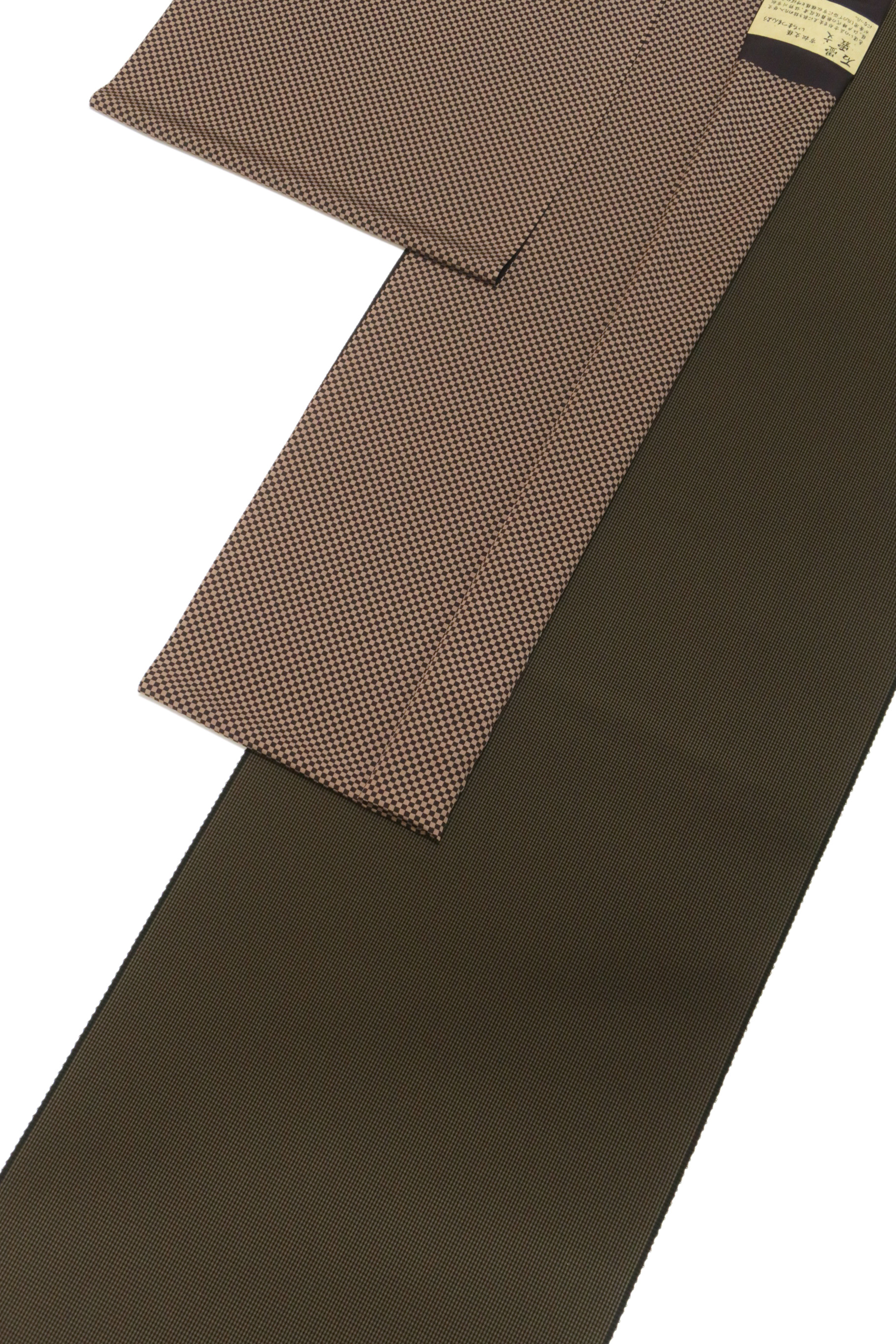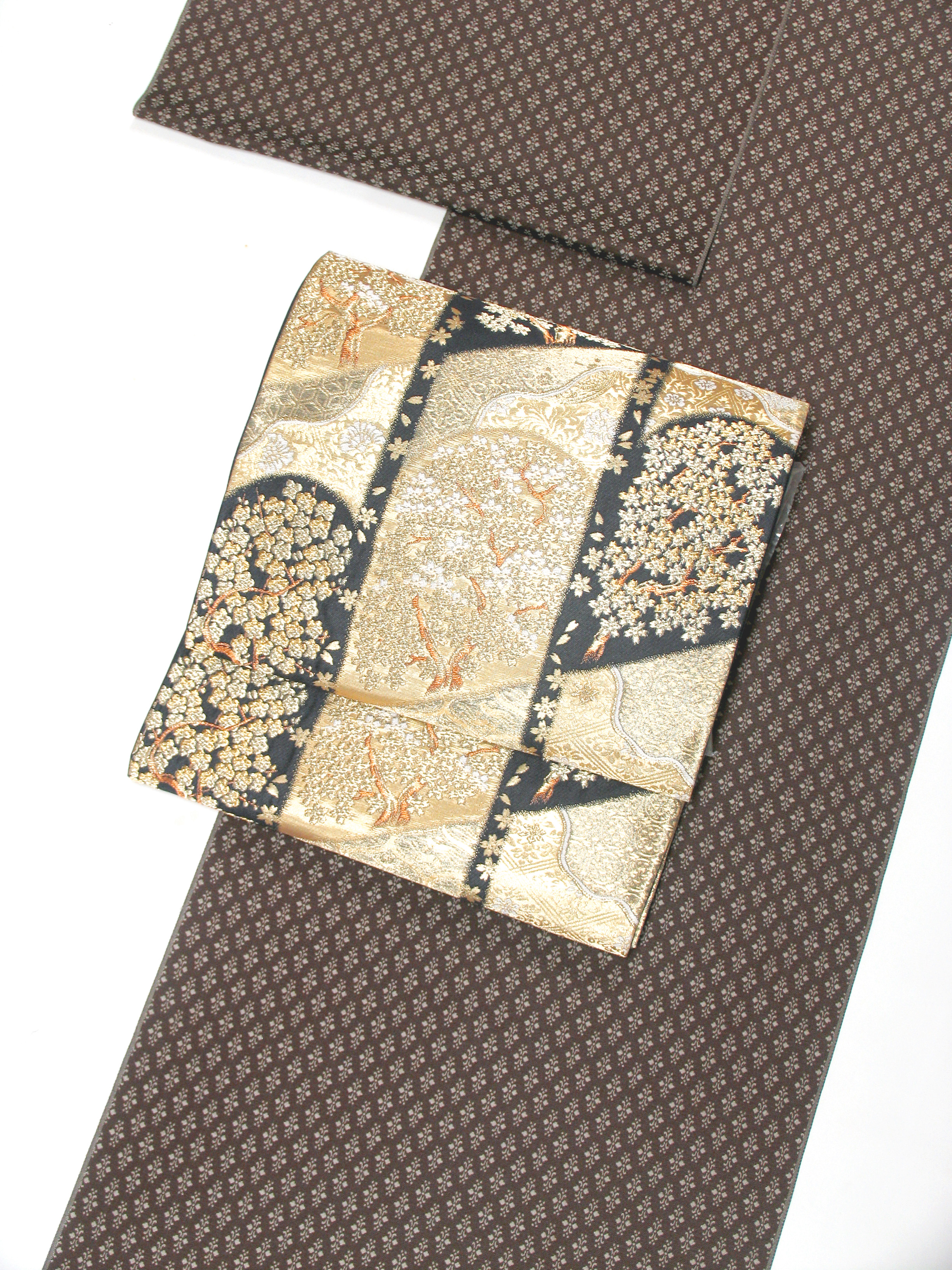 本来は裏地(うらじ)を付けて袷(あわせ)に仕立てますが、最近の暖かい春秋では単衣(ひとえ)で過ごすことが多くなりました。ここでは、西陣織(にしじんおり)の準礼装(じゅんれいそう)用名古屋帯(なごやおび)、京小紋(きょうこもん)の羽織(はおり)を合わせてみました。