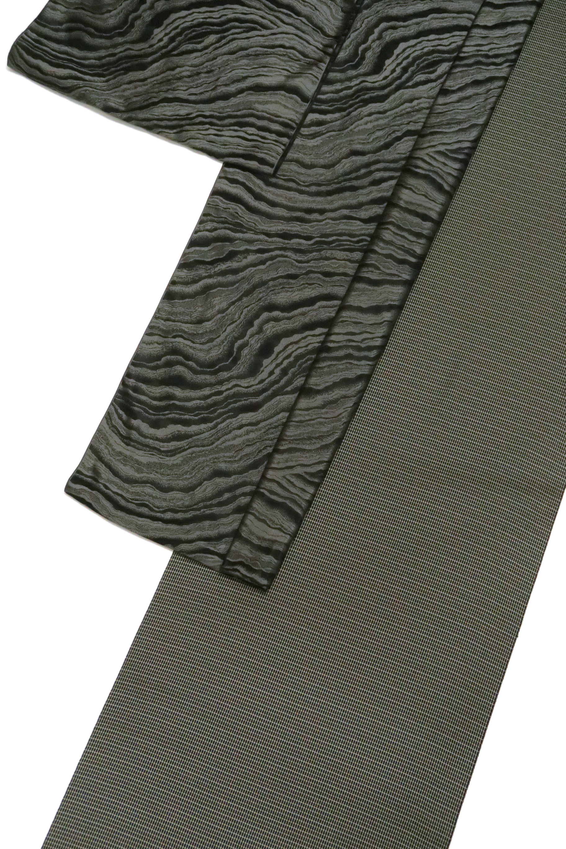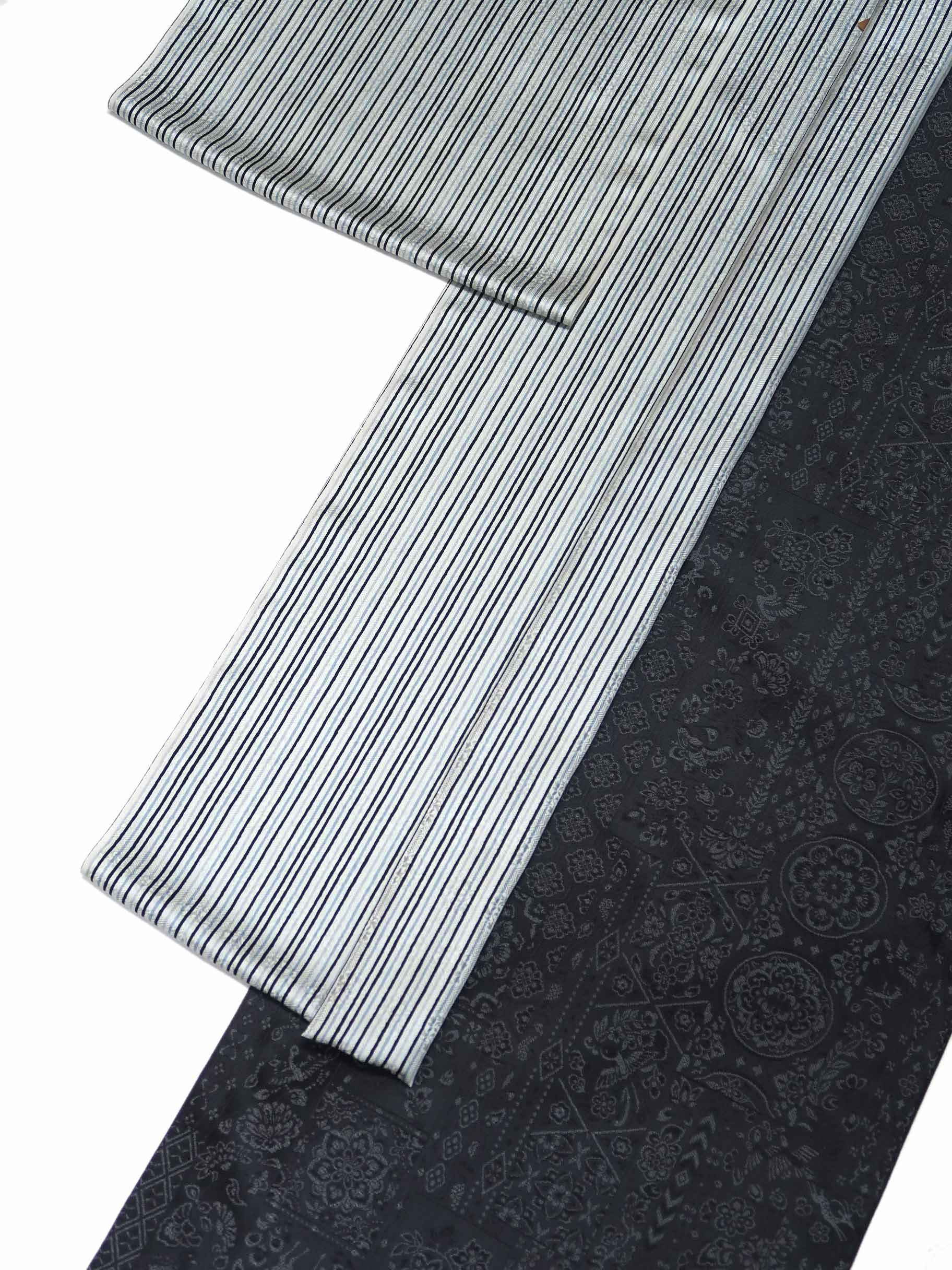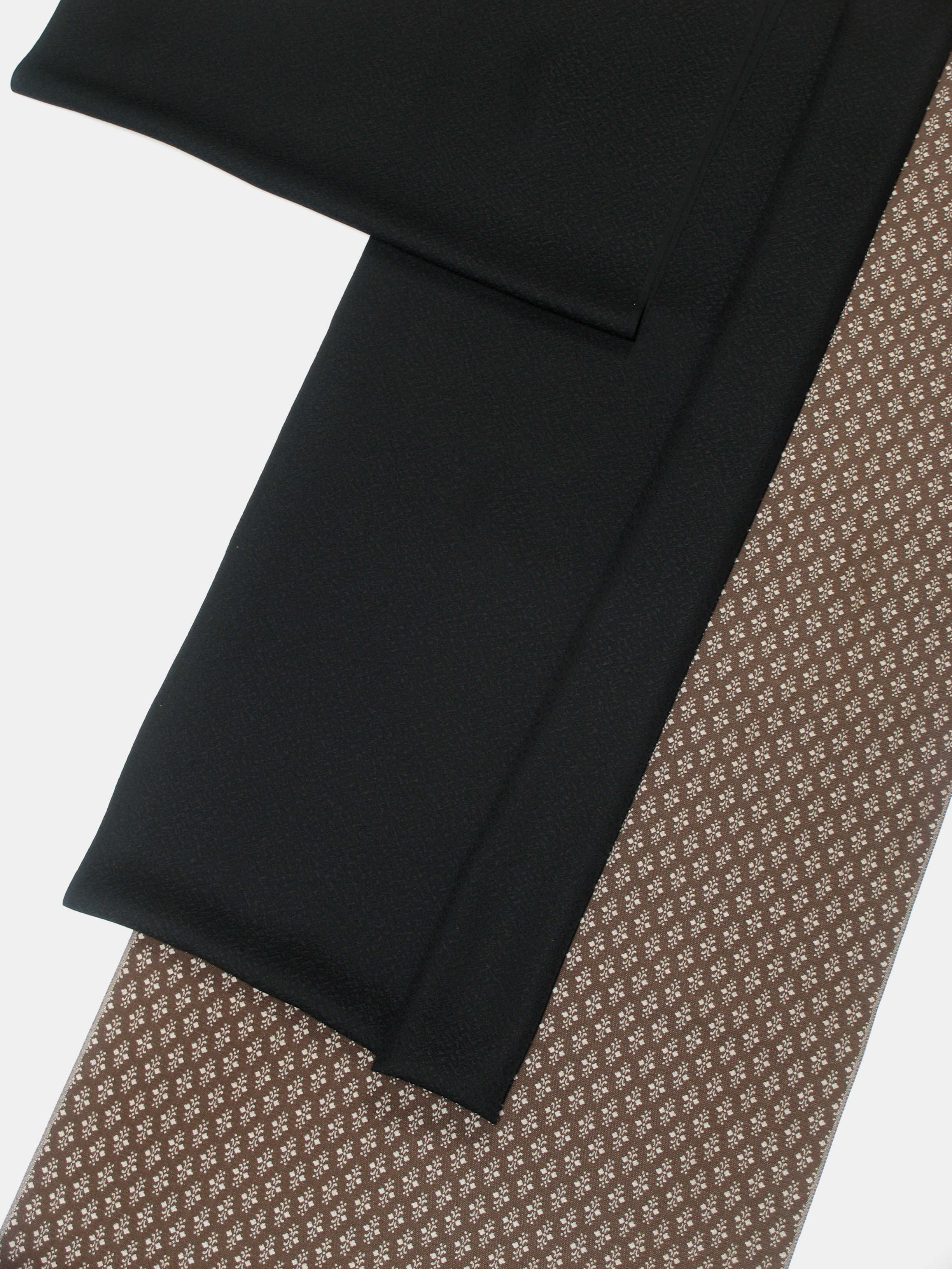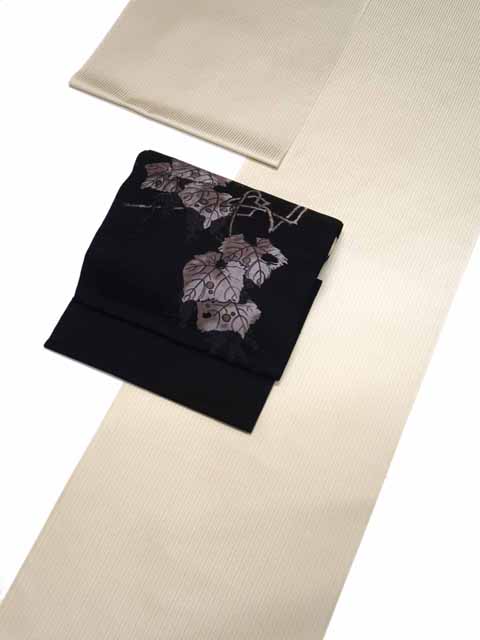 本来は裏地(うらじ)を付けて袷(あわせ)に仕立てますが、最近の暖かい春秋では単衣(ひとえ)で過ごすことが多くなりました。ここでは、西陣織(にしじんおり)のお洒落(しゃれ)用八寸名古屋帯、墨染めの羽織(はおり)を合わせてみました。