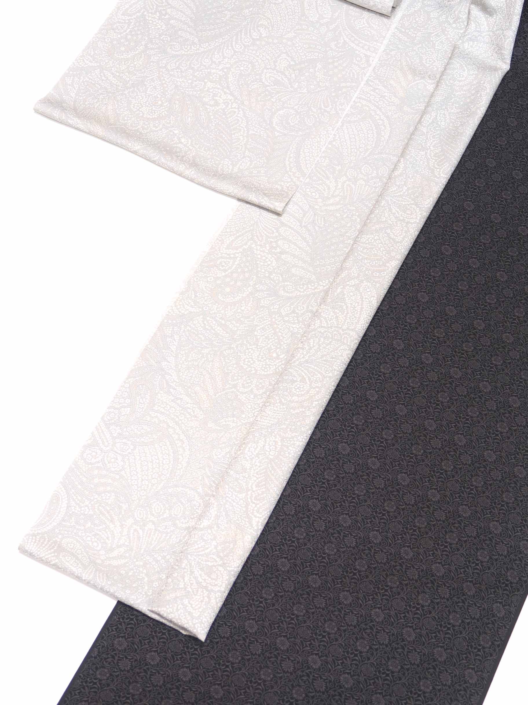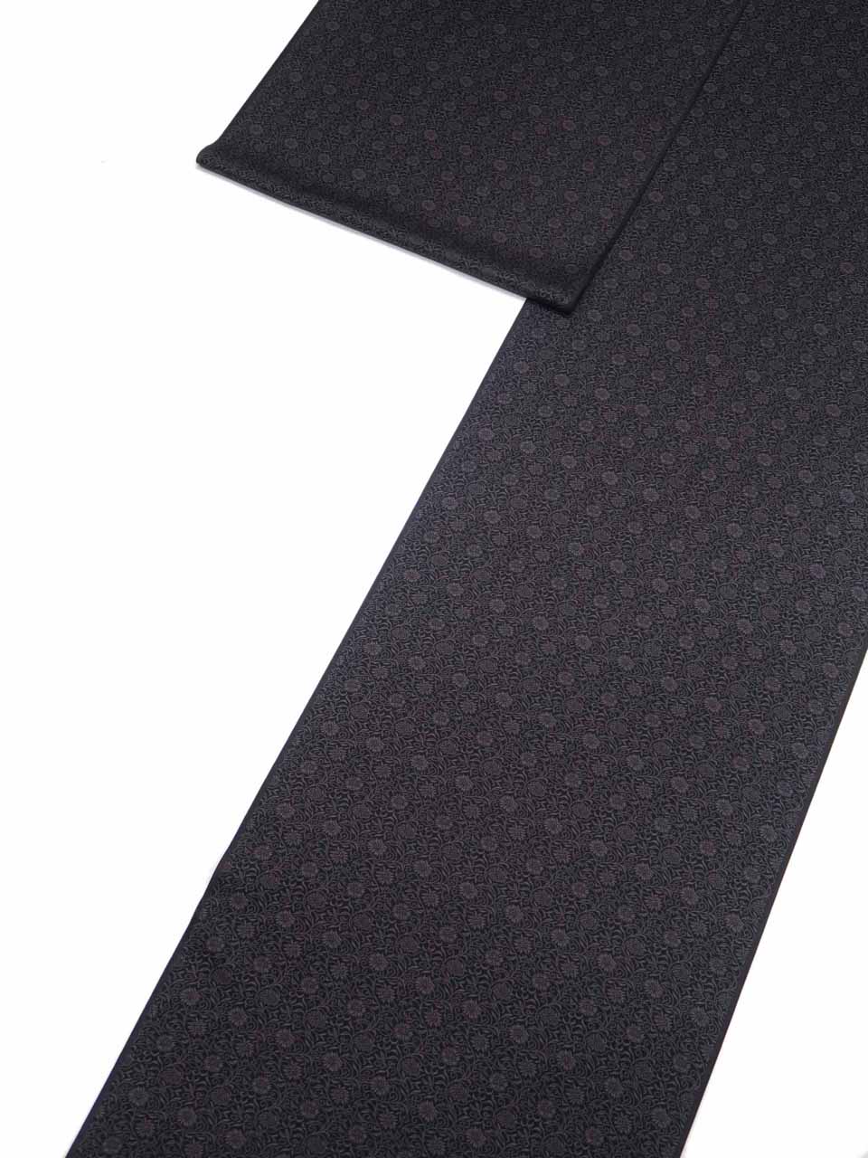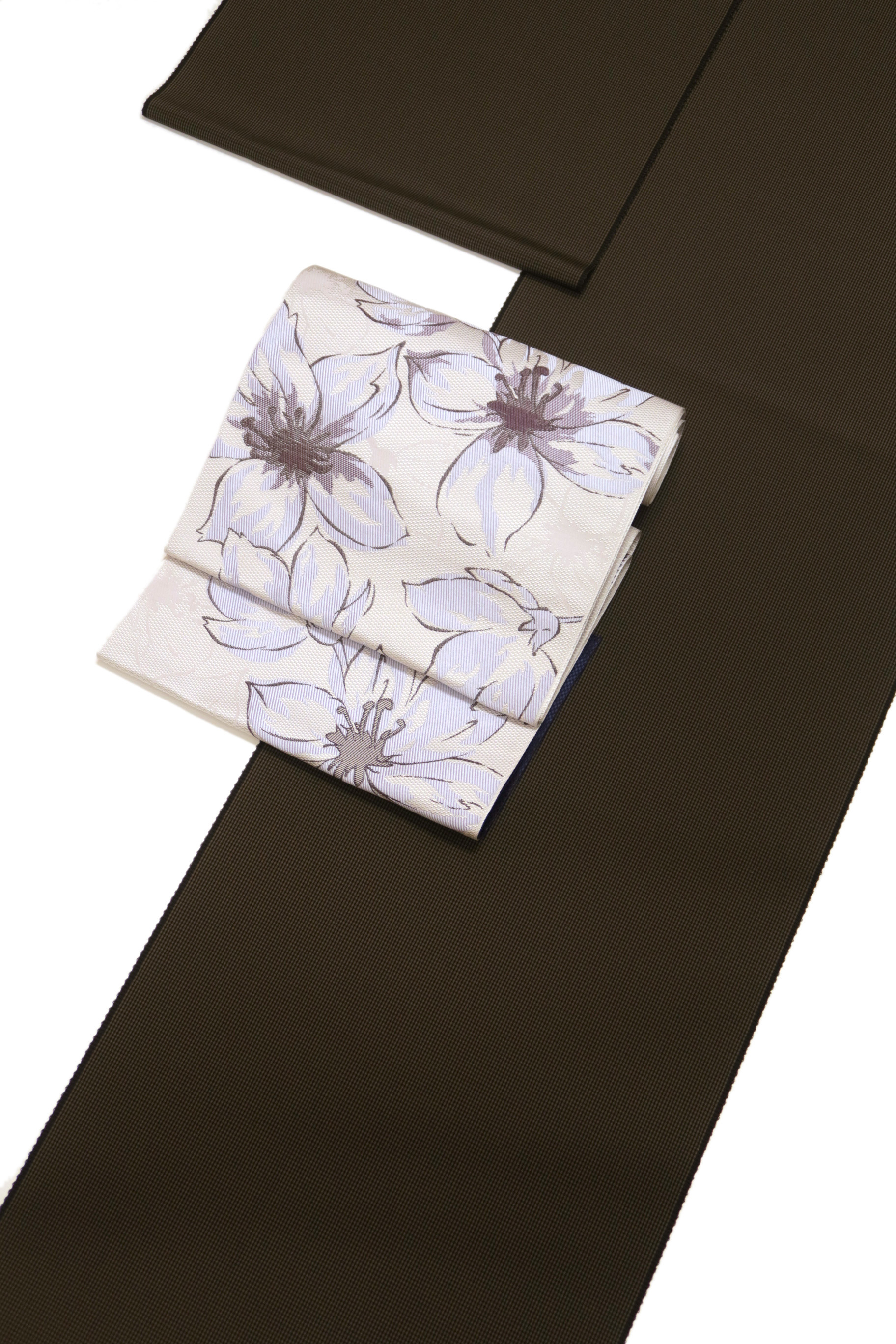 本来は裏地(うらじ)を付けて袷(あわせ)に仕立てますが、最近の暖かい春秋では単衣(ひとえ)で過ごすことが多くなりました。ここでは、西陣織(にしじんおり)のお洒落(しゃれ)用八寸名古屋帯、墨染めの羽織(はおり)を合わせてみました。