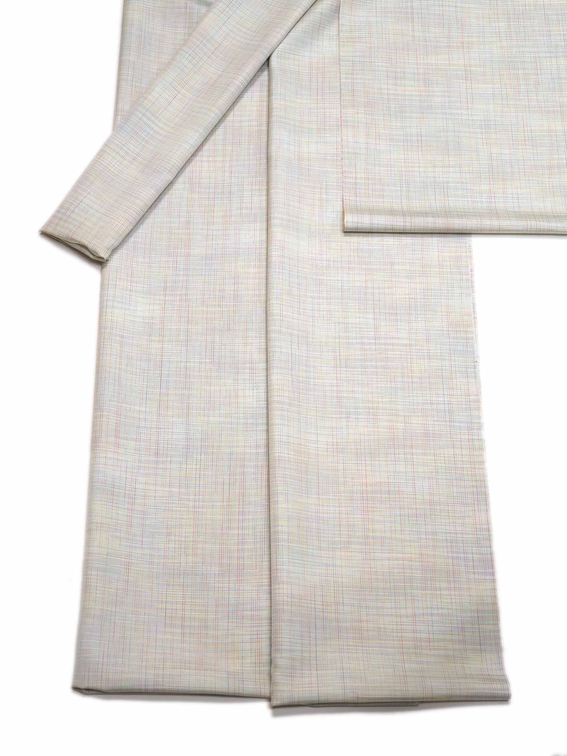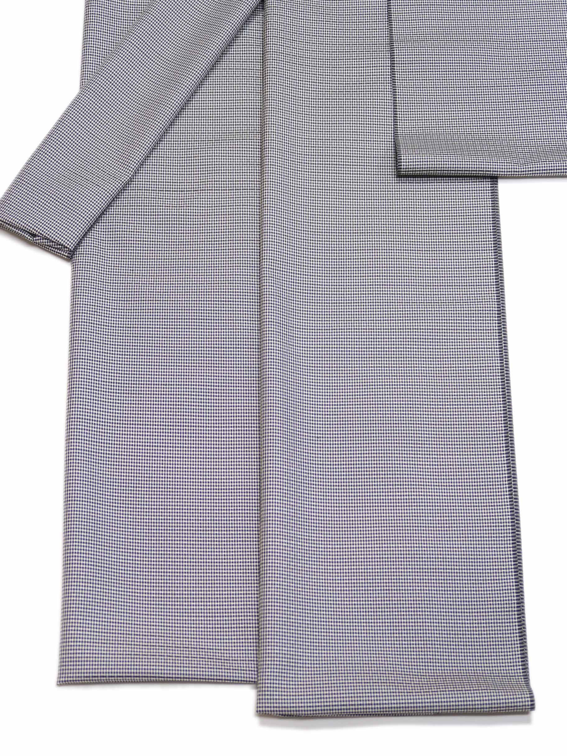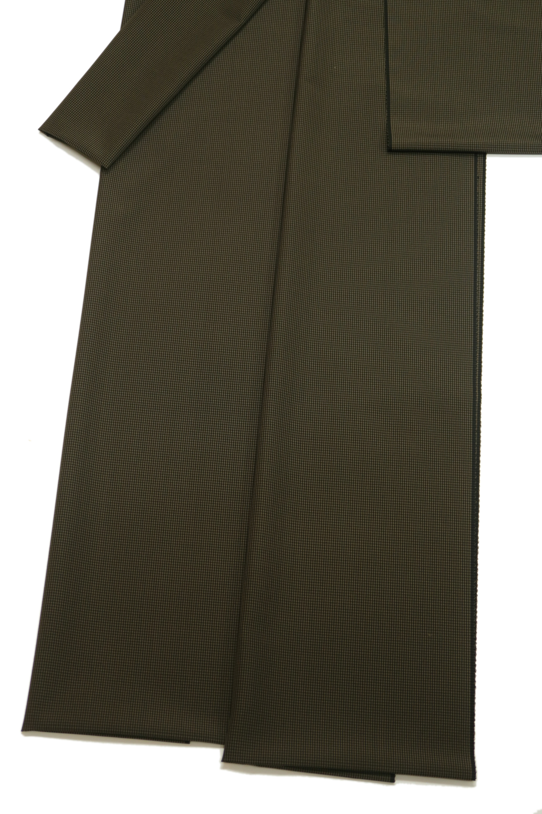 おとなしく上品(じょうひん)に織り上げられた本格派の「紋(もん)お召(め)し」です。お召しは「先染(さきぞ)め先練(さきね)り」ですから色糸(いろいと)はすべて糸の段階で文様を織り上げる前に染められます。遠目(とおめ)では色無地(いろむじ)に見えますが、その豪華(ごうか)な重厚感(じゅうこうかん)と軽くて丈夫(じょうぶ)な着心地(きごこち)は、お召しならではの味わいです。