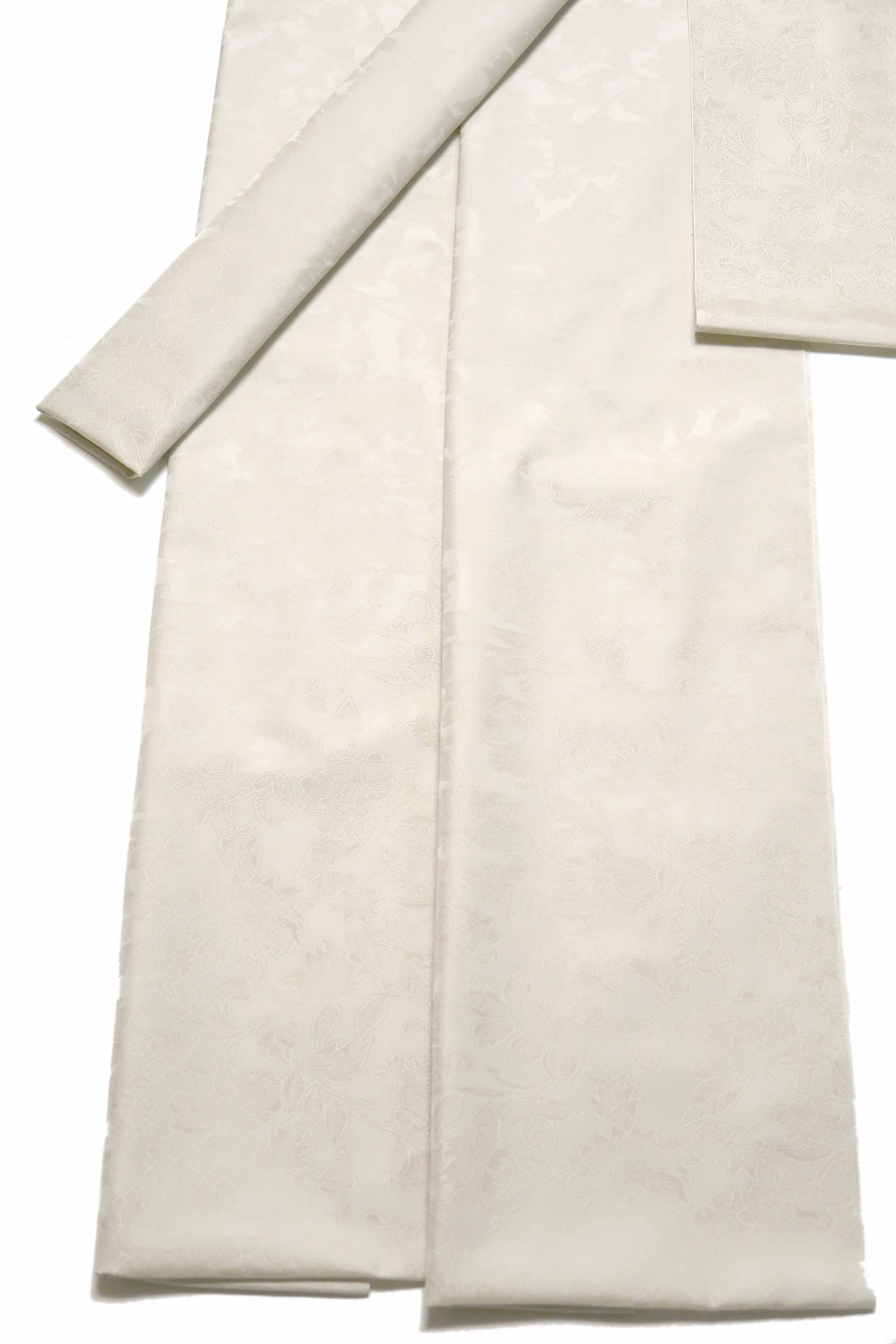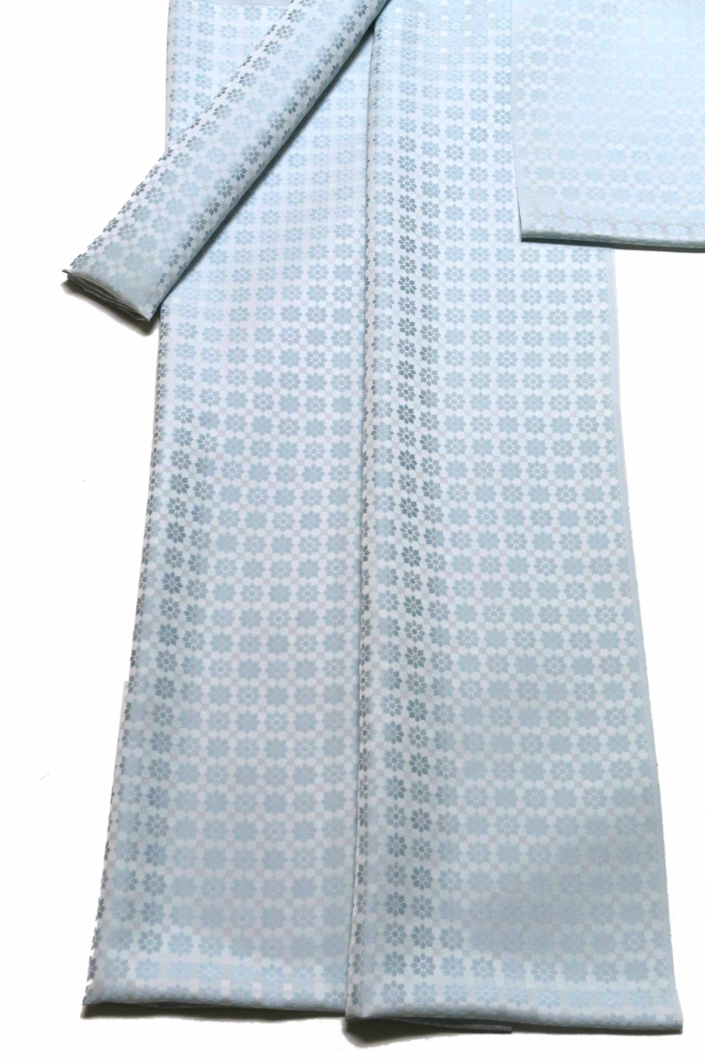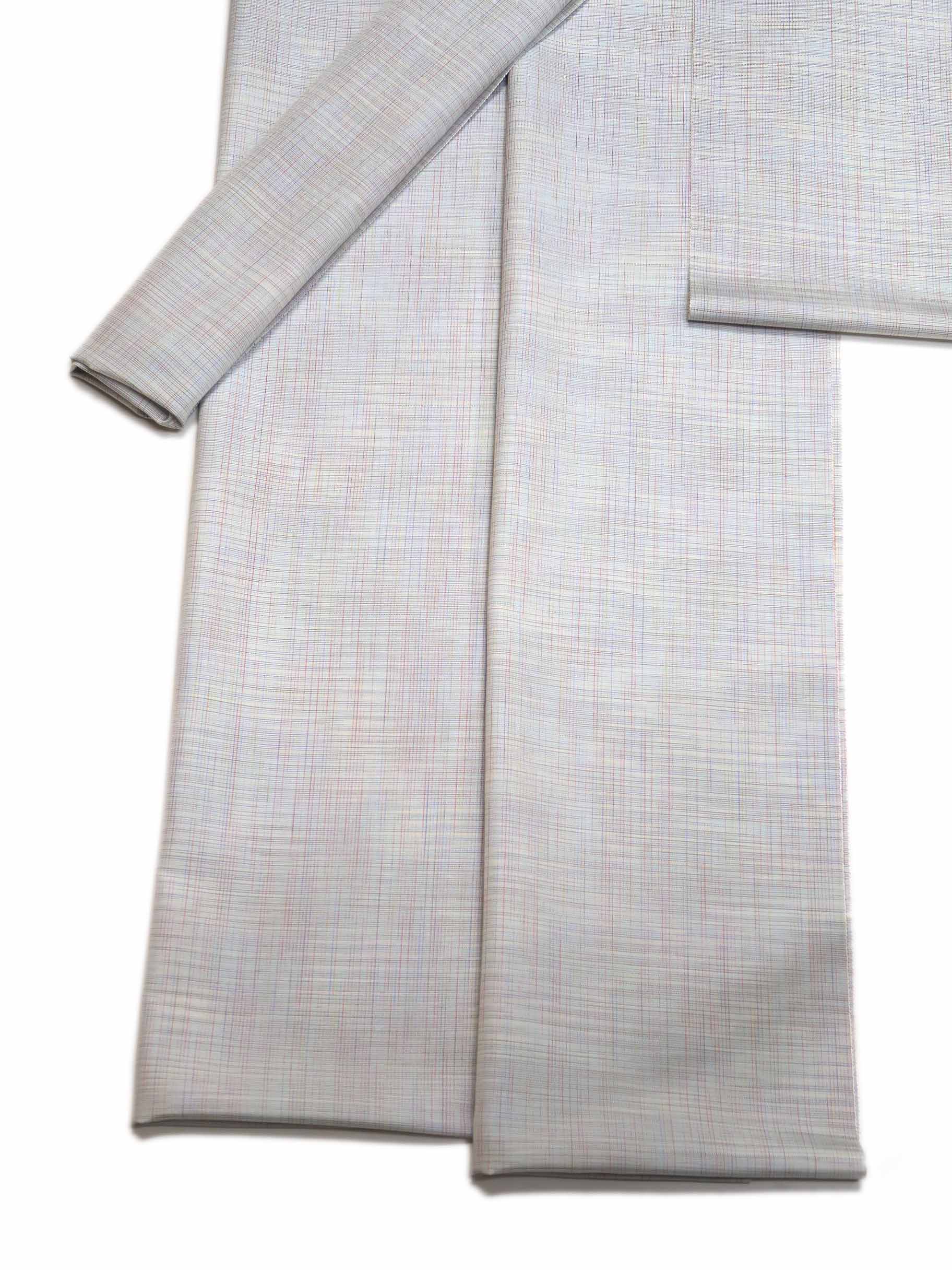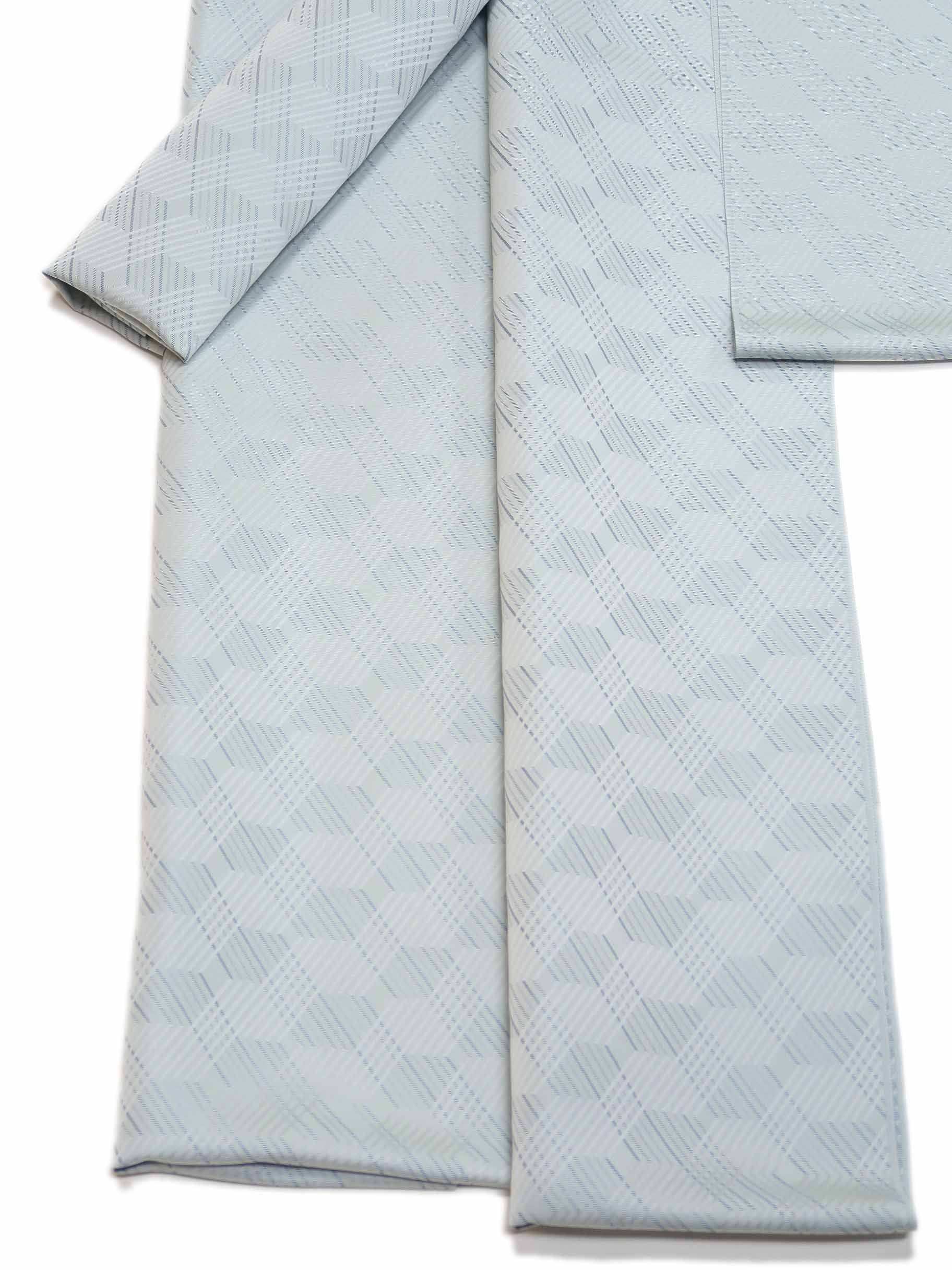 おとなしく上品(じょうひん)に織り上げられた本格派の「紋(もん)お召(め)し」です。お召しは「先染(さきぞ)め先練(さきね)り」ですから色糸(いろいと)はすべて糸の段階で文様を織り上げる前に染められます。遠目(とおめ)では色無地(いろむじ)に見えますが、その豪華(ごうか)な重厚感(じゅうこうかん)と軽くて丈夫(じょうぶ)な着心地(きごこち)は、お召しならではの味わいです。