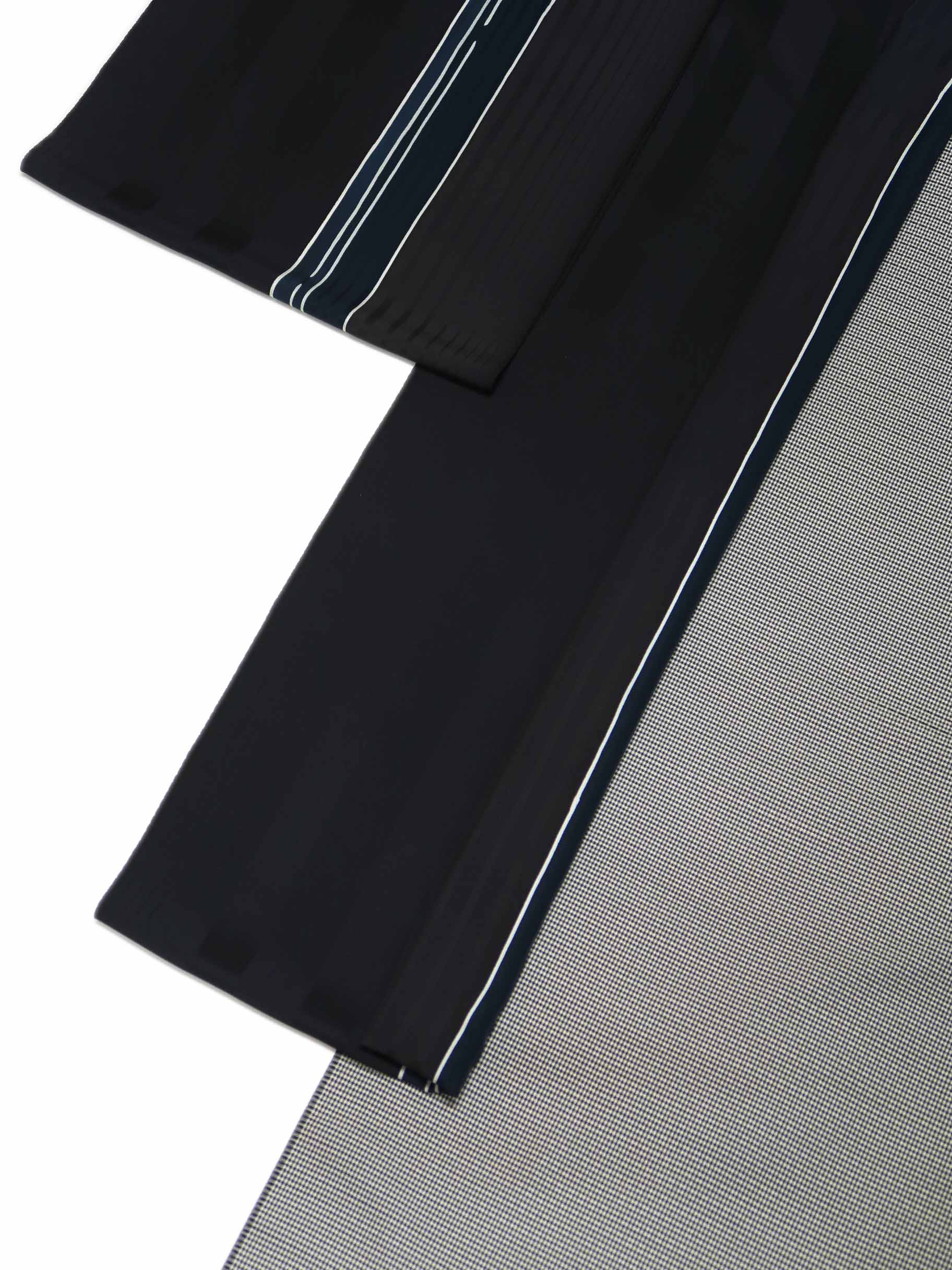 帯は、落ち着いて上品な雰囲気を壊(こわ)さないよう艶消(つやけ)しで渋め目の唐織(からおり)紋紗(もんしゃ)。羽織は、濃い藍紫の地色に源氏香(げんじこう)の飛()とび柄(がら)を格調(かくちょう)高く合わせてみました。