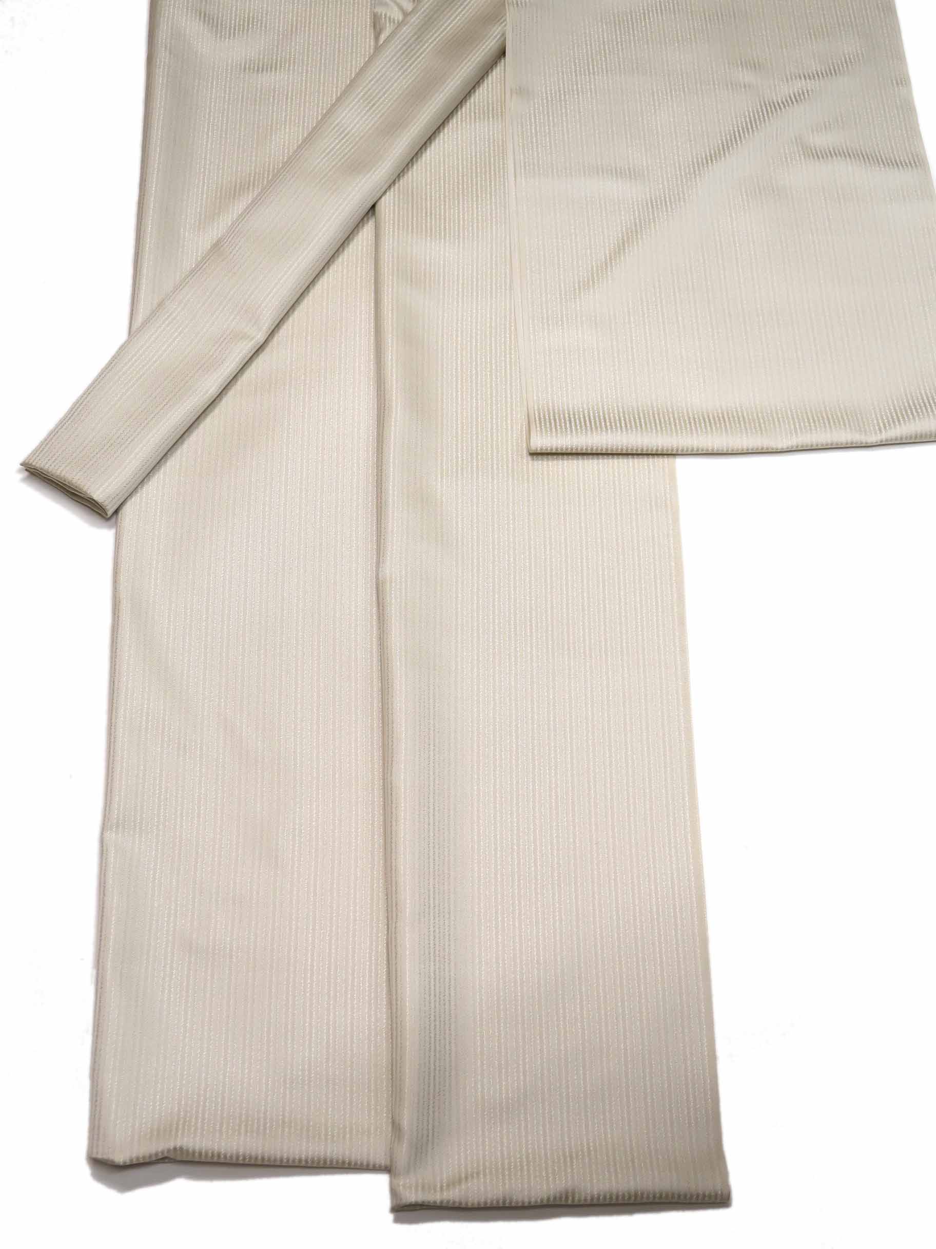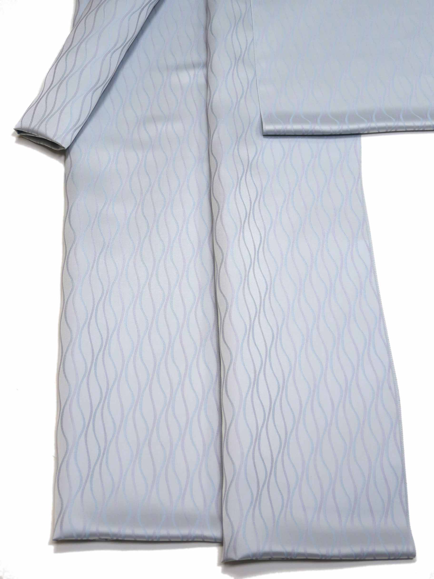 本来は裏地(うらじ)を付けて袷(あわせ)に仕立てますが、最近の暖かい春秋では単衣(ひとえ)で過ごすことが多くなりました。ここでは、西陣織(にしじんおり)のお洒落(しゃれ)用八寸名古屋帯、斜め縞暈(ぼか)しの羽織(はおり)を合わせてみました。