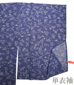 無双とは、無二、無類。天下無双と言われるように並ぶものがないほど優れていることですが、きもの用語では表裏が同じ生地・布で仕立てることを意味します。つまり、裏地が付いた袷に縫われた袖。一方、単衣袖とは文字通り、袷に対して裏地のない袖ということになります。