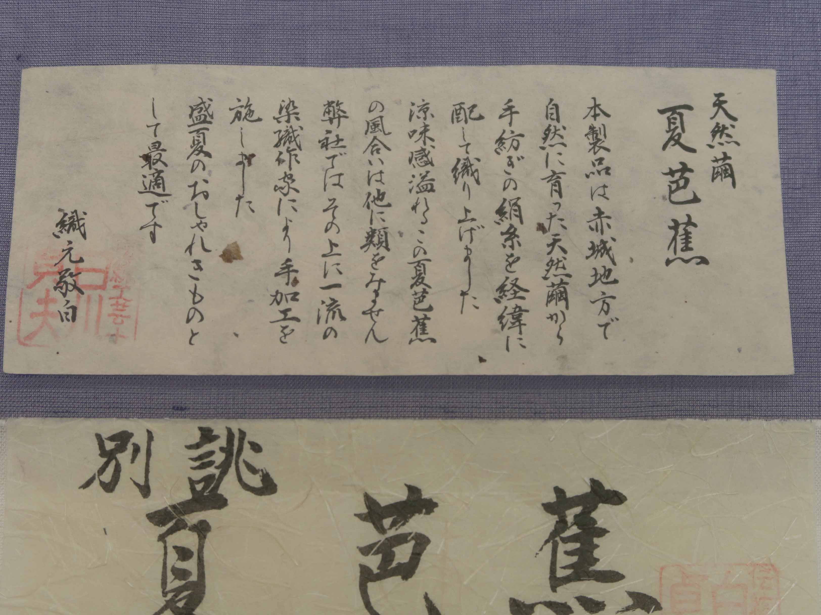 芭蕉布は、本来、イトバショウから採れる繊維で織られた織物ですが、絹芭蕉は、その良き風情と清涼感を継承し、軽くてしなやかな絹で織り上げた夏のきものです。Washable加工の効果を最も発揮する夏の着物のひとつとなりました。
